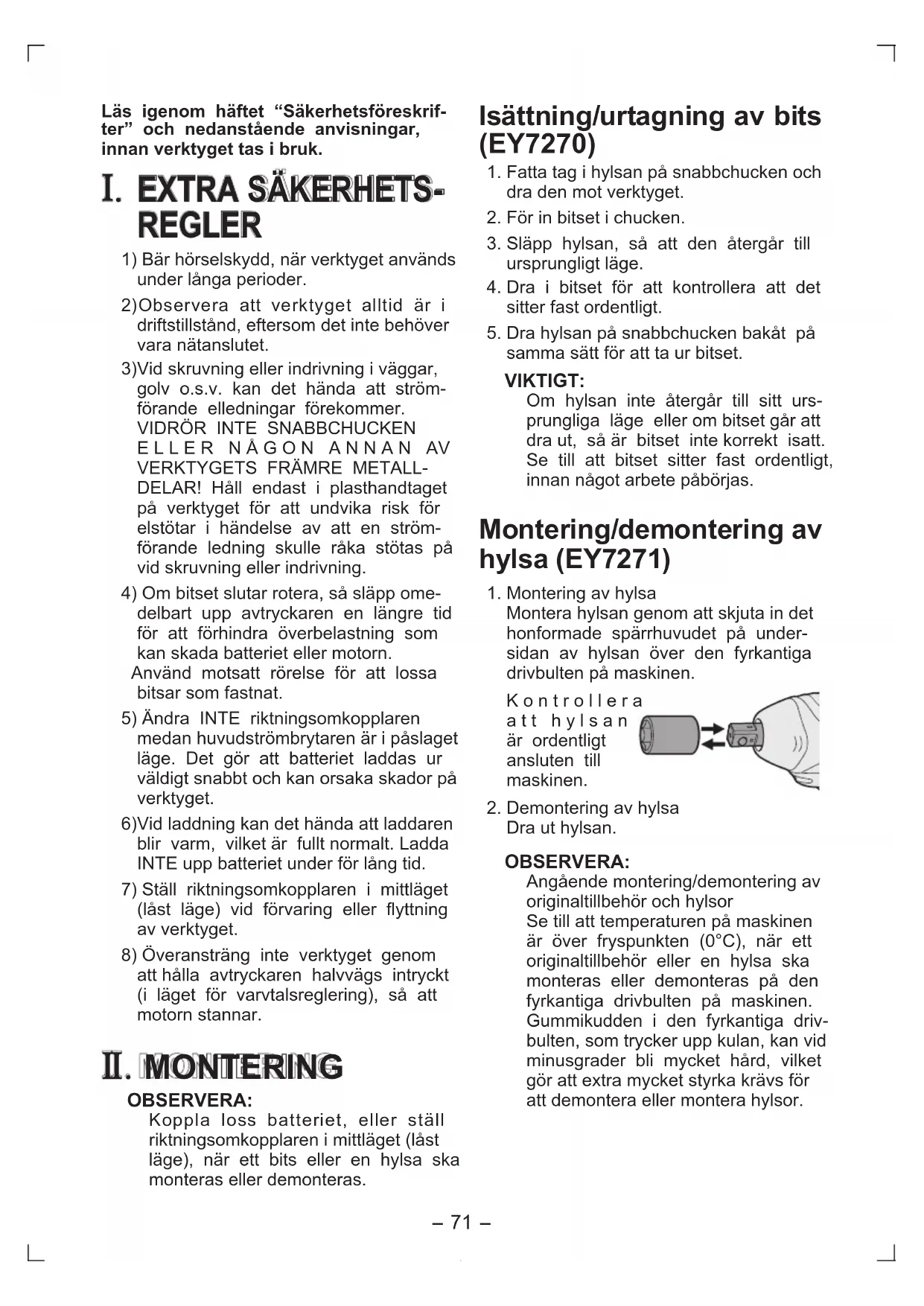 . MONTERING OBSERVERA: Koppla loss batteriet, eller ställ riktningsomkopplaren i mittläget (låst läge), när ett bits eller en hylsa ska monteras eller demonteras. Isättning/urtagning av bits (EY7270) 1. Fatta tag i hylsan på snabbchucken och dra den mot verktyget.2. För in bitset i chucken.3. Släpp hylsan, så att den återgår till ursprungligt läge.4. Dra i bitset för att kontrollera att det sitter fast ordentligt.5. Dra hylsan på snabbchucken bakåt på samma sätt för att ta ur bitset.VIKTIGT:Om hylsan inte återgår till sitt urs-prungliga läge eller om bitset går att dra ut, så är bitset inte korrekt isatt. Se till att bitset sitter fast ordentligt, innan något arbete påbörjas. Montering/demontering av hylsa (EY7271) 1. Montering av hylsa Montera hylsan genom att skjuta in det honformade spärrhuvudet på under-sidan av hylsan över den fyrkantiga drivbulten på maskinen. K o n t r o l l e r a a t t h y l s a n är ordentligt ansluten till maskinen.2. Demontering av hylsaDra ut hylsan.OBSERVERA:Angående montering/demontering av originaltillbehör och hylsorSe till att temperaturen på maskinen är över fryspunkten (0°C), när ett originaltillbehör eller en hylsa ska monteras eller demonteras på den fyrkantiga drivbulten på maskinen. Gummikudden i den fyrkantiga driv-bulten, som trycker upp kulan, kan vid minusgrader bli mycket hård, vilket gör att extra mycket styrka krävs för att demontera eller montera hylsor. EY7270(EU).indb 71 2006/05/25 13:26:38-