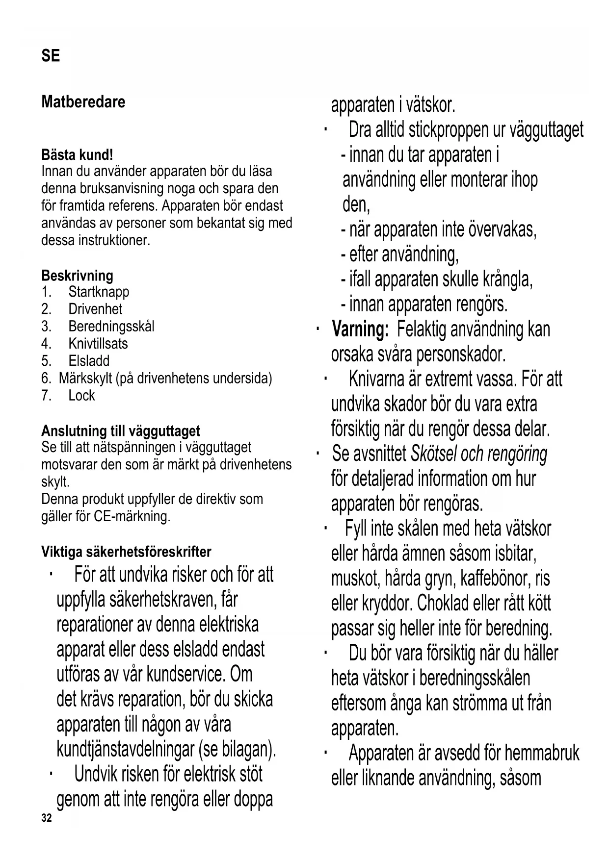 Anslutning till vägguttaget Se till att nätspänningen i vägguttaget motsvarar den som är märkt på drivenhetens skylt. Denna produkt uppfyller de direktiv som gäller för CE-märkning. Viktiga säkerhetsföreskrifter ∙ För att undvika risker och för att uppfylla säkerhetskraven, får reparationer av denna elektriska apparat eller dess elsladd endast utföras av vår kundservice. Om det krävs reparation, bör du skicka apparaten till någon av våra kundtjänstavdelningar (se bilagan). ∙ Undvik risken för elektrisk stöt genom att inte rengöra eller doppa apparaten i vätskor. ∙ Dra alltid stickproppen ur vägguttaget - innan du tar apparaten i användning eller monterar ihop den, - när apparaten inte övervakas, - efter användning, - ifall apparaten skulle krångla, - innan apparaten rengörs. ∙ Varning: Felaktig användning kan orsaka svåra personskador. ∙ Knivarna är extremt vassa. För att undvika skador bör du vara extra försiktig när du rengör dessa delar. ∙ Se avsnittet Skötsel och rengöring för detaljerad information om hur apparaten bör rengöras. ∙ Fyll inte skålen med heta vätskor eller hårda ämnen såsom isbitar, muskot, hårda gryn, kaffebönor, ris eller kryddor. Choklad eller rått kött passar sig heller inte för beredning. ∙ Du bör vara försiktig när du häller heta vätskor i beredningsskålen eftersom ånga kan strömma ut från apparaten. ∙ Apparaten är avsedd för hemmabruk eller liknande användning, såsom SE33 - i personalkök, kontor och andra kommersiella miljöer, - i företag inom jordbrukssektorn, - för gäster i hotell, motell och liknande inkvarteringsställen, - för gäster i bed-and-breakfast hus. ∙ Denna apparat kan användas av personer som har minskad fysisk rörelseförmåga, reducerat sinnes- eller mentalt illstånd, eller som har bristfällig erfarenhet och kunskap, förutsatt att dessa personer är under uppsyn eller har fått tillräckliga instruktioner beträffande apparatens användning och vet vilka risker och säkerhetsåtgärder som användningen innefattar. ∙ Barn får inte använda denna apparat. Apparaten och dess elsladd bör ställas utom räckhåll för barn. ∙ Barn bör inte tillåtas leka med apparaten. ∙ Varning: Håll barn på avstånd från apparatens förpackningsmaterial eftersom fara eventuellt kan uppstå. Det fi nns t.ex. risk för kvävning. ∙ Innan varje användning bör apparaten samt dess elsladd och monterade tillbehör inspekteras noga så att de inte har några skador. Om apparaten t ex har tappats på en hård yta, eller om elsladden har utsatts för alltför hård kraft, bör den inte längre användas: Även osynliga skador kan försämra apparatens driftsäkerhet. ∙ Låt inte apparaten eller elsladden komma i kontakt med heta ytor eller heta källor. ∙ När du har stängt av apparaten bör du alltid vänta tills motorn har stannat fullständigt innan du tar bort drivenheten från beredningsskålen. Vidrör inte de rörliga delarna. ∙ Starta inte apparaten då beredningsskålen är tom. ∙ Om apparaten använts felaktigt eller om bruksanvisningen inte följts, kan inga krav ställas mot leverantören eller försäljaren. Innan första användningen Innan apparaten används för första gången, bör alla delar rengöras noggrant enligt avsnittet Skötsel och rengöring. Korttidsanvändning Apparaten har konstruerats för att användas högst 10 sekunder utan avbrott. Därefter bör den låtas svalna i cirka 1 minut. Säkerhetsbrytare Denna apparat är utrustad med två säkerhetsbrytare. Apparaten kan bara kopplas på om locket är ordentligt på plats och drivenheten ordentligt monterad ovanpå beredningsskålen. Användning ∙ Sätt fast kniven innan du fyller skålen med mat som skall hackas. Var ytterst försiktig: kniven är mycket vass. När du handskas med kniven bör du hålla den i det skyddande plasthöljet. ∙ Placera locket på beredningsskålen; se till att knivenhetens axel sticker ut genom34 lockets öppning. ∙ Montera drivenheten på skålen. ∙ Sätt stickproppen i vägguttaget och tryck in startknappen i korta intervaller tills blandningen har uppnått önskad konsistens. ∙ Undvik att fylla skålen för mycket: det maximala fyllningssmärket bör inte överstigas. Innan skålen fylls bör maten som skall beredas skäras i 1 cm stora bitar. ∙ Efter beredningen bör du alltid dra stickproppen ur vägguttaget innan du tar bort drivenheten och locket. Kniven måste alltid tas bort innan den beredda maten kan tas ur skålen. ∙ När du bereder olika slags mat efter varandra bör du kontrollera att knivens behållaren i botten av skålen är fri från matrester innan du monterar på enheten igen. Recept Produkt Mängd Förberedelse Tid Salami 130 g 1 x 1 x 1 cm stora tärningar 2 x 5 sek. Torkad frukt 130 g 2 x 8 sek. Ost (Gouda, ung) 120 g 1 x 1 x 1 cm stora tärningar 3 x 6 sek. Morötter 100 g 1 cm tjocka skivor 3 x 5 sek. Skötsel och rengöring ∙ Innan du rengör apparaten bör du dra stickproppen ur vägguttaget. ∙ För att undvika elektriska stötar bör du inte tvätta drivenheten och elsladden med vätskor eller doppa dem i vätskor. Drivenheten kan torkas av med en lätt fuktad, luddfri trasa. ∙ Använd inte slipmedel, starka rengöringsmedel eller vassa föremål vid rengöring. ∙ Varning: knivens egg är extremt vassa. ∙ Skålen och locket kan rengöras med varmt vatten och ett milt diskmedel. Avfallshantering Enheter märkta med denna symbol måste kasseras separat från hushållsavfallet, eftersom de innehåller värdefulla material som kan återvinnas. Korrekt avfallshantering skyddar miljön och människors hälsa. Din lokala myndighet eller återförsäljare kan ge information i ärendet. Garanti i Sverige och Finland För material- och tillverkningsfel gäller 2 års garanti räknat från inköpsdagen mot uppvisande av specifi cerat inköpskvitto i överensstämmelse med de allmänna garantivillkore