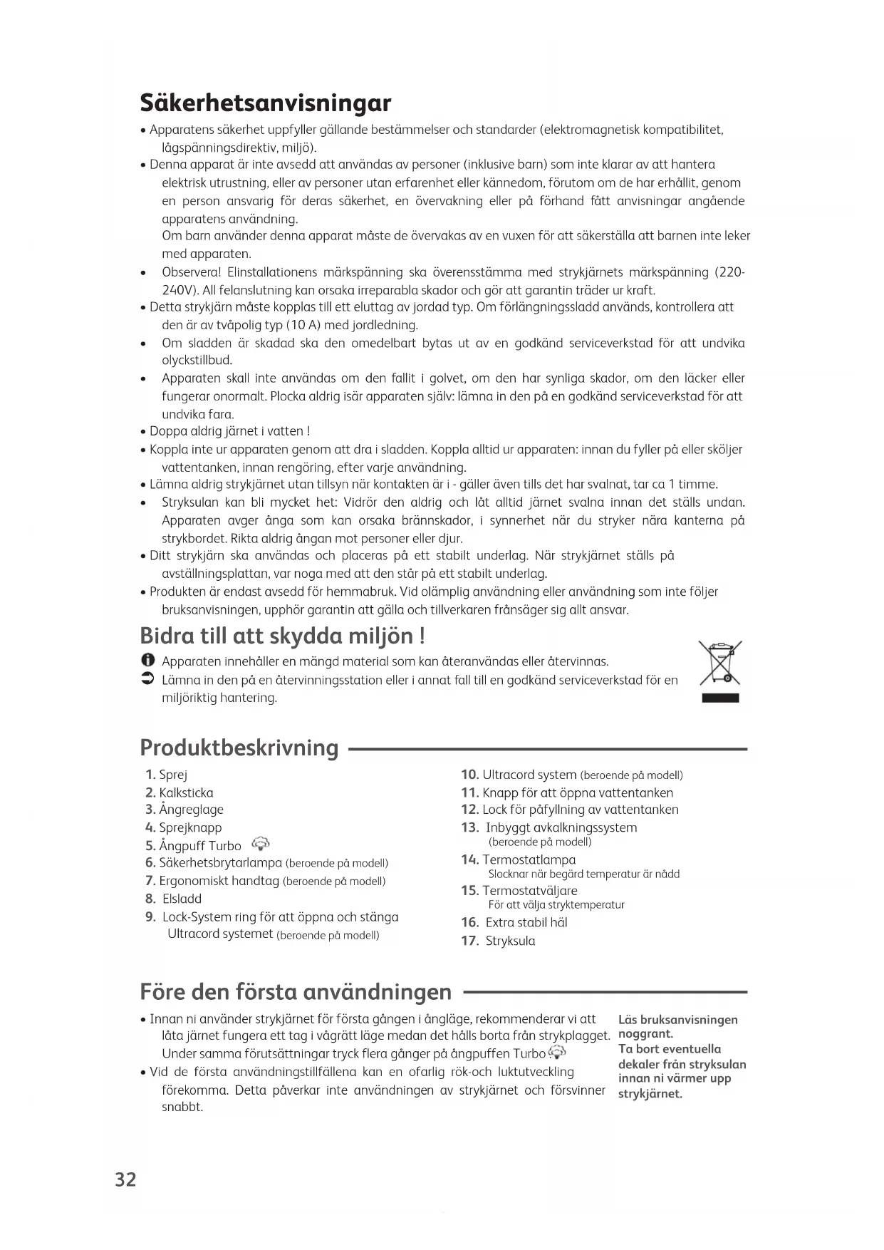 - Vid de första användningstillfällena kan en ofarlig rök-och luktutveckling förekomma. Detta påverkar inte användningen av strykjärnet och försvinner snabbt. Läs bruksanvisningennoggrant.Ta bort eventuelladekaler från stryksulaninnan ni värmer uppstrykjärnet. Säkerhetsanvisningar