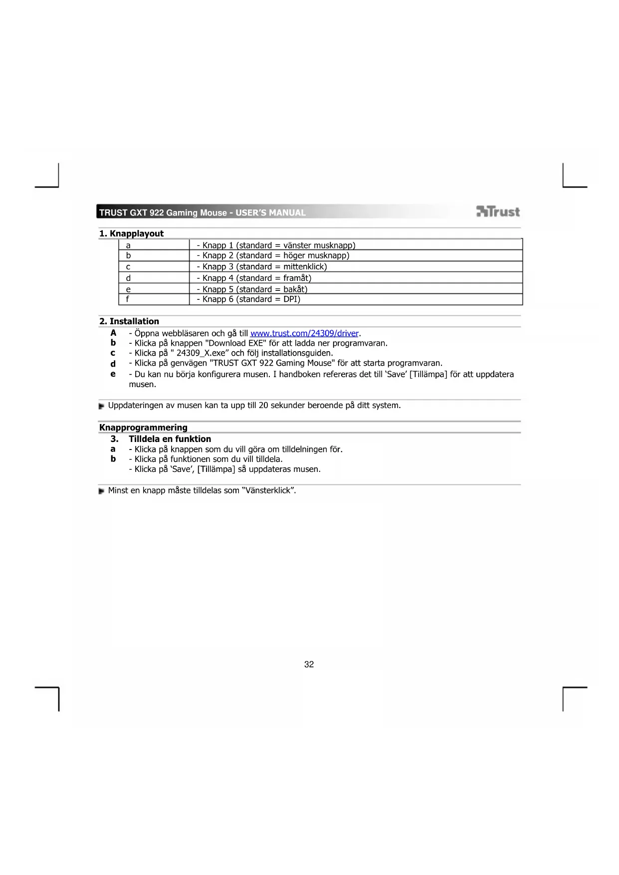 - Öppna webbläsaren och gå till www.trust.com/24309/driver. - Klicka på knappen "Download EXE" för att ladda ner programvaran. - Klicka på " 24309_X.exe” och följ installationsguiden. - Klicka på genvägen "TRUST GXT 922 Gaming Mouse" för att starta programvaran. - Du kan nu börja konfigurera musen. I handboken refereras det till ‘Save’ [Tillämpa] för att uppdatera musen. Uppdateringen av musen kan ta upp till 20 sekunder beroende på ditt system. Knapprogrammering