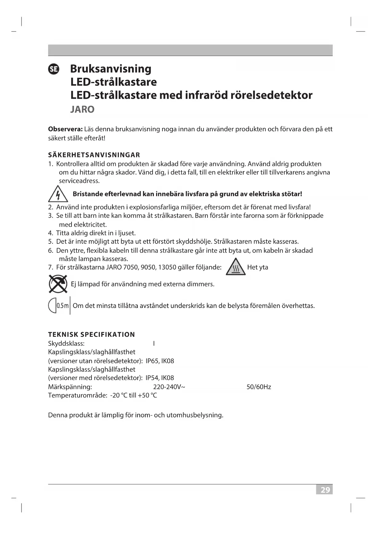 Het yta Ej lämpad för användning med externa dimmers. Om det minsta tillåtna avståndet underskrids kan de belysta föremålen överhettas. TEKNISK SPECIFIKATION Skyddsklass: I Kapslingsklass/slaghållfasthet (versioner utan rörelsedetektor): IP65, IK08 Kapslingsklass/slaghållfasthet (versioner med rörelsedetektor): IP54, IK08 Märkspänning: 220-240V~ 50/60Hz Temperaturområde: -20 °C till +50 °C Denna produkt är lämplig för inom- och utomhusbelysning. 20P114 LED Strahler Jaro PIR 0533228 210327.indd 29 27.03.2021 16:10:493030 Bruksanvisning JARO MONTERING OCH ANSLUTNING TILL STRÖMFÖRSÖRJNINGEN 10 – 50 W se bilderna på sidorna 4, 7 och 8