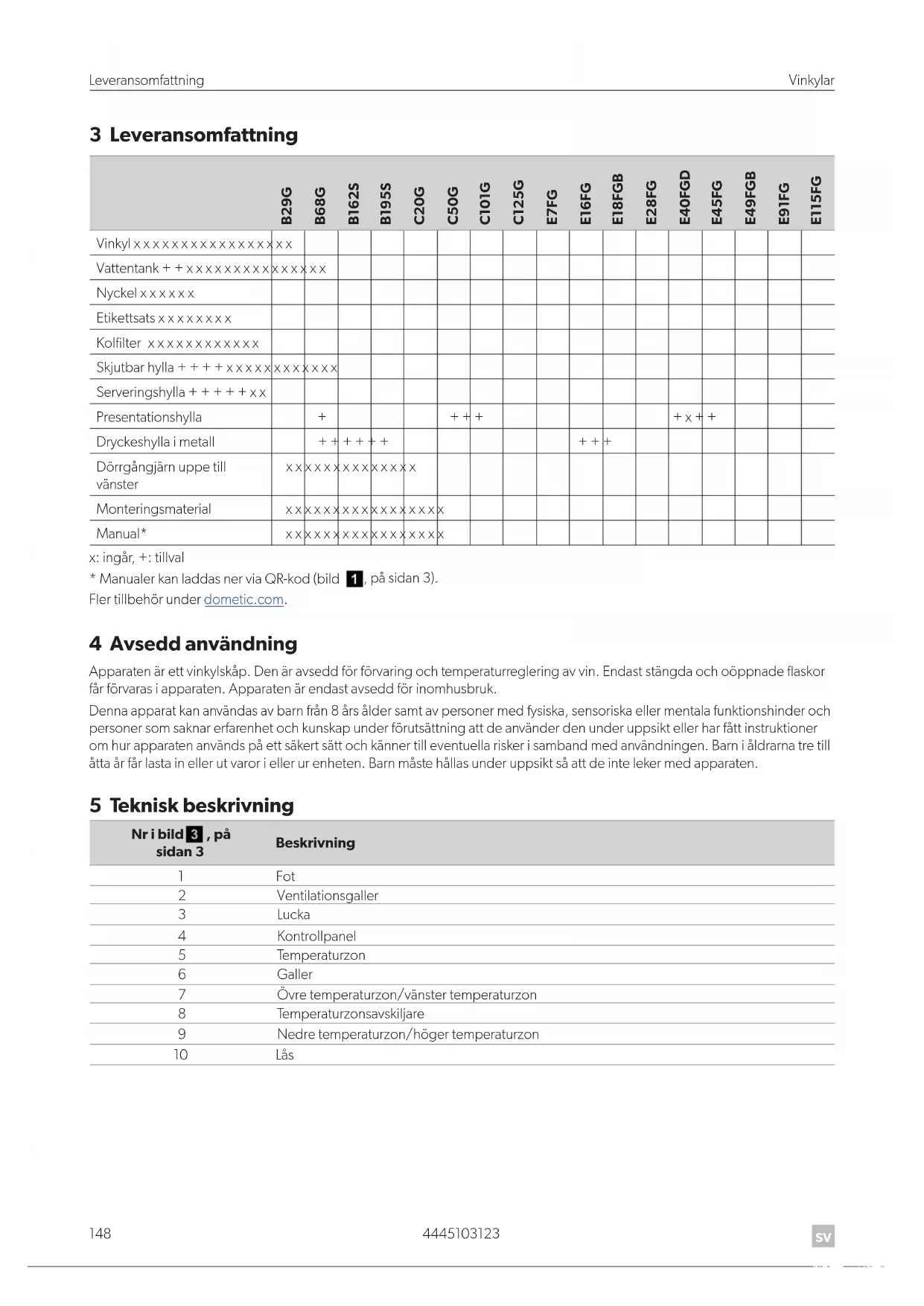 - Manualer kan laddas ner via QR-kod (bild ,påsidan3). Fler tillbehör under dometic.com. 4 Avsedd användning Apparatenärettvinkylskåp.Denäravseddförförvaringochtemperaturregleringavvin.Endaststängdaochoöppnadeaskor fårförvarasiapparaten.Apparatenärendastavseddförinomhusbruk. Dennaapparatkananvändasavbarnfrån8årsåldersamtavpersonermedfysiska,sensoriskaellermentalafunktionshinderoch personersomsaknarerfarenhetochkunskapunderförutsättningattdeanvänderdenunderuppsiktellerharfåttinstruktioner omhurapparatenanvändspåettsäkertsättochkännertilleventuellariskerisambandmedanvändningen.Barniåldrarnatretill åttaårfårlastainellerutvaroriellerurenheten.Barnmåstehållasunderuppsiktsåattdeintelekermedapparaten. 5 Teknisk beskrivning Nr i bild , på sidan 3 Beskrivning 1 Fot 2 Ventilationsgaller 3 Lucka 4 Kontrollpanel 5 Temperaturzon 6 Galler 7 Övre temperaturzon/vänster temperaturzon 8 Temperaturzonsavskiljare 9 Nedre temperaturzon/höger temperaturzon 10 Lås4445103123 149 Vinkylar Teknisk beskrivning