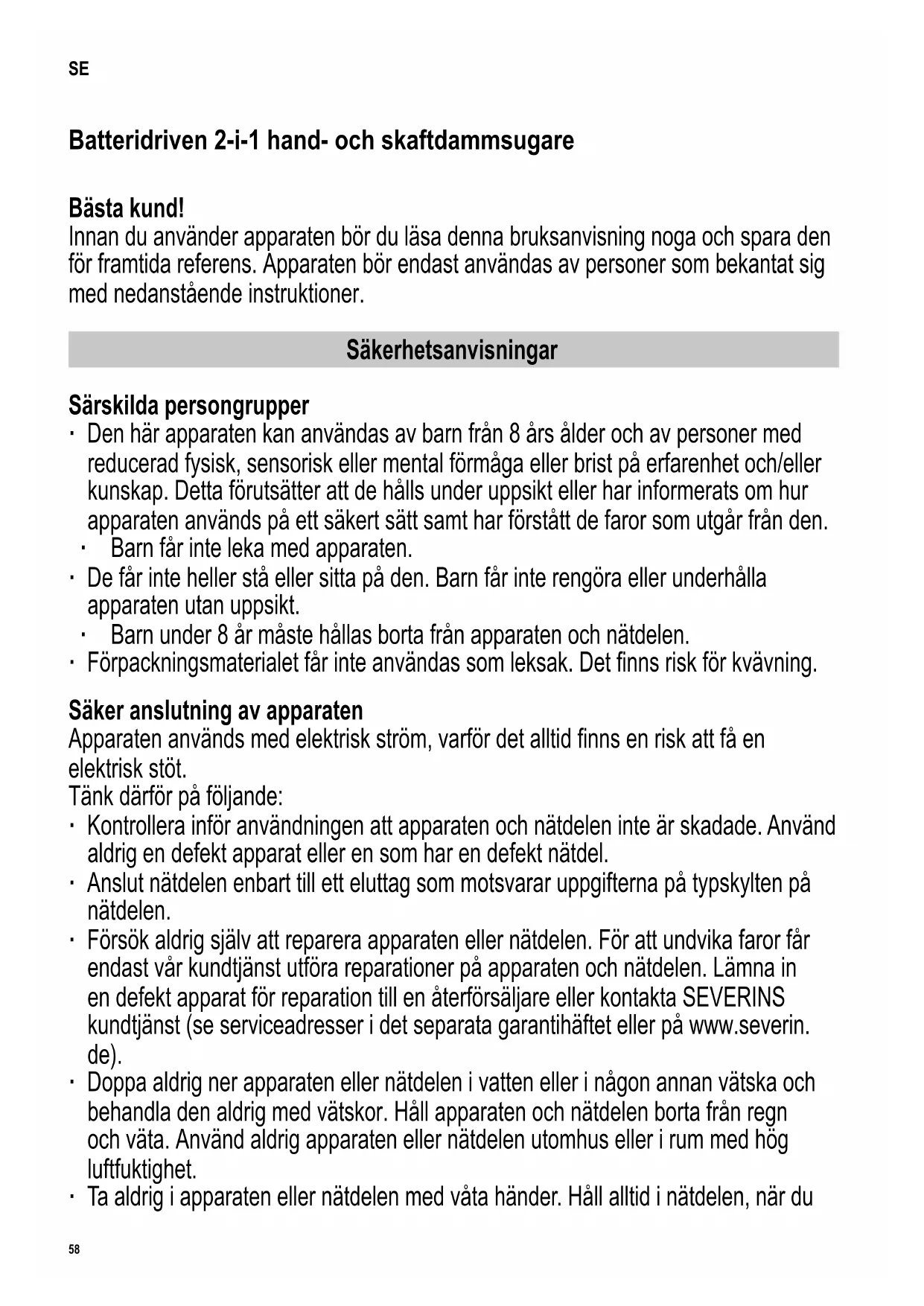 TIP: Anvend aldrig skrappe, skurende rengøringsmidler eller hårde børster til rengøring. Opbevaring af apparatet ∙ Opbevar apparatet og tilbehøret køligt, tørt og utilgængeligt for børn. ∙ For nem opbevaring skal du trykke på knappen og klappe håndtaget sammen. Bestillingsnummer Tilbehør/reservedel 9814-048 Filtersæt 6982-048 Støvbeholder med lter 2361-048 Strømforsyning med tilslutningskabel 3709-048 Parketmundstykke 3627-048 Børstevalse til gulvmundstykke 0024-048 Kort fugemundstykke 9812-048 Langt fugemundstykke 9811-048 Børstedel57 142 x 208 mm Afhjælpning af problemer Egenhændig afhjælpning af problemer For at undgå problemer er det vigtigt at tømme støvbeholderen regelmæssigt og i den forbindelse at kontrol- lere ltrene og rengøre dem, alt efter hvor snavsede de er. Hvis du alligevel skulle få problemer med apparatet, beder vi dig ved hjælp af følgende tabel kontrollere, om du selv kan afhjælpe problemet. Sørg før fejlsøgning for, at apparatet er slukket og ikke lader op. Problem Mulig årsag/løsning Apparatet kan ikke tændes. Batteriet er helt tomt, LED’en lyser ikke. Sluk for apparatet, og oplad batteriet. ►Kapitel „Opladning af batteri“ Apparatet kan ikke oplades (LED’er blinker ikke). Strømforsyningen eller apparatet er ikke sat korrekt i stikket. Kontrollér, at strømforsyningsadapteren sidder korrekt i opladningsstikket på håndsættet. Kontrollér, at strømforsyningen er sat korrekt i stikkontakten. Når du bruger opladningsstikket på bagsiden af håndtaget, skal du kontrollere, at stikket sidder korrekt i opladningsstikket, og at håndtaget er klikket korrekt fast. ►Kapitel „Opladning af batteri“ Akkuen er helt opladet, men apparatet suger stort ikke snavs op. Støvbeholderen skal tømmes, eller lteret skal rengøres. ►Kapitel „Rengøring og vedligeholdelse af apparatet“ Driftstiden bliver kortere og kortere. Børsterullen er snavset og skal rengøres, ►Kapitel „Rengøring af børsterullen“ Filteret skal rengøres. ►Kapitel „Rengøring og vedligeholdelse af apparatet“ Børstevalsen drejer langsomt eller uregelmæssigt. Børsterullen er snavset og skal rengøres. ►Kapitel „Rengøring af børsterulle“ Hvis denne tabel ikke hjælper dig, bedes du kontakte vores hotlineservice (se kontaktoplysninger i det separate garantihæfte). Bortskaffelse og garanti Apparater og batterier, der er mærket med dette symbol, må ikke bortskaffes sammen med husholdningsaffald. Apparater og batterier indeholder værdifulde råstoffer, der kan genbruges. En korrekt bortskaffelse beskytter miljøet og dine medmenneskers sundhed. Apparat med batteri skal aeveres til de relevante indsamlingssteder til bortskaffelse. Spørg din kommune eller forhandleren, hvor apparatet er købt, hvordan du bortskaffer på miljømæssigt forsvarlig vis.58 142 x 208 mm Batteridriven 2-i-1 hand- och skaftdammsugare Bästa kund! Innan du använder apparaten bör du läsa denna bruksanvisning noga och spara den för framtida referens. Apparaten bör endast användas av personer som bekantat sig med nedanstående instruktioner. Säkerhetsanvisningar Särskilda persongrupper ∙ Den här apparaten kan användas av barn från 8 års ålder och av personer med reducerad fysisk, sensorisk eller mental förmåga eller brist på erfarenhet och/eller kunskap. Detta förutsätter att de hålls under uppsikt eller har informerats om hur apparaten används på ett säkert sätt samt har förstått de faror som utgår från den. ∙ Barn får inte leka med apparaten. ∙ De får inte heller stå eller sitta på den. Barn får inte rengöra eller underhålla apparaten utan uppsikt. ∙ Barn under 8 år måste hållas borta från apparaten och nätdelen. ∙ Förpackningsmaterialet får inte användas som leksak. Det nns risk för kvävning. Säker anslutning av apparaten Apparaten används med elektrisk ström, varför det alltid nns en risk att få en elektrisk stöt. Tänk därför på följande: ∙ Kontrollera inför användningen att apparaten och nätdelen inte är skadade. Använd aldrig en defekt apparat eller en som har en defekt nätdel. ∙ Anslut nätdelen enbart till ett eluttag som motsvarar uppgifterna på typskylten på nätdelen. ∙ Försök aldrig själv att reparera apparaten eller nätdelen. För att undvika faror får endast vår kundtjänst utföra reparationer på apparaten och nätdelen. Lämna in en defekt apparat för reparation till en återförsäljare eller kontakta SEVERINS kundtjänst (se serviceadresser i det separata garantihäftet eller på www.severin. de). ∙ Doppa aldrig ner apparaten eller nätdelen i vatten eller i någon annan vätska och behandla den aldrig med vätskor. Håll apparaten och nätdelen borta från regn och väta. Använd aldrig apparaten eller nätdelen utomhus eller i rum med hög luftfuktighet. ∙ Ta aldrig i apparaten eller nätdelen med våta händer. Håll alltid i nätdelen, när du SE59 142 x 208 mm ska dra ut den ur eluttaget. ∙ Se till att kabeln till nätdelen varken viks, kläms fast eller körs över och att den inte kommer i kontakt med värmekällor, fukt eller vassa kanter. Se till att man inte kan snubbla över nätdelens kabel. ∙ Stäng av apparaten och se till att nätdelen inte är ansluten i eluttaget inför rengöring och underhåll, liksom innan du byter tillbehör. Säkerhet vid hantering av uppladdningsbara batterier ∙ Det nns risk för personskador och explosion vid felaktig hantering av uppladdningsbara batterier. ∙ Denna apparat har ett uppladdningsbart batteri, som bara kan bytas ut av utbildad personal. ∙ Avlägsna inte det uppladdningsbara batteriet ur apparaten. Ersätt aldrig de uppladdningsbara batterierna med andra uppladdningsbara eller icke uppladdningsbara batterier. Kortslut aldrig uppladdningsbara batterier, dvs. rör ej båda polerna samtidigt, framför allt inte med ledande föremål. ∙ VARNING! Använd bara den medföljande nätdelen vid la
