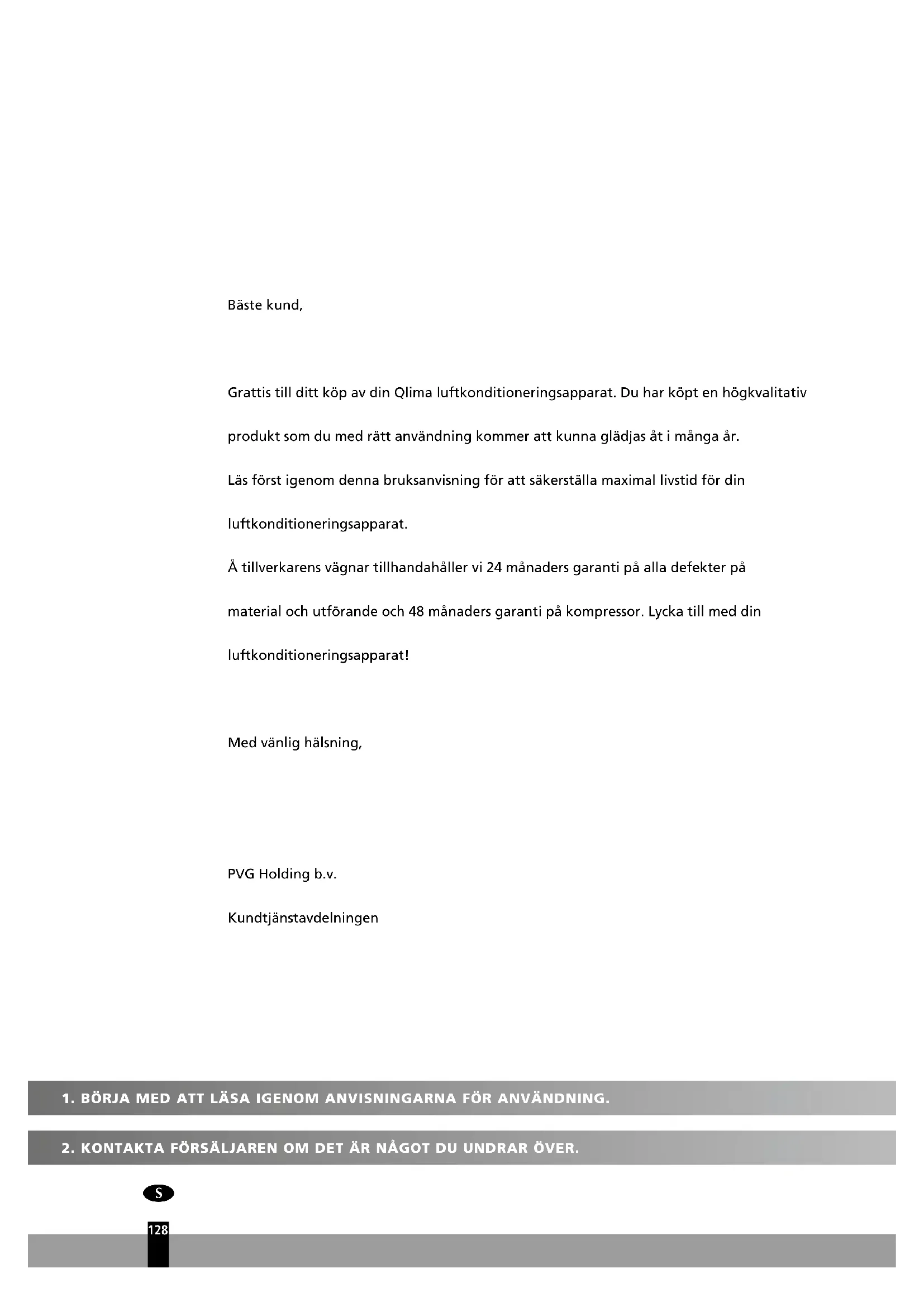 126: 127Bäste kund, Grattis till ditt köp av din Qlima luftkonditioneringsapparat. Du har köpt en högkvalitativ produkt som du med rätt användning kommer att kunna glädjas åt i många år. Läs först igenom denna bruksanvisning för att säkerställa maximal livstid för din luftkonditioneringsapparat. Å tillverkarens vägnar tillhandahåller vi 24 månaders garanti på alla defekter på materialochutförandeoch48månadersgarantipåkompressor.Lyckatillmeddin luftkonditioneringsapparat! Med vänlig hälsning, PVG Holding b.v. Kundtjänstavdelningen