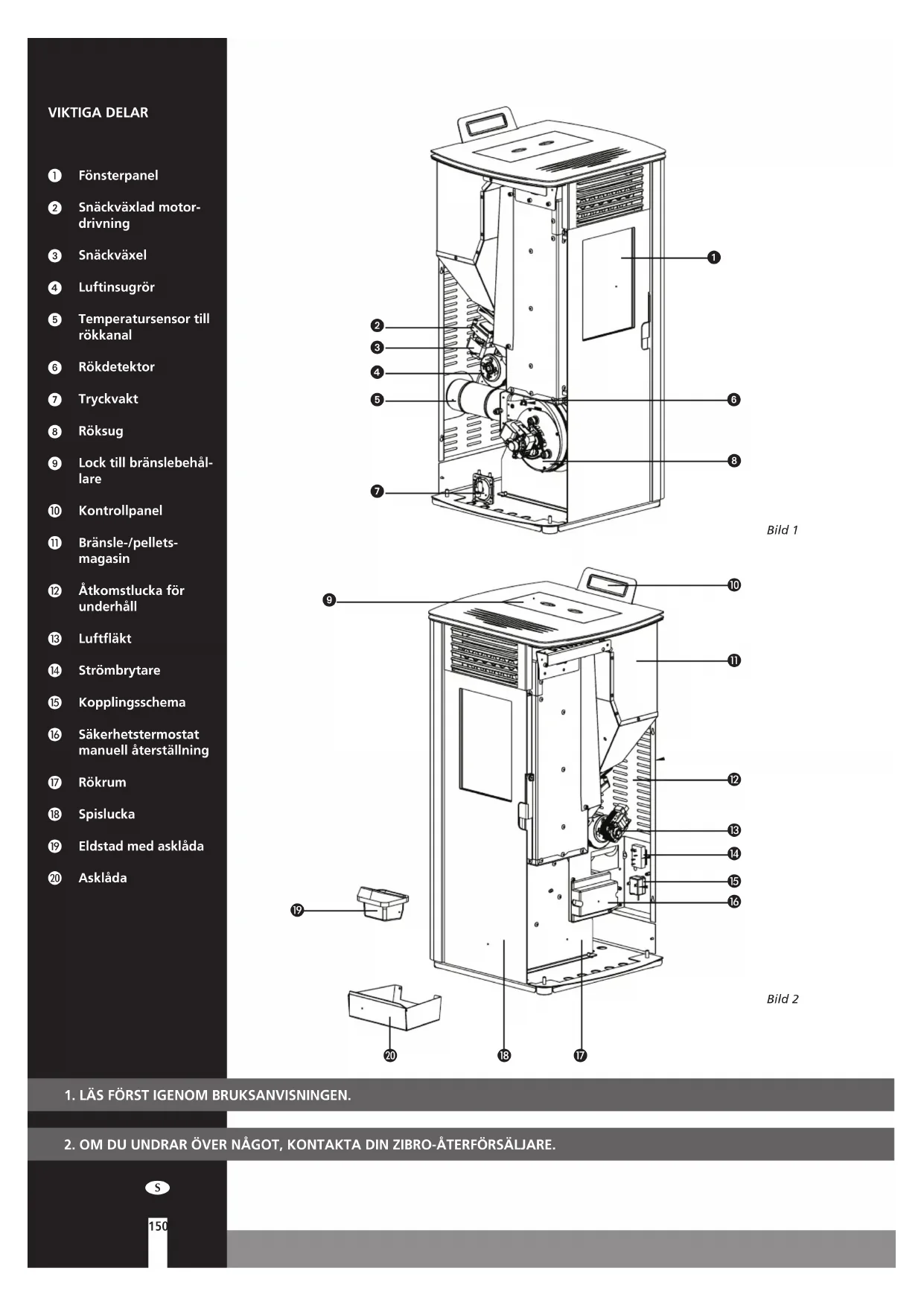VIKTIGA DELAR Fönsterpanel Snäckväxlad motor- drivning Snäckväxel Luftinsugrör Temperatursensor till rökkanal Rökdetektor Tryckvakt Röksug Lock till bränslebehål- lare Kontrollpanel Bränsle-/pellets- magasin Åtkomstlucka för underhåll Luftfläkt Strömbrytare Kopplingsschema Säkerhetstermostat manuell återställning Rökrum Spislucka Eldstad med asklåda Asklåda Bild 2 Bild 1