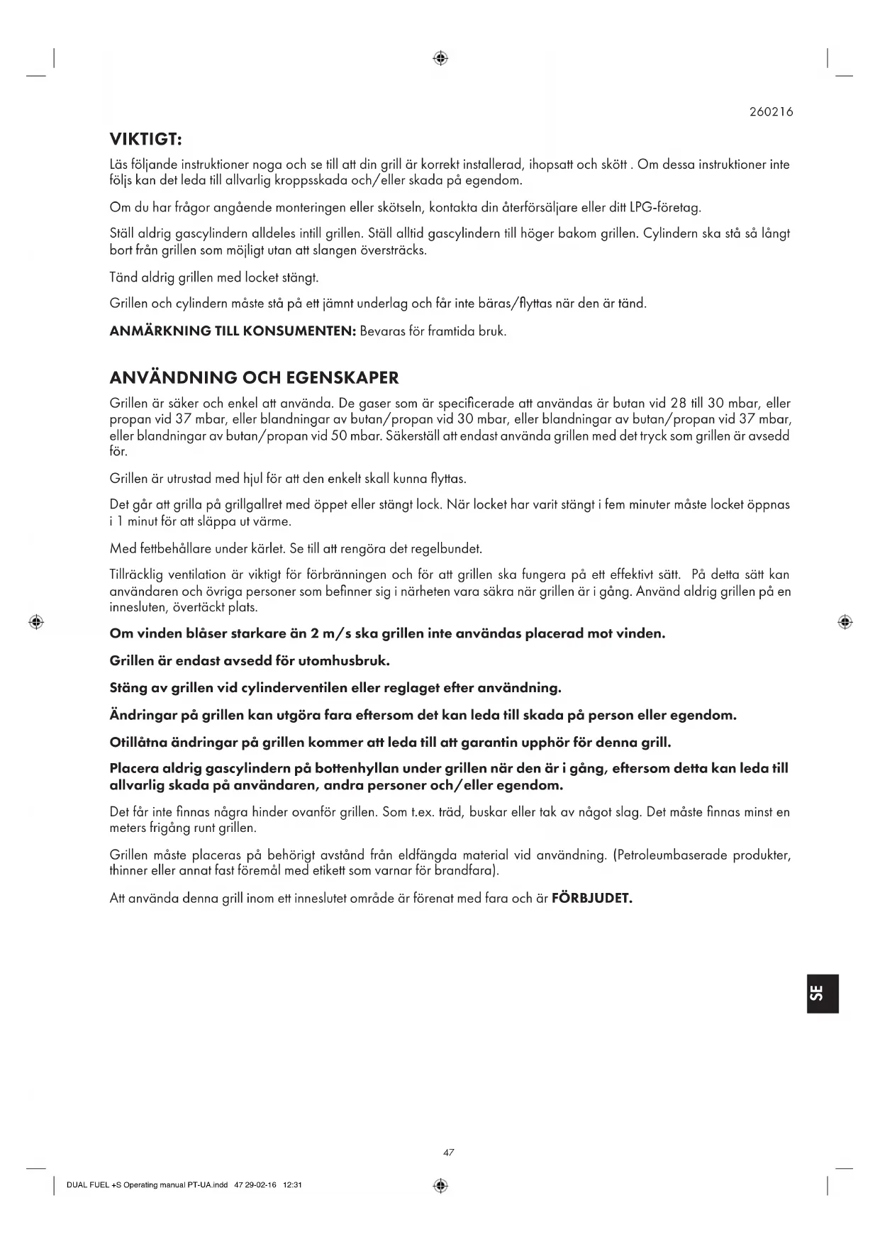 Grillen är säker och enkel att använda. De gaser som är specificerade att användas är butan vid 28 till 30 mbar, eller propan vid 37 mbar, eller blandningar av butan/propan vid 30 mbar, eller blandningar av butan/propan vid 37 mbar, eller blandningar av butan/propan vid 50 mbar. Säkerställ att endast använda grillen med det tryck som grillen är avsedd för. Grillen är utrustad med hjul för att den enkelt skall kunna flyttas. Det går att grilla på grillgallret med öppet eller stängt lock. När locket har varit stängt i fem minuter måste locket öppnas i 1 minut för att släppa ut värme. Med fettbehållare under kärlet. Se till att rengöra det regelbundet. Tillräcklig ventilation är viktigt för förbränningen och för att grillen ska fungera på ett effektivt sätt. På detta sätt kan användaren och övriga personer som befinner sig i närheten vara säkra när grillen är i gång. Använd aldrig grillen på en innesluten, övertäckt plats. Om vinden blåser starkare än 2 m/s ska grillen inte användas placerad mot vinden. Grillen är endast avsedd för utomhusbruk. Stäng av grillen vid cylinderventilen eller reglaget efter användning. Ändringar på grillen kan utgöra fara eftersom det kan leda till skada på person eller egendom. Otillåtna ändringar på grillen kommer att leda till att garantin upphör för denna grill. Placera aldrig gascylindern på bottenhyllan under grillen när den är i gång, eftersom detta kan leda till allvarlig skada på användaren, andra personer och/eller egendom. Det får inte finnas några hinder ovanför grillen. Som t.ex. träd, buskar eller tak av något slag. Det måste finnas minst en meters frigång runt grillen. Grillen måste placeras på behörigt avstånd från eldfängda material vid användning. (Petroleumbaserade produkter, thinner eller annat fast föremål med etikett som varnar för brandfara). Att använda denna grill inom ett inneslutet område är förenat med fara och är FÖRBJUDET.