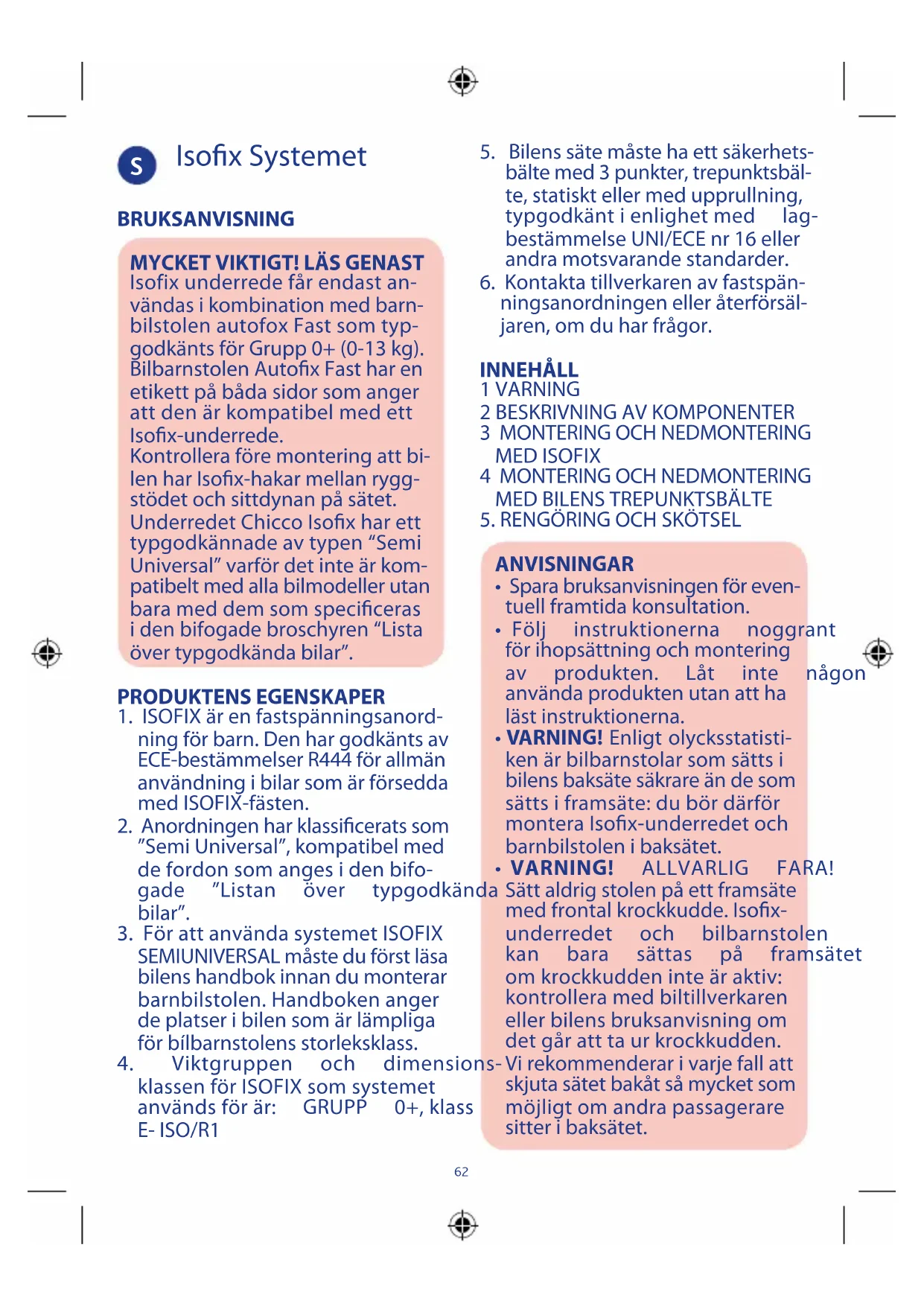 Isofixunderredefårendastan- vändasikombinationmedbarn- bilstolenautofoxFastsomtyp- godkäntsförGrupp0+(0-13kg). BilbarnstolenAutoxFastharen etikettpåbådasidorsomanger attdenärkompatibelmedett Isox-underrede. Kontrolleraföremonteringattbi- lenharIsox-hakarmellanrygg- stödetochsittdynanpåsätet. UnderredetChiccoIsoxharett typgodkännadeavtypen“Semi Universal”varfördetinteärkom- patibeltmedallabilmodellerutan barameddemsomspeciceras idenbifogadebroschyren“Lista övertypgodkändabilar”. PRODUKTENS EGENSKAPER 1.ISOFIXärenfastspänningsanord- ningförbarn.Denhargodkäntsav ECE-bestämmelserR444förallmän användningibilarsomärförsedda medISOFIX-fästen. 2.Anordningenharklassiceratssom ”SemiUniversal”,kompatibelmed defordonsomangesidenbifo- gade ”Listan över typgodkända bilar”. 3.FörattanvändasystemetISOFIX SEMIUNIVERSALmåsteduförstläsa bilenshandbokinnandumonterar barnbilstolen.Handbokenanger deplatseribilensomärlämpliga förbílbarnstolensstorleksklass.