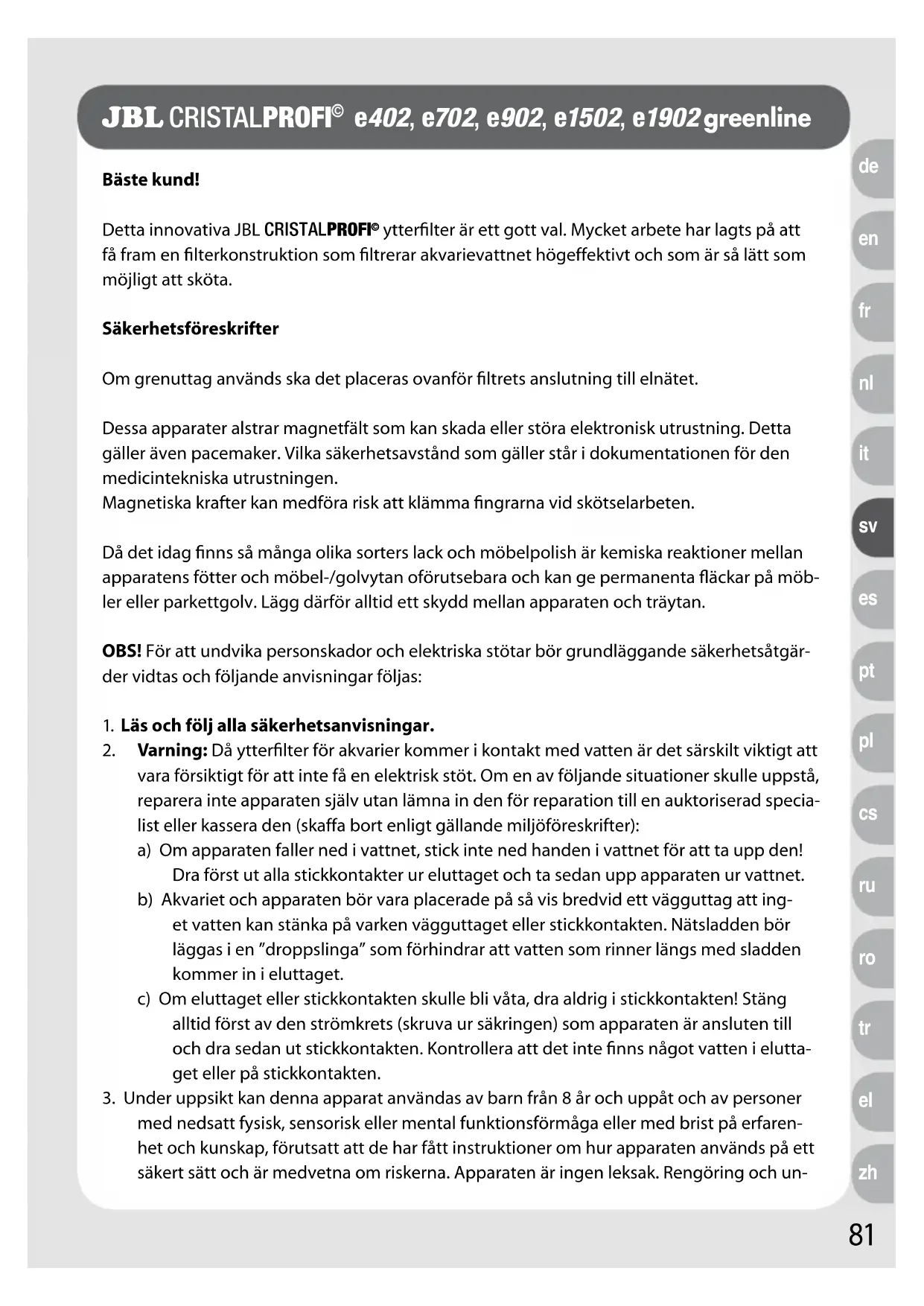 JBL CristalProfi e1502 greenline, JBL CristalProfi e1902 greenline Esclusi dalla garanzia sono i pezzi soggetti a usura come guarnizioni, rotori della pompa o assi montati. La garanzia copre la riparazione secondo le esigenze tecniche o, a nostra scelta, la sua sostituzione (fornitura gratuita di un prodotto equivalente). Per le parti riparate o sostituite in base alla garanzia vale il rimanente periodo di garanzia. La garanzia non comprende il risarcimento dei danni conseguenti diretti o indiretti. La garanzia vale esclusivamente per vendite a clienti all’interno della Comunità Europea. La garanzia si estingue se il montaggio, la manutenzione e la pulizia del prodotto non sono stati eseguiti in modo professionale dal cliente o da terzi. Altrettanto vale se il pro- dotto è stato intenzionalmente danneggiato o modificato impropriamente in qualsiasi modo. Nel periodo di garanzia rivolgersi al rivenditore specializzato, presentando la valida ricevuta d’acquisto, oppure contattare il nostro servizio di supporto: http://www.jbl.de/it/supporto81 Bäste kund!Detta innovativa JBL CRISTALPROFI ytterfilter är ett gott val. Mycket arbete har lagts på att få fram en filterkonstruktion som filtrerar akvarievattnet högeffektivt och som är så lätt som möjligt att sköta.Säkerhetsföreskrifter Om grenuttag används ska det placeras ovanför filtrets anslutning till elnätet.Dessa apparater alstrar magnetfält som kan skada eller störa elektronisk utrustning. Detta gäller även pacemaker. Vilka säkerhetsavstånd som gäller står i dokumentationen för den medicintekniska utrustningen.Magnetiska krafter kan medföra risk att klämma fingrarna vid skötselarbeten.Då det idag finns så många olika sorters lack och möbelpolish är kemiska reaktioner mellan apparatens fötter och möbel-/golvytan oförutsebara och kan ge permanenta fläckar på möb-ler eller parkettgolv. Lägg därför alltid ett skydd mellan apparaten och träytan.OBS! För att undvika personskador och elektriska stötar bör grundläggande säkerhetsåtgär-der vidtas och följande anvisningar följas:1. Läs och följ alla säkerhetsanvisningar.