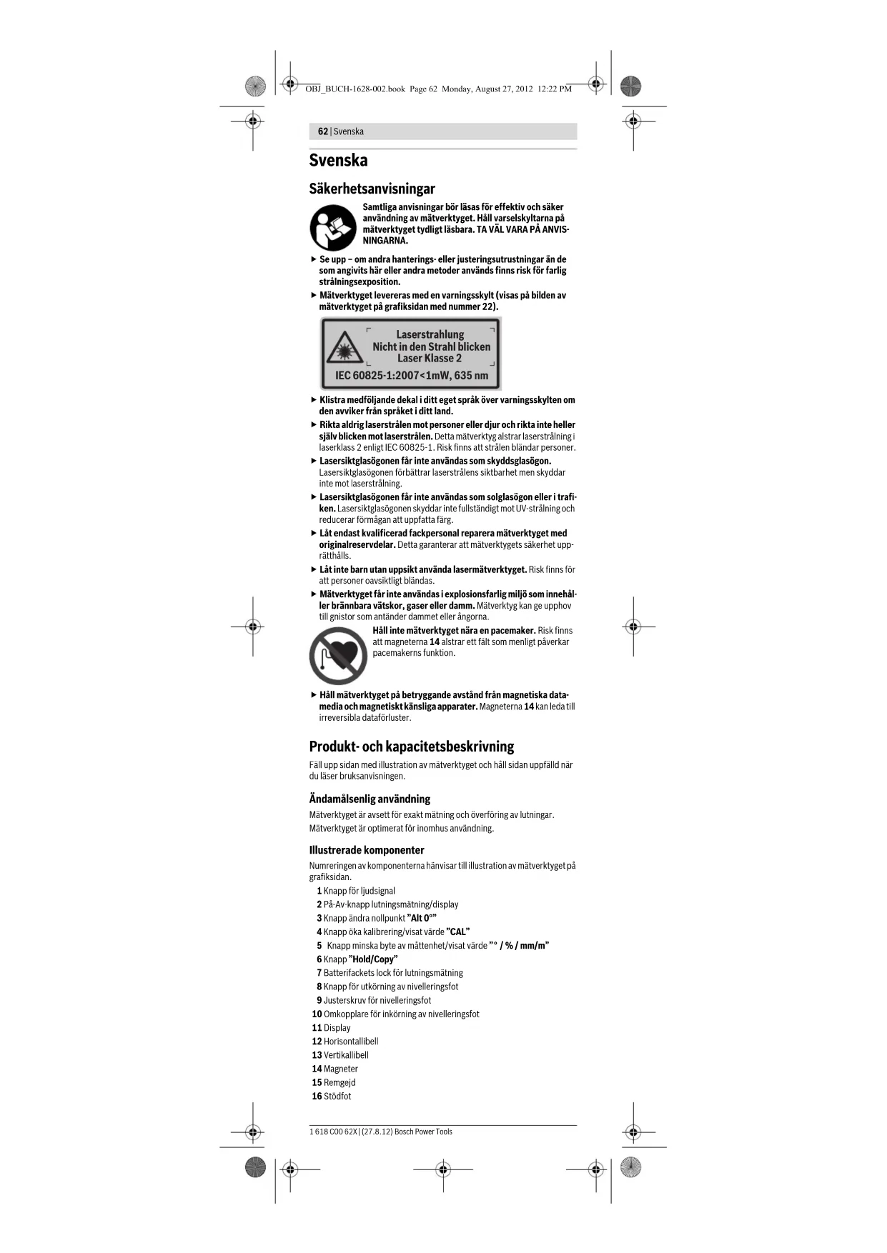 Koppla på mätverktyget och lägg upp det på den lodräta ytan så att libellen 13 är riktad uppåt och displayen 11 mot dig. Vänta 10 s. Tryck sedan ca 2 s på kalibreringsknappen ”CAL” 4, tills ”CAL1” visas kort på displayen. Därefter blinkar mätvärdet på displayen. Vrid nu mätverktyget 180° kring lodlinjen så att vattenpasset fortfa- rande pekar uppåt, men displayen 11 är vänd åt motsatt håll. Vänta 10 s. Tryck sedan på nytt kalibreringsknappen ”CAL” 4. På displayen visas helt kort ”CAL2”. Därefter visas mätvärdet på displayen (blinkar inte längre). Mätverktyget har nu kalibrerats för aktuell anliggningsyta. OBJ_BUCH-1628-002.book Page 66 Monday, August 27, 2012 12:22 PMNorsk | 67 Bosch Power Tools 1 618 C00 62X | (27.8.12) Härefter skall mätverktyget kalibreras för motsatt anliggningsyta. Vrid mätverktyget kring horisontalaxeln så att libellen 13 är riktad nedåt och displayen 11 mot dig. Lägg upp mätverktyget på den lodräta ytan. Vänta 10 s. Tryck sedan ca 2 s på kalibreringsknappen ”CAL” 4, tills ”CAL1” visas kort på displayen. Därefter blinkar mätvärdet på displayen. Vrid nu mätverktyget 180° kring lodlinjen så att vattenpasset fortfa- rande pekar uppåt, men displayen 11 är vänd åt motsatt håll. Vänta 10 s. Tryck sedan på nytt kalibreringsknappen ”CAL” 4. På displayen visas helt kort ”CAL2”. Därefter visas mätvärdet på displayen (blinkar inte längre). Mätverktyget har nu kalibrerats för båda lodräta anliggnings- ytorna. Anvisning: Om mätverktyget inte vrids i steg och som bilden visar kan kalibreringen inte avslutas (”CAL2” visas på displayen). Underhåll och service Underhåll och rengöring Lagra och transportera mätverktyget endast i det skyddsfodral som medle- vererats. Se till att mätverktyget alltid hålls rent. Mätverktyget får inte doppas i vatten eller andra vätskor. Torka av mätverktyget med en fuktig, mjuk trasa. Använd inte rengörings- eller lösningsmedel. Rengör regelbundet speciellt ytorna kring laserns utloppsöppning och se till ludd avlägsnas. Om störningar uppstår i mätverktyget trots exakt tillverkning och sträng kontroll bör reparationen utföras av en auktoriserad serviceverkstad för Bosch elverktyg. Ta inte isär mätverktyget på egen hand. Var vänlig ange vid förfrågningar och reservdelsbeställningar produktnum- mer som består av 10 siffror och som finns på mätverktygets typskylt. För reparation ska mätverktyget skickas in i skyddsfodralet 24. Kundservice och kundkonsulter Kundservicen ger svar på frågor beträffande reparation och underhåll av produkter och reservdelar. Sprängskissar och informationer om reservde- lar lämnas även på adressen: www.bosch-pt.com Bosch kundkonsultgruppen hjälper gärna när det gäller frågor beträffande köp, användning och inställning av produkter och tillbehör. Svenska Bosch Service Center Telegrafvej 3 2750 Ballerup Danmark Tel.: +46 (020) 41 44 55 Fax: +46 (011) 18 76 91 Avfallshantering Mätverktyg, tillbehör och förpackning ska omhändertas på miljövänligt sätt för återvinning. Släng inte mätverktyg och inte heller batterier i hushållsavfall! Endast för EU-länder: Enligt europeiska direktivet 2002/96/EG måste obruk- bara mätverktyg och enligt europeiska direktivet 2006/66/EG felaktiga eller förbrukade batterier separat omhändertas och på miljövänligt sätt lämnas in för åter- vinning. Ändringar förbehålles. Norsk Sikkerhetsinformasjon Les og følg alle anvisningene, for å kunne arbeide fare- fritt og sikkert med måleverktøyet. Gjør aldri varselskilt på måleverktøyet uleselig. TA GODT VARE PÅ DISSE IN- STRUKSENE. f OBS! Hvis det brukes andre betjenings- eller justeringsinnretninger enn de vi har angitt her eller det utføres andre bruksmetoder, kan dette føre til en farlig stråle-eksponering. f Måleverktøyet leveres med et advarselsskilt (på bildet av måleverk- tøyet på siden med bildene er dette merket med nummer 22). IEC 60825-1:2007<1mW, 635 nm Laserstrahlung Nicht in den Strahl blicken Laser Klasse 2 OBJ_BUCH-1628-002.book Page 67 Monday, August 27, 2012 12:22 PM68 | Norsk 1 618 C00 62X | (27.8.12) Bosch Power Tools f Hvis teksten på advarselsskiltet ikke er på ditt språk, må du lime en etikett på ditt språk over dette skiltet før du tar produktet i bruk. f Rett aldri laserstrålen mot personer eller dyr og se ikke selv inn i la- serstrålen. Dette måleverktøyet lager laserstråling i laserklasse 2 jf. IEC 60825-1. Du kan da blende personer. f Bruk laserbrillene aldri som beskyttelsesbriller. Laserbrillene er til bedre registrering av laserstrålen, men de beskytter ikke mot laserstrå- lingen. f Bruk laserbrillene aldri som solbriller eller i trafikken. Laserbrillene gir ingen fullstendig UV-beskyttelse og reduserer fargeregistreringen. f Måleverktøyet skal alltid kun repareres av kvalifisert fagpersonale og kun med originale reservedeler. Slik opprettholdes måleverktøyets sikkerhet. f La aldri barn bruke laser-måleverktøyet uten oppsyn. Du kan ufrivillig blende personer. f Ikke arbeid med måleverktøyet i eksplosjonsutsatte omgivelser – der det befinner seg brennbare væsker, gass eller støv. I måleverk- tøyet kan det oppstå gnister som kan antenne støv eller damper. Ikke bruk måleverktøyet i nærheten av pacemakere. Magneten 14 oppretter et felt som kan innskrenke funk- sjonen til pacemakere. f Hold måleverktøyet unna magnetiske databærere og magnetisk øm- findtlige apparater. Magnetenes 14 virkning kan medføre irreversible datatap. Produkt- og ytelsesbeskrivelse Brett ut utbrettssiden med bildet av måleverktøyet, og la denne siden være utbrettet mens du leser bruksanvisningen. Formålsmessig bruk Måleverktøyet er bestemt for presis måling og overføring av helninger. Måleverktøyet er optimert for bruk innendørs. Illustrerte komponenter Nummereringen av de illustrerte komponentene gjelder for bil