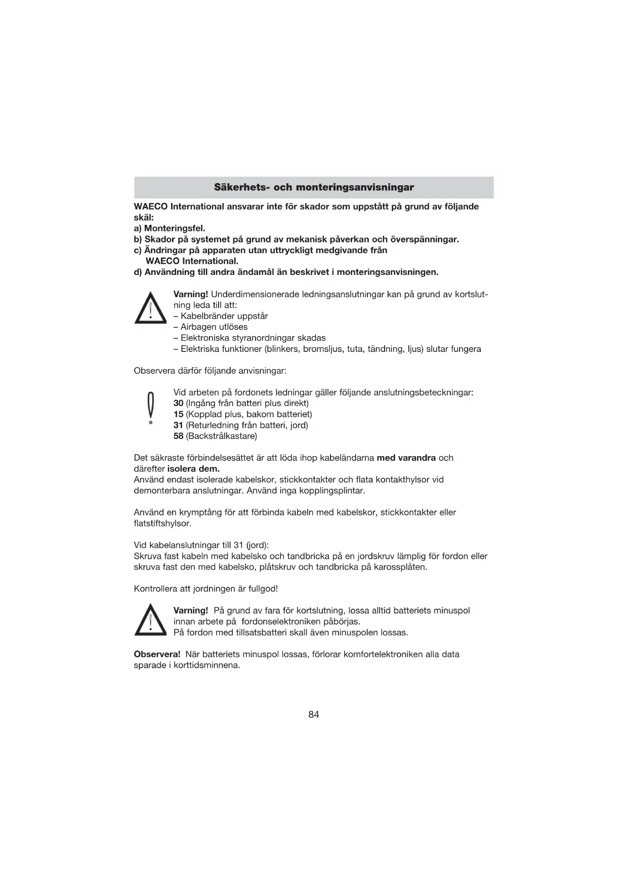 Säkerhets- och monteringsanvisningar WAECO International ansvarar inte för skador som uppstått på grund av följande skäl: a) Monteringsfel. b) Skador på systemet på grund av mekanisk påverkan och överspänningar. c) Ändringar på apparaten utan uttryckligt medgivande från WAECO International. d) Användning till andra ändamål än beskrivet i monteringsanvisningen. Varning! Underdimensionerade ledningsanslutningar kan på grund av kortslut- ning leda till att: – Kabelbränder uppstår – Airbagen utlöses – Elektroniska styranordningar skadas – Elektriska funktioner (blinkers, bromsljus, tuta, tändning, ljus) slutar fungera Observera därför följande anvisningar: Vid arbeten på fordonets ledningar gäller följande anslutningsbeteckningar: 30 (Ingång från batteri plus direkt) 15 (Kopplad plus, bakom batteriet) 31 (Returledning från batteri, jord) 58 (Backstrålkastare) Det säkraste förbindelsesättet är att löda ihop kabeländarna med varandra och därefter isolera dem. Använd endast isolerade kabelskor, stickkontakter och flata kontakthylsor vid demonterbara anslutningar. Använd inga kopplingsplintar. Använd en krymptång för att förbinda kabeln med kabelskor, stickkontakter eller flatstiftshylsor. Vid kabelanslutningar till 31 (jord): Skruva fast kabeln med kabelsko och tandbricka på en jordskruv lämplig för fordon eller skruva fast den med kabelsko, plåtskruv och tandbricka på karossplåten. Kontrollera att jordningen är fullgod! Varning! På grund av fara för kortslutning, lossa alltid batteriets minuspol innan arbete på fordonselektroniken påbörjas. På fordon med tillsatsbatteri skall även minuspolen lossas. Observera! När batteriets minuspol lossas, förlorar komfortelektroniken alla data sparade i korttidsminnena.Säkerhets- och monteringsanvisningar Följande data måste, beroende på fordonets utrustning, matas in på nytt: Radiokod · Klocka · Kopplingsur · Färddator · Sätesposition Anvisningar till inställningen finns att läsa i motsvarande bruksanvisning. Varning! Delar av LCD-takmonitorn RV-RMM-70 resp. RV-RMM-104 som monterats i fordonet måste fästas på sådant sätt, att de under inga omständigheter (kraftig inbromsning, trafikolycka) kan lossna och skada fordonets passagerare. Observera att monitorn inte får placeras innanför AIRBAGENS verkningsområde. Vid utlösning finns det annars risk för skador. Montera inte monitorn i områden där huvudet kan slå emot vid en krock. Observera! För kontroll av spänningen i elektriska ledningar får endast en diodtestlampa ( se A 1) eller en voltmeter (se A 2) användas. Testlampor (se A 3) med ljuskropp förbrukar för mycket ström och kan skada fordonetselektroniska system. Observera! För att undvika skador, se till att det finns tillräckligt stor fri yta där borren kommer ut (se A 4). Grada och behandla varje borrhål med rostskyddsmedel. Observera! Vid dragningen av de elektriska anslutningarna, se till att dessa: