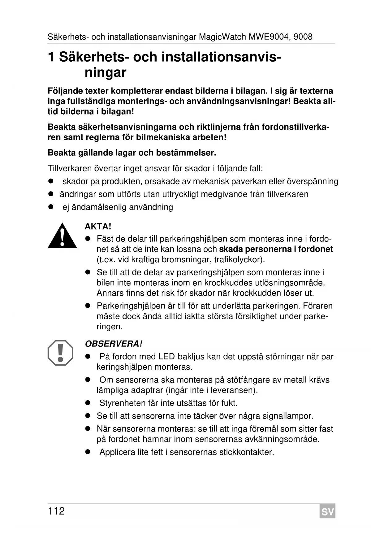 3 Ändamålsenlig användning MagicWatch är en parkeringshjälp som arbetar med ultraljud. Den övervakar området vid parkering MWE9008: framför och bakom fordonet MWE9004: bakom fordonet Avger akustiska varningssignaler om några hinder registreras av apparaten. MagicWatch är avsedd för personbilar och husbilar. 4 Före monteringen