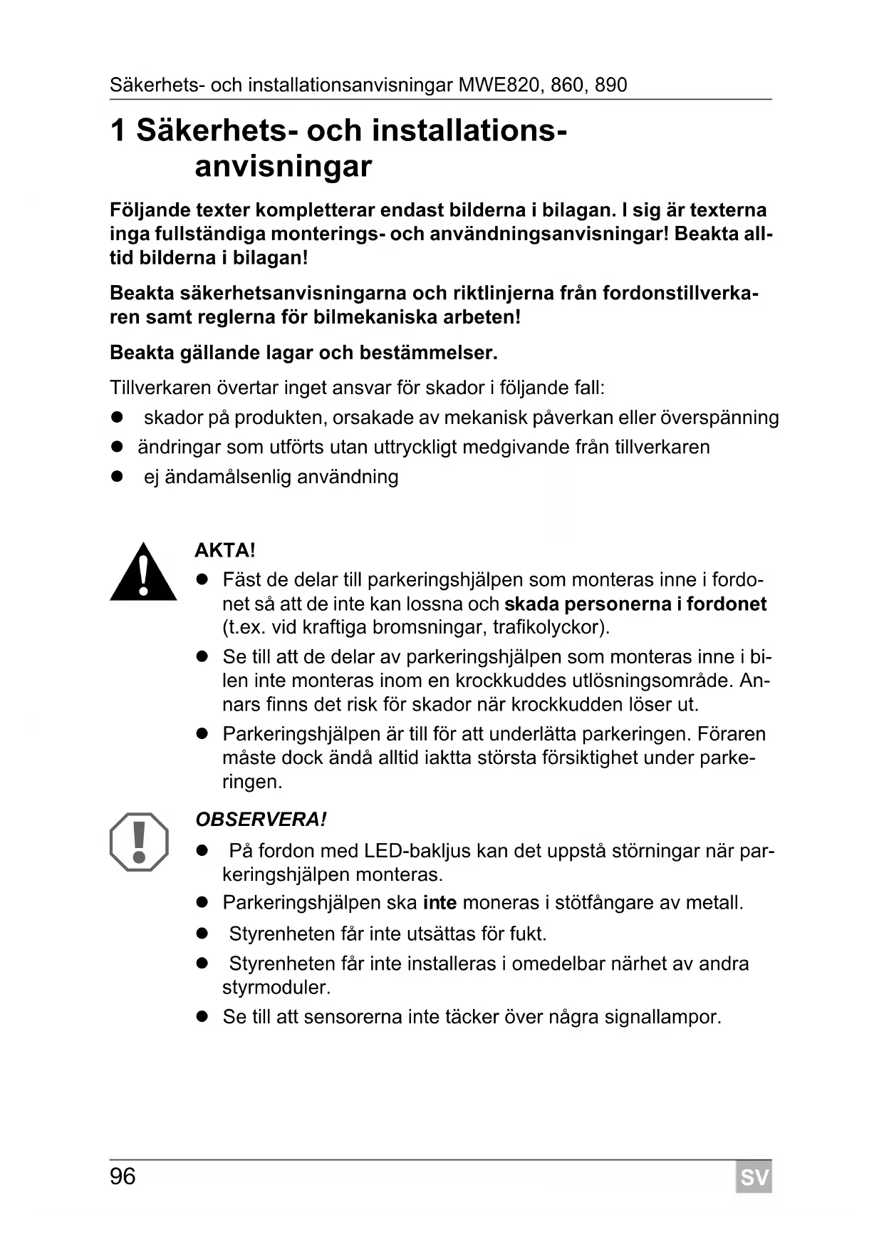 OBSERVERA! Stanna genast bilen och kontrollera avståndet (stig vid behov ut ur bilen) om nedanstående sker under parkeringen: Under parkeringen signalerar systemet ett hinder och signalerna blir snabbare (växlar t.ex. från långsamt till ”medelsnabbt”). Plöts- ligt växlar systemet till långsamma signaler igen, eller det signal- erar inget hinder längre. Det betyder att hindret inte längre befinner sig inom sensorernas avkänningsområde (beroende på modell). OBSERVERA! Systemet fungerar inte längre tillförlitligt om en eller flera sensorer är defekta.SV Garanti MWE820, 860, 890