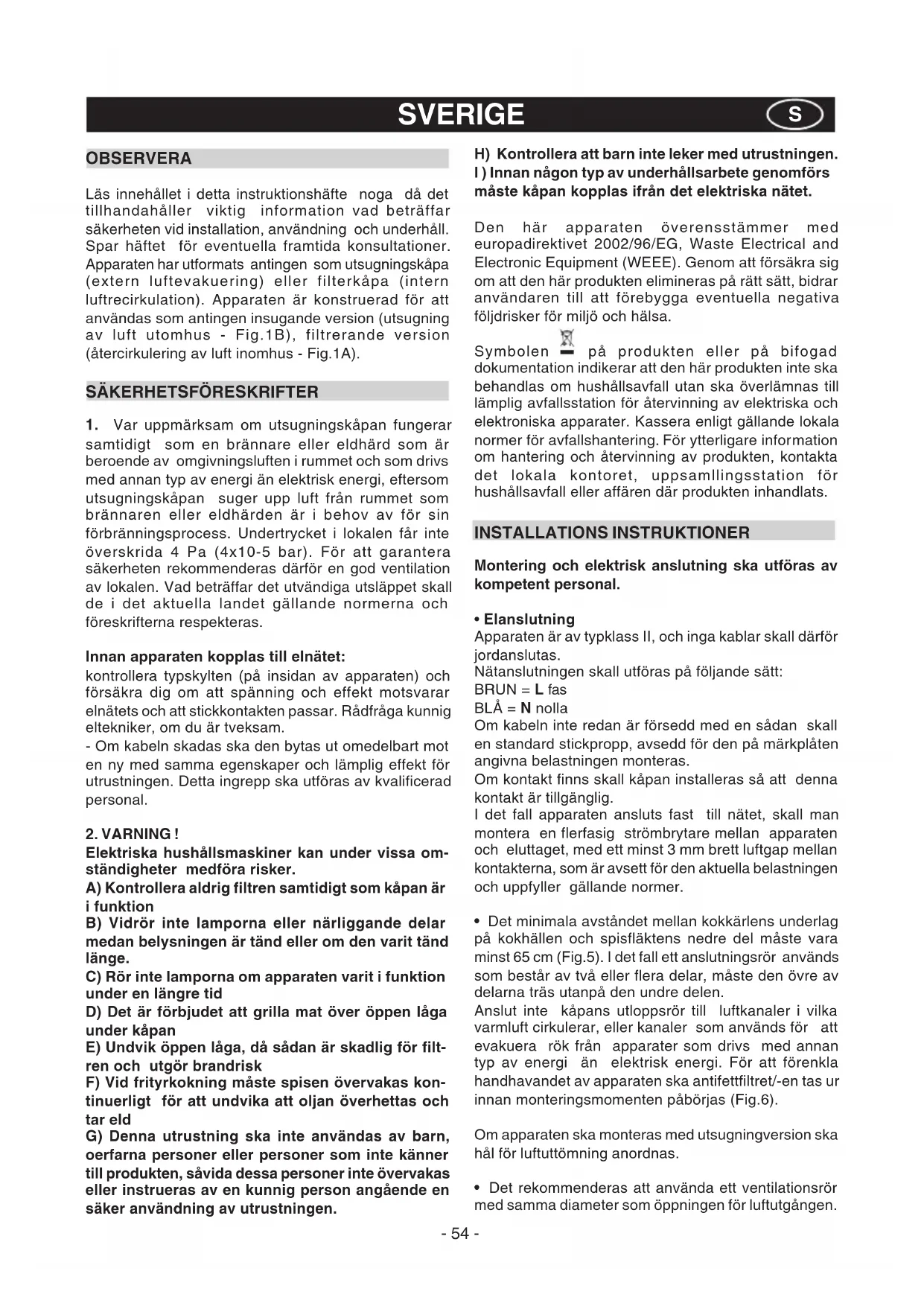 Elektriska hushållsmaskiner kan under vissa om- ständigheter medföra risker. A) Kontrollera aldrig filtren samtidigt som kåpan är i funktion B) Vidrör inte lamporna eller närliggande delar medan belysningen är tänd eller om den varit tänd länge. C) Rör inte lamporna om apparaten varit i funktion under en längre tid D) Det är förbjudet att grilla mat över öppen låga under kåpan E) Undvik öppen låga, då sådan är skadlig för filt- ren och utgör brandrisk F) Vid frityrkokning måste spisen övervakas kon- tinuerligt för att undvika att oljan överhettas och tar eld G) Denna utrustning ska inte användas av barn, oerfarna personer eller personer som inte känner till produkten, såvida dessa personer inte övervakas eller instrueras av en kunnig person angående en säker användning av utrustningen. H) Kontrollera att barn inte leker med utrustningen. I ) Innan någon typ av underhållsarbete genomförs måste kåpan kopplas ifrån det elektriska nätet. Den här apparaten överensstämmer med europadirektivet 2002/96/EG, Waste Electrical and Electronic Equipment (WEEE). Genom att försäkra sig om att den här produkten elimineras på rätt sätt, bidrar användaren till att förebygga eventuella negativa följdrisker för miljö och hälsa. Symbolen på produkten eller på bifogad dokumentation indikerar att den här produkten inte ska behandlas om hushållsavfall utan ska överlämnas till lämplig avfallsstation för återvinning av elektriska och elektroniska apparater. Kassera enligt gällande lokala normer för avfallshantering. För ytterligare information om hantering och återvinning av produkten, kontakta det lokala kontoret, uppsamllingsstation för hushållsavfall eller affären där produkten inhandlats. INSTALLATIONS INSTRUKTIONER Montering och elektrisk anslutning ska utföras av kompetent personal.