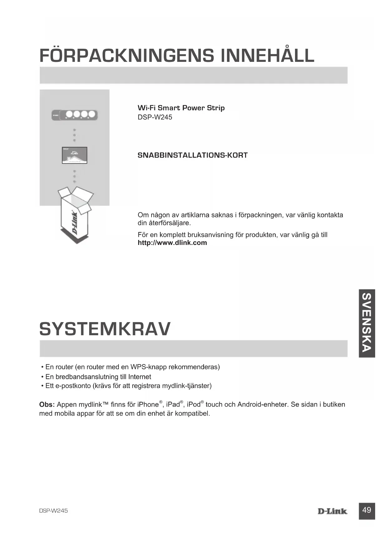touch och Android-enheter. Se sidan i butiken med mobila appar för att se om din enhet är kompatibel. Om någon av artiklarna saknas i förpackningen, var vänlig kontakta din återförsäljare. För en komplett bruksanvisning för produkten, var vänlig gå till http://www.dlink.com SNABBINSTALLATIONS-KORT SYSTEMKRAV Wi-Fi Smart Power Strip DSP-W245