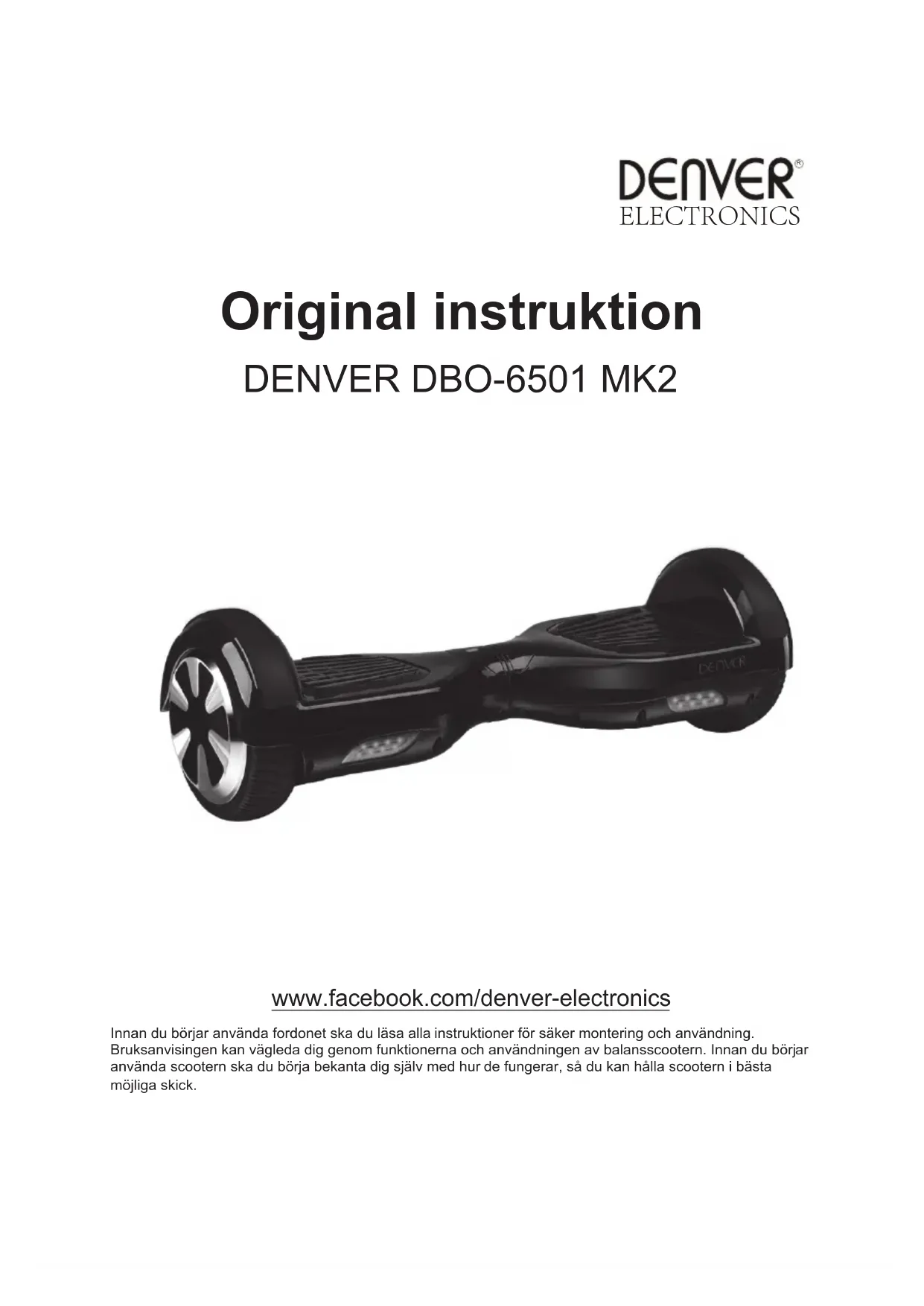 www.facebook.com/denver-electronics Innan du börjar använda fordonet ska du läsa alla instruktioner för säker montering och användning. Bruksanvisingen kan vägleda dig genom funktionerna och användningen av balansscootern. Innan du börjar använda scootern ska du börja bekanta dig själv med hur de fungerar, så du kan hålla scootern i bästa möjliga skick.