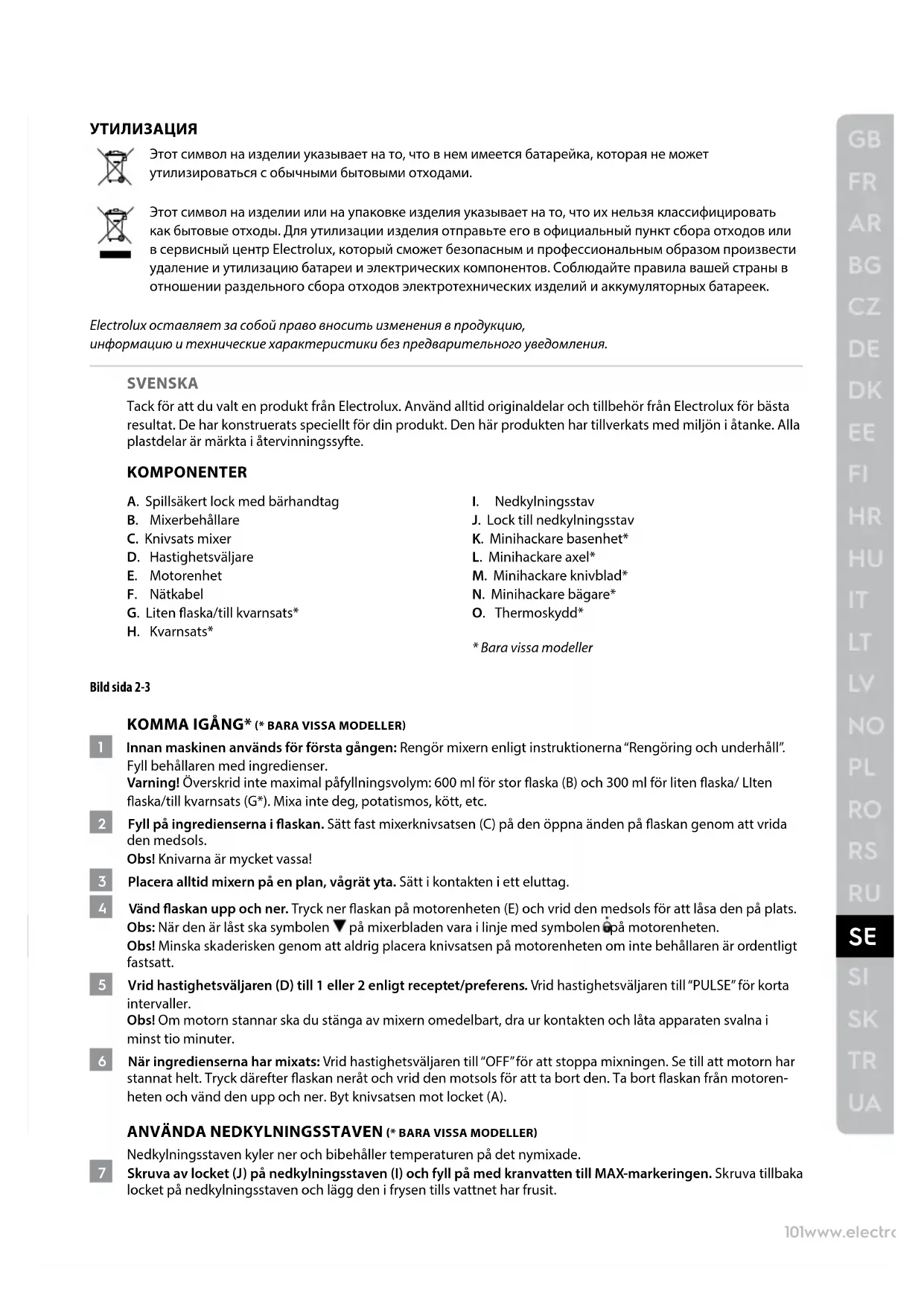 - Bara vissa modeller Bild sida 2-3 KOMMA IGÅNG* (* BARA VISSA MODELLER) 1 Innan maskinen används för första gången: Rengör mixern enligt instruktionerna “Rengöring och underhåll”. Fyll behållaren med ingredienser. Varning! Överskrid inte maximal påfyllningsvolym: 600 ml för stor aska (B) och 300 ml förliten aska/ LIten aska/till kvarnsats(G*). Mixa inte deg, potatismos, kött, etc. 2 Fyll på ingredienserna i askan. Sätt fast mixerknivsatsen (C) på den öppna änden på askan genom att vrida den medsols. Obs! Knivarna är mycket vassa! 3 Placera alltid mixern på en plan, vågrät yta. Sätt i kontakten i ett eluttag. 4 Vänd askan upp och ner. Tryck ner askan påmotorenheten (E) och vrid den medsols för att låsa den på plats. Obs: När den är låst ska symbolen på mixerbladen vara i linje med symbolen på motorenheten. Obs! Minska skaderisken genom att aldrig placera knivsatsen på motorenheten om inte behållaren är ordentligt fastsatt. 5 Vrid hastighetsväljaren (D) till 1 eller 2 enligt receptet/preferens. Vrid hastighetsväljaren till “PULSE” för korta intervaller. Obs! Om motorn stannar ska du stänga av mixern omedelbart, dra ur kontakten och låta apparaten svalna i minst tio minuter. 6 När ingredienserna har mixats: Vrid hastighetsväljaren till “OFF” för att stoppa mixningen. Se till att motorn har stannat helt. Tryck därefter askan neråt och vrid den motsols för att ta bort den. Ta bort askan frånmotoren- heten och vänd den upp och ner. Byt knivsatsen mot locket (A). ANVÄNDA NEDKYLNINGSSTAVEN (* BARA VISSA MODELLER) Nedkylningsstaven kyler ner och bibehåller temperaturen på det nymixade. 7 Skruva av locket (J) på nedkylningsstaven (I) och fyll på med kranvatten till MAX-markeringen. Skruva tillbaka locket på nedkylningsstaven och lägg den i frysen tills vattnet har frusit.102www.electrolux.com 8 Skruvafast den frysta nedkylningsstaven på locket med bärhandtag (A). Fäst den på askan (B). Nedkylningsstaven kan diskas i diskmaskinen. OBS! Nedkylningsstaven passar inte i den lilla askan (G*). ANVÄNDA KVARNEN* (* BARA VISSA MODELLER) 9 Lägg i ingredienserna iden lilla askan för kvarnsats(G*). Sätt dit kvarnsatsen (H*) på den öppna änden av askan genom att vrida den medsols. Obs! Knivarna är mycket vassa! 10 Vänd askan upp och ner. Tryck ner askan på motorenheten (E) och vrid den medsols för att låsa den på plats. Obs: När den är låst ska symbolen på kvarnens blad vara i linje med symbolen på motorenheten. Obs! Minska skaderisken genom att aldrig placera knivsatsen på motorenheten om inte behållaren är ordentligt fastsatt. ANVÄNDA MINIHACKAREN* (* BARA VISSA MODELLER) 11 Fäst knivbladen (M*) påminihackarens axel(L*) genom att trycka ner det tills knivarna klickar på plats. Lägg i ingredienserna ibägaren (N*). Sätt fast basenheten (K*) ibägaren genom att vrida den medsols tills hackskålen klickar på plats. 12 Vänd hackskålen upp och ner. Tryck nerbägaren i motorenheten (E) och vrid den medsols för att låsa den på plats. OBS: När den är låst ska symbolen på basenheten vara i linje med symbolen på motor- enheten. Varning! För att minska risken för skador, placera aldrigknivsatsenpå motorenhetenutan attminihackbägaren är ordentligt fastsatt. ANVÄNDA THERMOSKYDDET* (* BARA VISSA MODELLER) 13 Termoskyddets funktion: behåller temperaturen på vätskor längre, oavsett om det är kalla eller varma drycker. Placera askan i skyddet och stäng dragkedjan. RENGÖRING OCH UNDERHÅLL * (* BARA VISSA MODELLER) 14 Koppla från produkten. Tillbehören går att diska i diskmaskinen, förutomknivsatsen (C), kvarnsatsen (H*) ochminihackarens basenhet(K*). Låt alla delarna torka ordenligt. Obs! Knivarna är mycket vassa! 15 Rengör motorenheten med en fuktig trasa. Obs! Sänk aldrig ner motorenheten i vatten! Använd inte slipande rengöringsmedel eller skursvampar när du rengör apparaten. Vi hoppas och tror att du kommer att uppskatta din nya produkt från Electrolux! SÄKERHET Läs följande instruktion noggrant innan du använder enheten första gången.