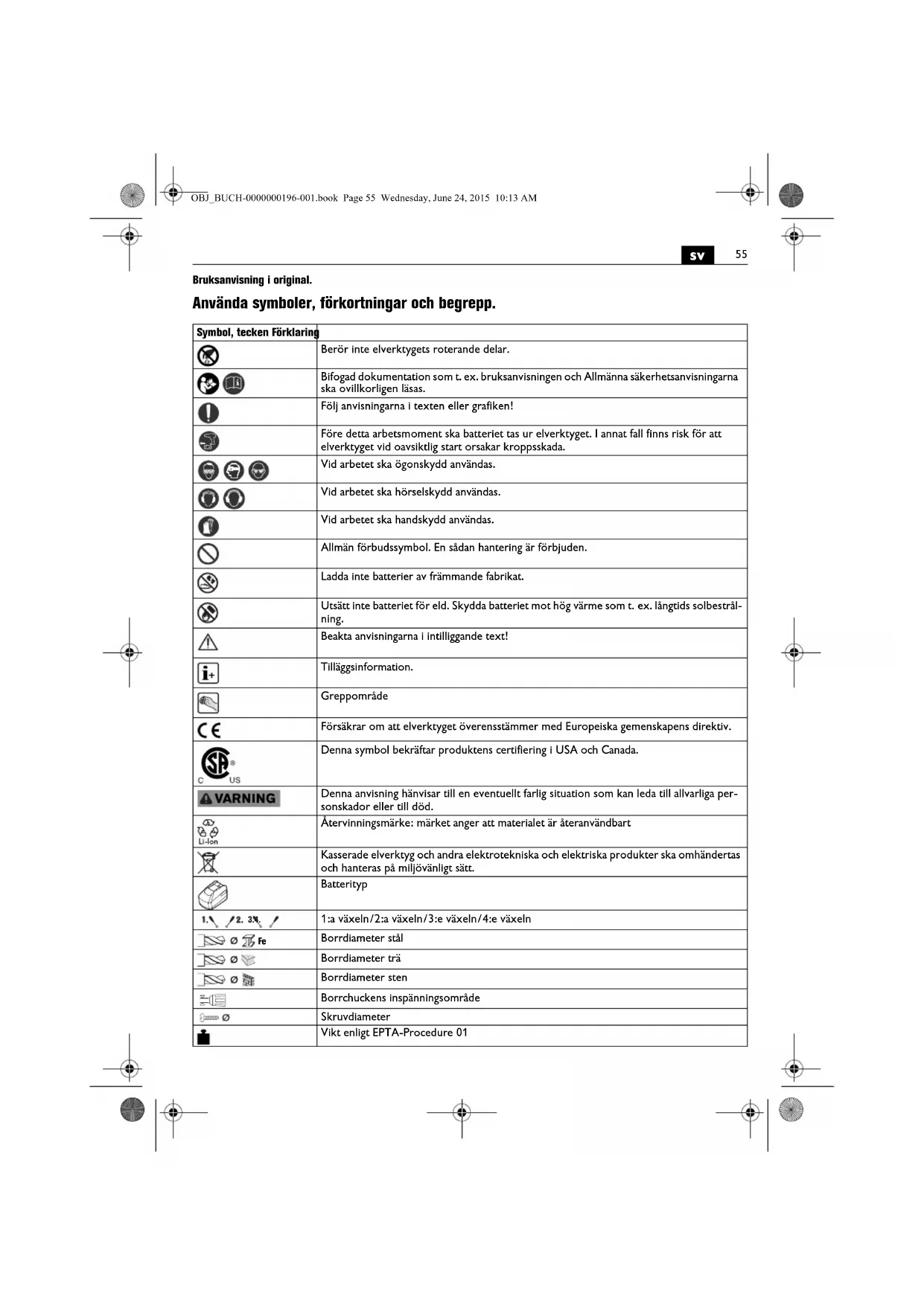 Använd endastelfria original FEIN-batterier som ar avsedda for elverktyget. Vid atgärder pa och laddning av felaktiga, skadade, reparerade, renoverade, kopierade batterier erller batterier av främande fabrikat finns risk for brand och/eller explosion.
