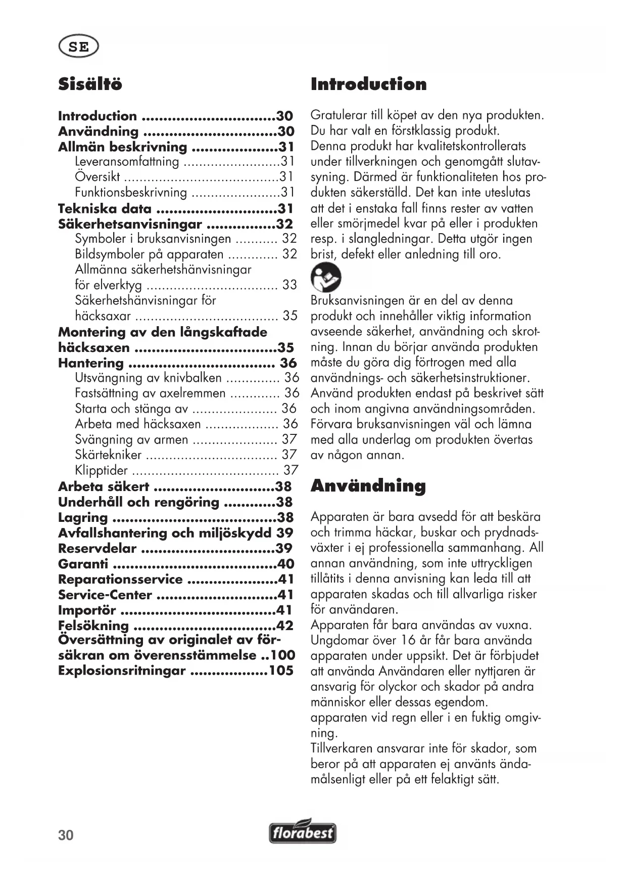 - Introduction Gratulerar till köpet av den nya produkten. Du har valt en förstklassig produkt. Denna produkt har kvalitetskontrollerats under tillverkningen och genomgått slutav- syning. Därmed är funktionaliteten hos pro- dukten säkerställd. Det kan inte uteslutas att det i enstaka fall nns rester av vatten eller smörjmedel kvar på eller i produkten resp. i slangledningar. Detta utgör ingen brist, defekt eller anledning till oro. Bruksanvisningen är en del av denna produkt och innehåller viktig information avseende säkerhet, användning och skrot- ning. Innan du börjar använda produkten måste du göra dig förtrogen med alla användnings- och säkerhetsinstruktioner. Använd produkten endast på beskrivet sätt och inom angivna användningsområden. Förvara bruksanvisningen väl och lämna med alla underlag om produkten övertas av någon annan. Användning Apparaten är bara avsedd för att beskära och trimma häckar, buskar och prydnads- växter i ej professionella sammanhang. All annan användning, som inte uttryckligen tillåtits i denna anvisning kan leda till att apparaten skadas och till allvarliga risker för användaren. Apparaten får bara användas av vuxna. Ungdomar över 16 år får bara använda apparaten under uppsikt. Det är förbjudet att använda Användaren eller nyttjaren är ansvarig för olyckor och skador på andra människor eller dessas egendom. apparaten vid regn eller i en fuktig omgiv- ning. Tillverkaren ansvarar inte för skador, som beror på att apparaten ej använts ända- målsenligt eller på ett felaktigt sätt. Sisältö Introduction p. 30