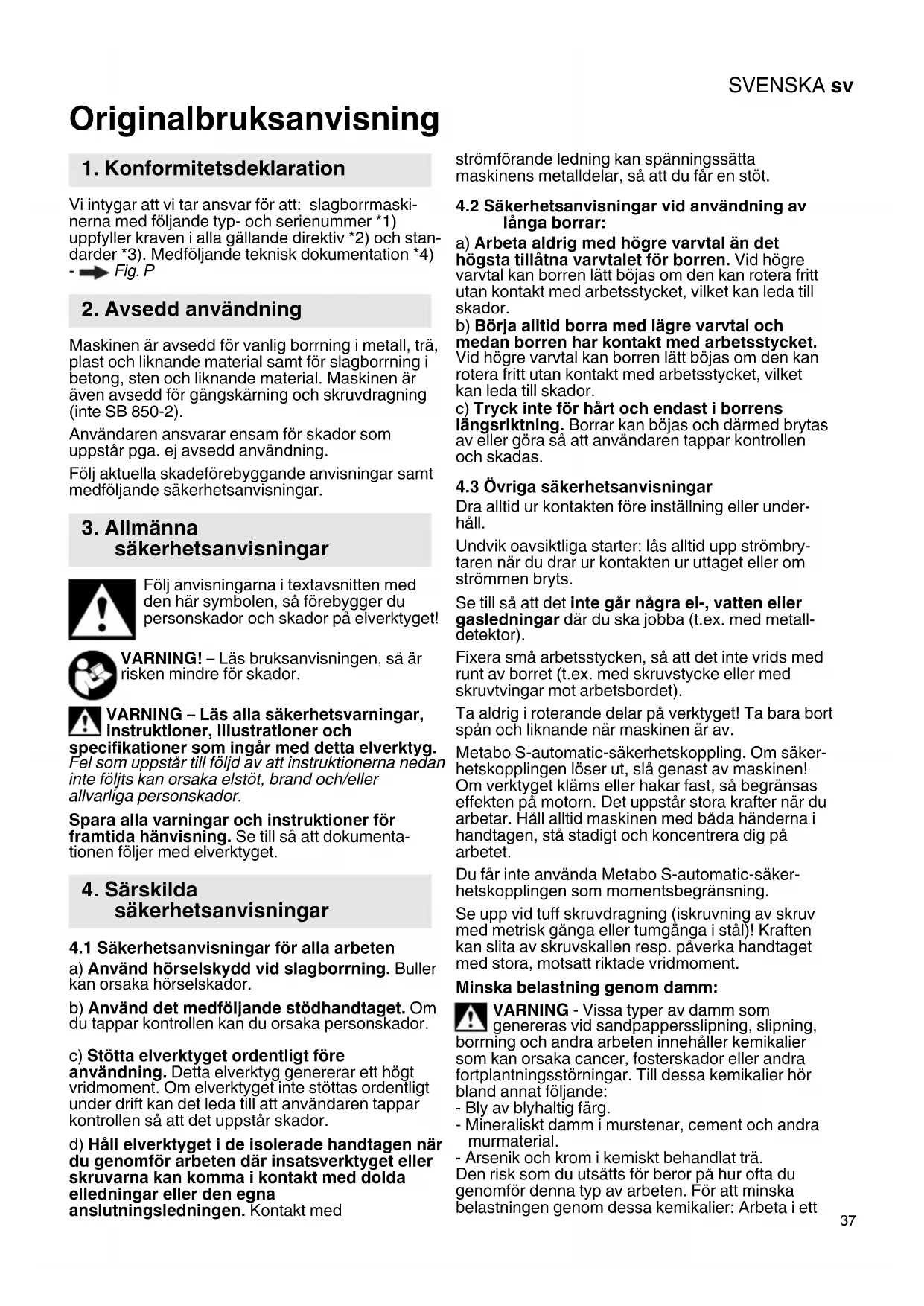 Metabo S-automatic-säkerhetskoppling. Om säkerhetskopplingen löser ut, slå genast av maskinen! Om verktyget kläms eller hakar fast, så begränsas effekten på motorn. Det uppstår stora krafter när du arbetar. Håll alltid maskinen med båda händerna i handtagen, stå stadigt och koncentrera dig på arbetet.