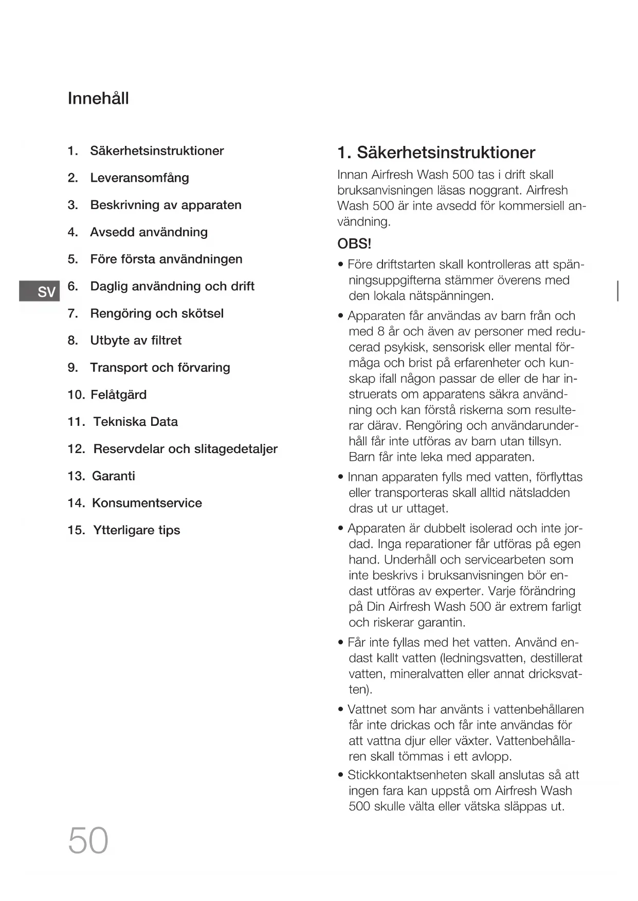 Innan Airfresh Wash 500 tas i drift skall bruksanvisningen läsas noggrant. Airfresh Wash 500 är inte avsedd för kommersiell an- vändning. OBS!