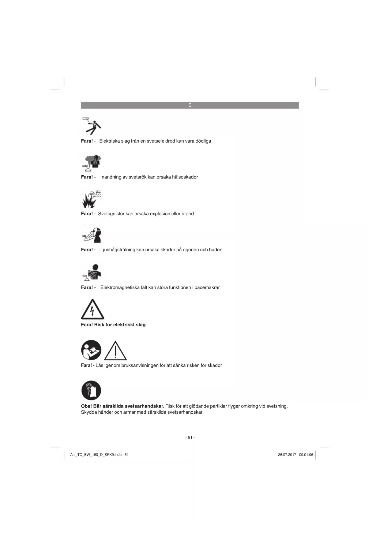 Fara! - Elektriska slag från en svetselektrod kan vara dödliga Fara! - Inandning av svetsrök kan orsaka hälsoskador Fara! - Ljusbågstrålning kan orsaka skador på ögonen och huden. Fara! - Svetsgnistor kan orsaka explosion eller brand Fara! - Elektromagnetiska fält kan störa funktionen i pacemakrar Fara! Risk för elektriskt slag Fara! - Läs igenom bruksanvisningen för att sänka risken för skador Obs! Bär särskilda svetsarhandskar. Risk för att glödande partiklar fl yger omkring vid svetsning. Skydda händer och armar med särskilda svetsarhandskar. Anl_TC_EW_160_D_SPK9.indb 51Anl_TC_EW_160_D_SPK9.indb 51 26.07.2017 09:01:0626.07.2017 09:01:06S