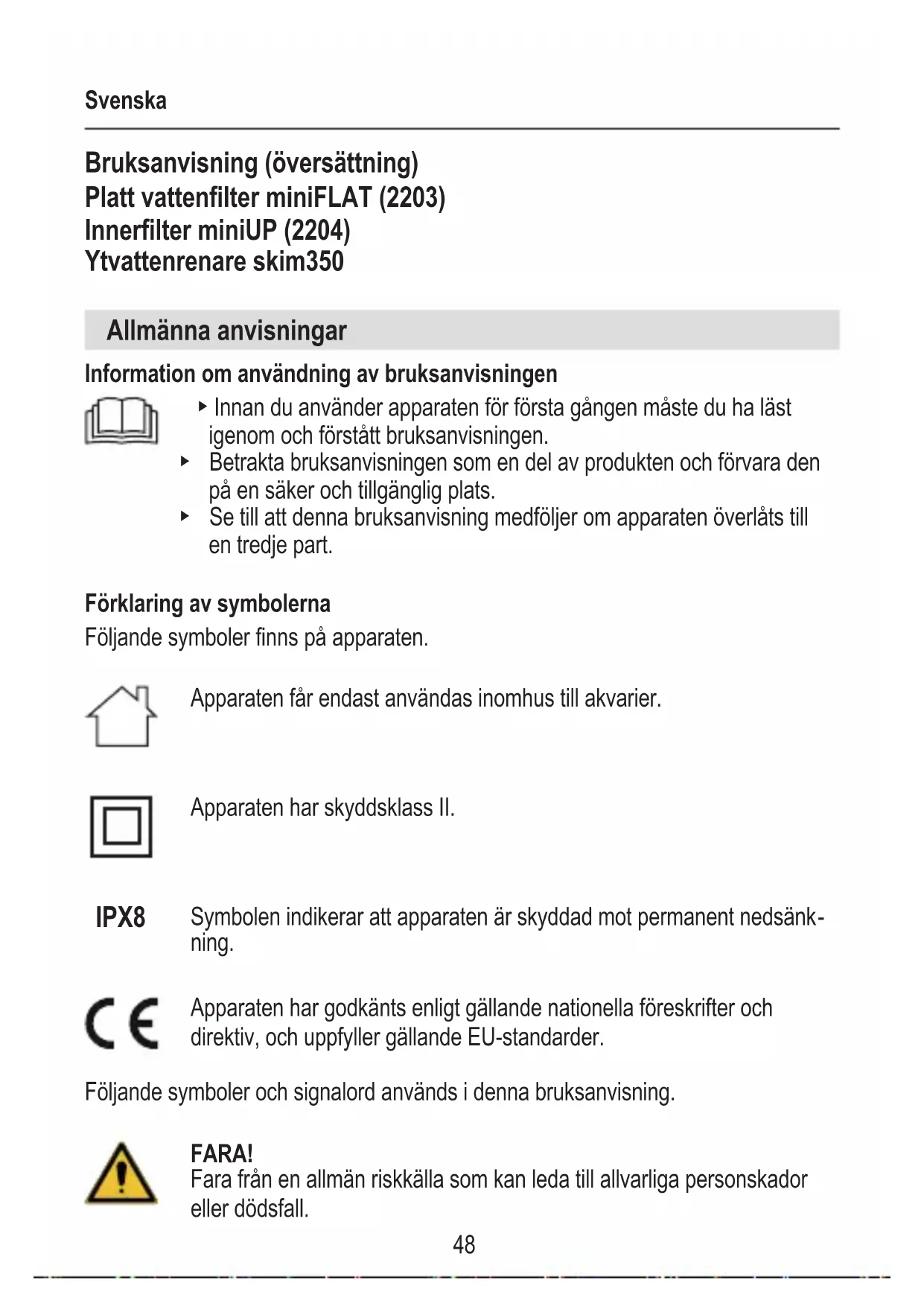ning. Apparaten har godkänts enligt gällande nationella föreskrifter och direktiv, och uppfyller gällande EU-standarder. Följande symboler och signalord används i denna bruksanvisning. FARA! Fara från en allmän riskkälla som kan leda till allvarliga personskador eller dödsfall. IPX8Svenska