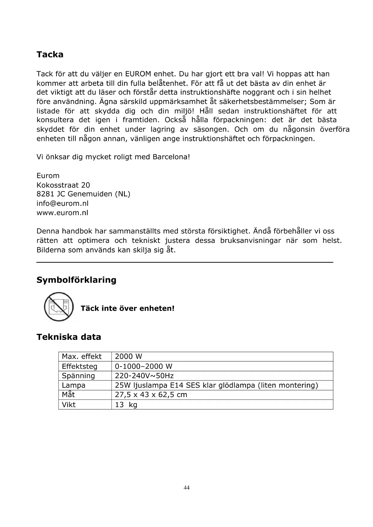 Tacka Tack för att du väljer en EUROM enhet. Du har gjort ett bra val! Vi hoppas att han kommer att arbeta till din fulla belåtenhet. För att få ut det bästa av din enhet är det viktigt att du läser och förstår detta instruktionshäfte noggrant och i sin helhet före användning. Ägna särskild uppmärksamhet åt säkerhetsbestämmelser; Som är listade för att skydda dig och din miljö! Håll sedan instruktionshäftet för att konsultera det igen i framtiden. Också hålla förpackningen: det är det bästa skyddet för din enhet under lagring av säsongen. Och om du någonsin överföra enheten till någon annan, vänligen ange instruktionshäftet och förpackningen. Vi önksar dig mycket roligt med Barcelona! Eurom Kokosstraat 20 8281 JC Genemuiden (NL) info@eurom.nl www.eurom.nl Denna handbok har sammanställts med största försiktighet. Ändå förbehåller vi oss rätten att optimera och tekniskt justera dessa bruksanvisningar när som helst. Bilderna som används kan skilja sig åt.