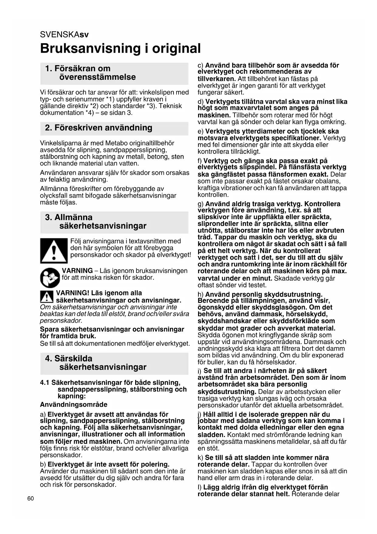 Bruksanvisning i original Vi försäkrar och tar ansvar för att: vinkelslipen med typ- och serienummer *1) uppfyller kraven i gällande direktiv *2) och standarder *3). Teknisk dokumentation *4) – se sidan 3. Vinkelsliparna är med Metabo originaltillbehör avsedda för slipning, sandpappersslipning, stålborstning och kapning av metall, betong, sten och liknande material utan vatten. Användaren ansvarar själv för skador som orsakas av felaktig användning. Allmänna föreskrifter om förebyggande av olycksfall samt bifogade säkerhetsanvisningar måste följas. Följ anvisningarna i textavsnitten med den här symbolen för att förebygga personskador och skador på elverktyget! VARNING – Läs igenom bruksanvisningen för att minska risken för skador. VARNING! Läs igenom alla säkerhetsanvisningar och anvisningar. Om säkerhetsanvisningar och anvisningar inte beaktas kan det leda till elstöt, brand och/eller svåra personskador. Spara säkerhetsanvisningar och anvisningar för framtida bruk. Se till så att dokumentationen medföljer elverktyget.