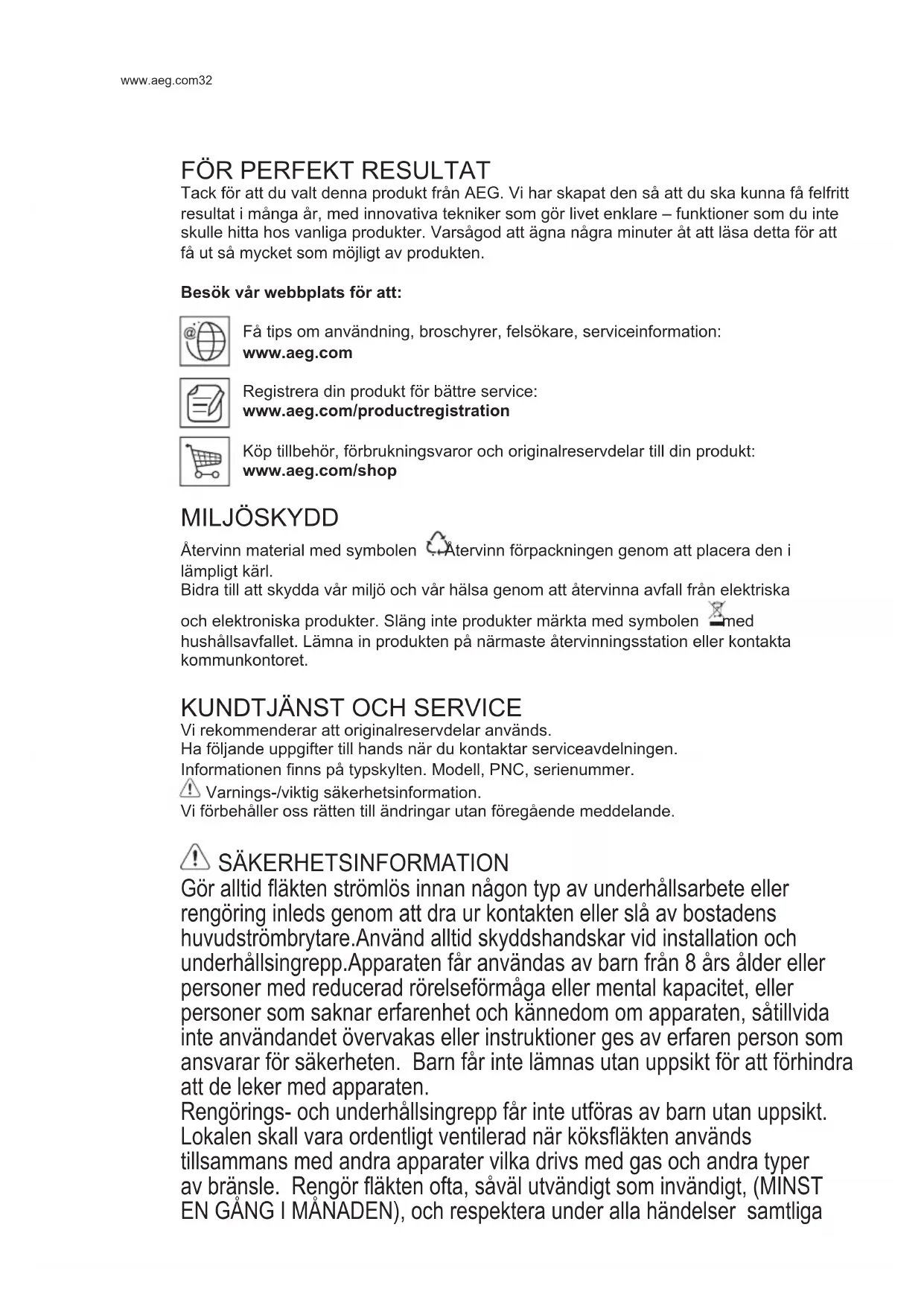 Vi rekommenderar att originalreservdelar används. Ha följande uppgifter till hands när du kontaktar serviceavdelningen. Informationen nns på typskylten. Modell, PNC, serienummer. Varnings-/viktig säkerhetsinformation. Vi förbehåller oss rätten till ändringar utan föregående meddelande. SÄKERHETSINFORMATION Gör alltid äkten strömlös innan någon typ av underhållsarbete eller rengöring inleds genom att dra ur kontakten eller slå av bostadens huvudströmbrytare.Använd alltid skyddshandskar vid installation och underhållsingrepp.Apparaten får användas av barn från 8 års ålder eller personer med reducerad rörelseförmåga eller mental kapacitet, eller personer som saknar erfarenhet och kännedom om apparaten, såtillvida inte användandet övervakas eller instruktioner ges av erfaren person som ansvarar för säkerheten. Barn får inte lämnas utan uppsikt för att förhindra att de leker med apparaten. Rengörings- och underhållsingrepp får inte utföras av barn utan uppsikt. Lokalen skall vara ordentligt ventilerad när köksäkten används tillsammans med andra apparater vilka drivs med gas och andra typer av bränsle. Rengör äkten ofta, såväl utvändigt som invändigt, (MINST EN GÅNG I MÅNADEN), och respektera under alla händelser samtliga