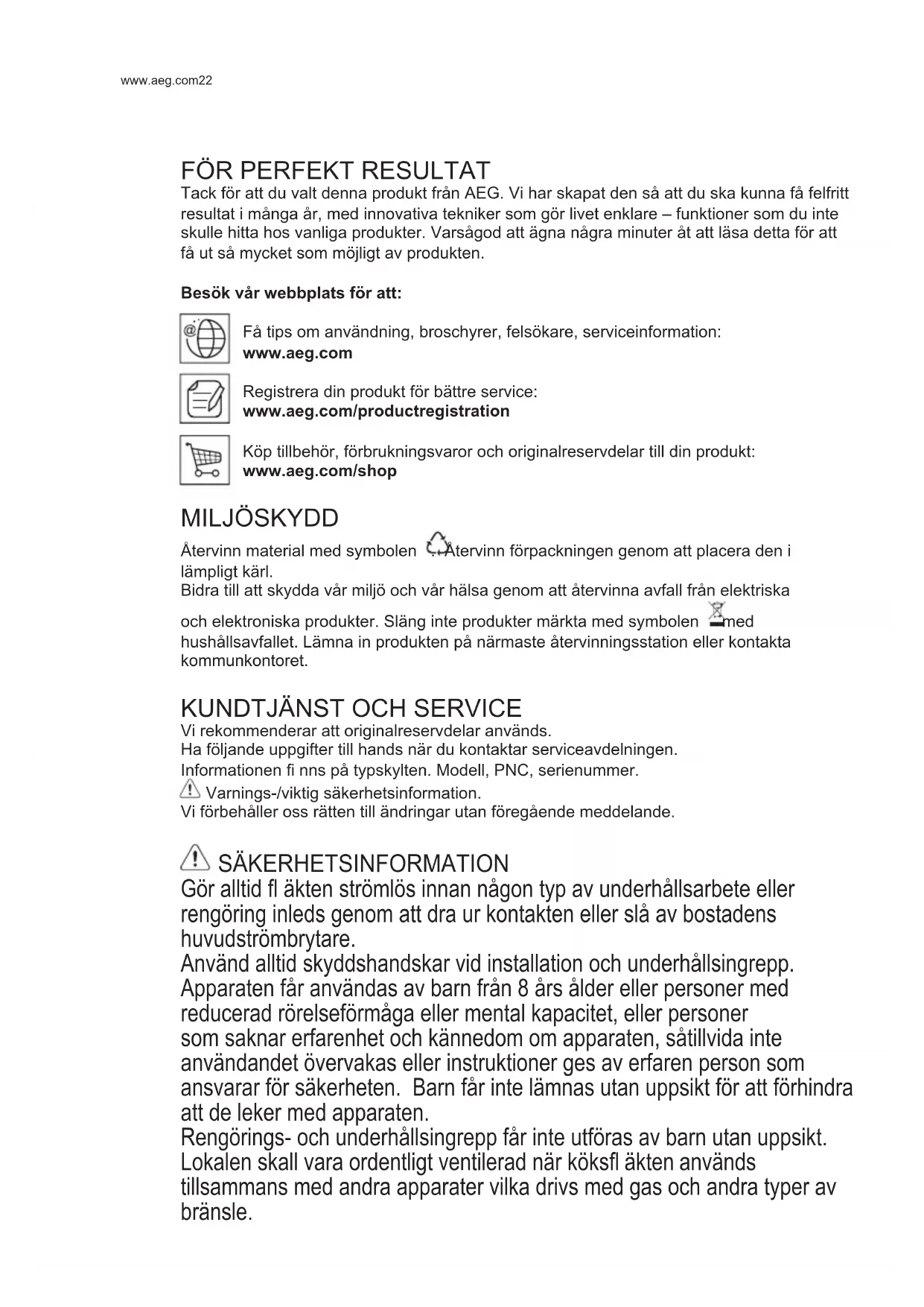 Tack för att du valt denna produkt från AEG. Vi har skapat den så att du ska kunna få felfritt resultat i många år, med innovativa tekniker som gör livet enklare – funktioner som du inte skulle hitta hos vanliga produkter. Varsågod att ägna några minuter åt att läsa detta för att få ut så mycket som möjligt av produkten. Besök vår webbplats för att: Få tips om användning, broschyrer, felsökare, serviceinformation: www.aeg.com Registrera din produkt för bättre service: www.aeg.com/productregistration Köp tillbehör, förbrukningsvaror och originalreservdelar till din produkt: www.aeg.com/shop MILJÖSKYDD Återvinn material med symbolen . Återvinn förpackningen genom att placera den i lämpligt kärl. Bidra till att skydda vår miljö och vår hälsa genom att återvinna avfall från elektriska och elektroniska produkter. Släng inte produkter märkta med symbolen med hushållsavfallet. Lämna in produkten på närmaste återvinningsstation eller kontakta kommunkontoret.