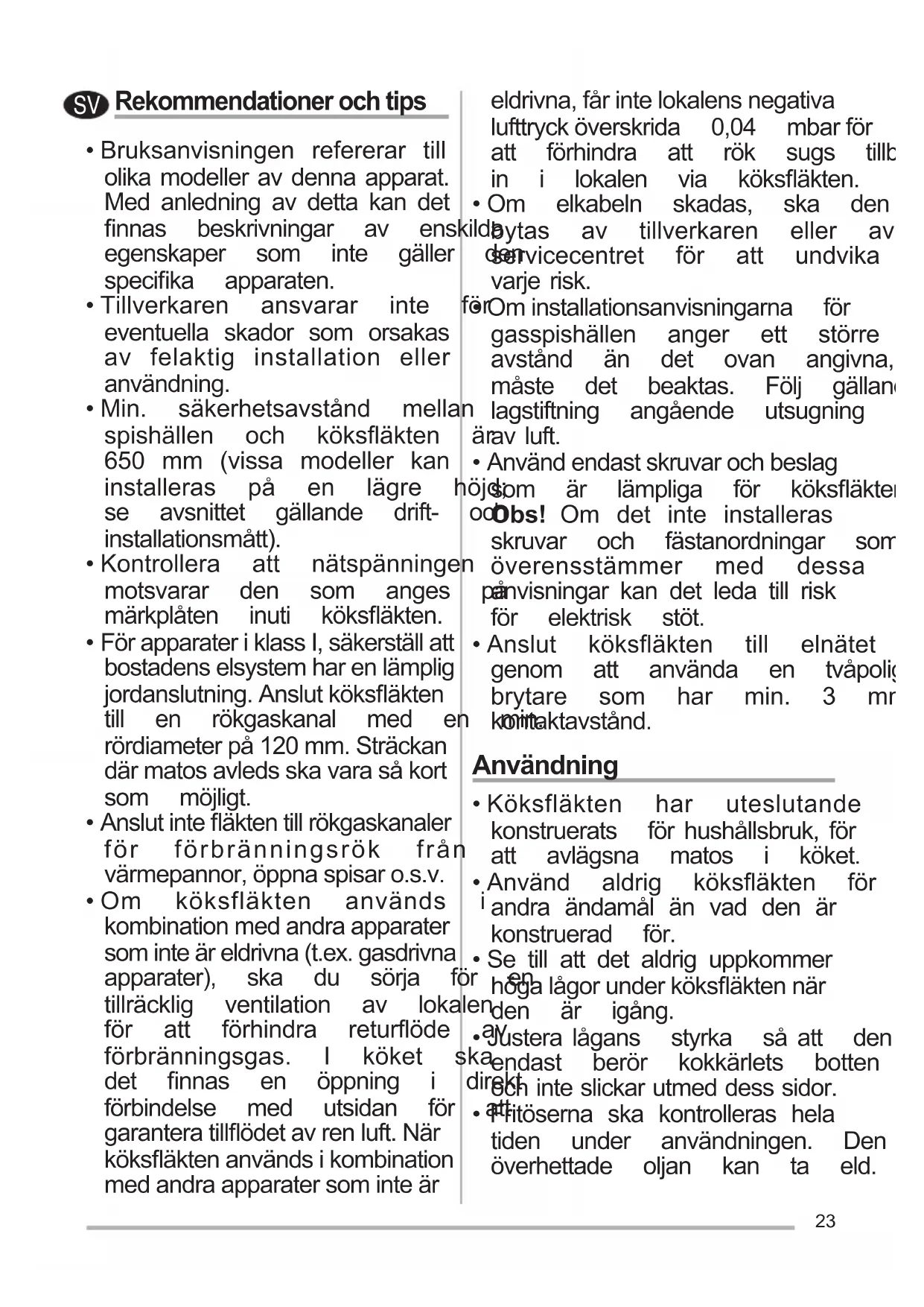 - Om köksfläkten används i kombination med andra apparater sominteäreldrivna(t.ex.gasdrivna apparater), ska du sörja för en tillräcklig ventilation av lokalen för att förhindra returflöde av förbränningsgas. I köket ska det nnas en öppning i direkt förbindelse med utsidan för att garanteratillödetavrenluft.När köksäktenanvändsikombination medandraapparatersominteär eldrivna,fårintelokalensnegativa lufttrycköverskrida 0,04 mbarför att förhindra att rök sugs tillbaka in i lokalen via köksäkten.