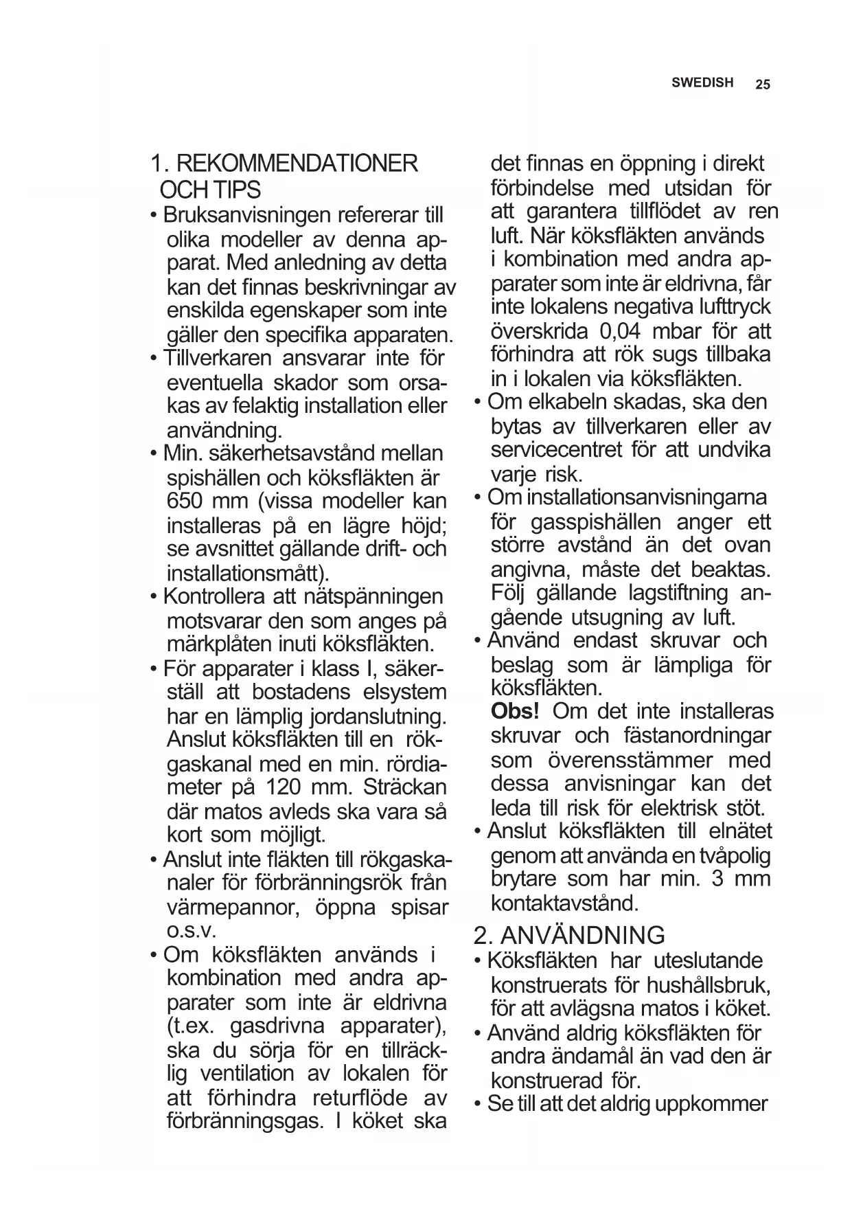 - Om köksäkten används i kombination med andra ap- parater som inte är eldrivna (t.ex. gasdrivna apparater), ska du sörja för en tillräck- lig ventilation av lokalen för att förhindra returflöde av förbränningsgas. I köket ska det nnas en öppning i direkt förbindelse med utsidan för att garantera tillödet av ren luft. När köksäkten används i kombination med andra ap- parater som inte är eldrivna, får inte lokalens negativa lufttryck överskrida 0,04 mbar för att förhindra att rök sugs tillbaka in i lokalen via köksäkten.