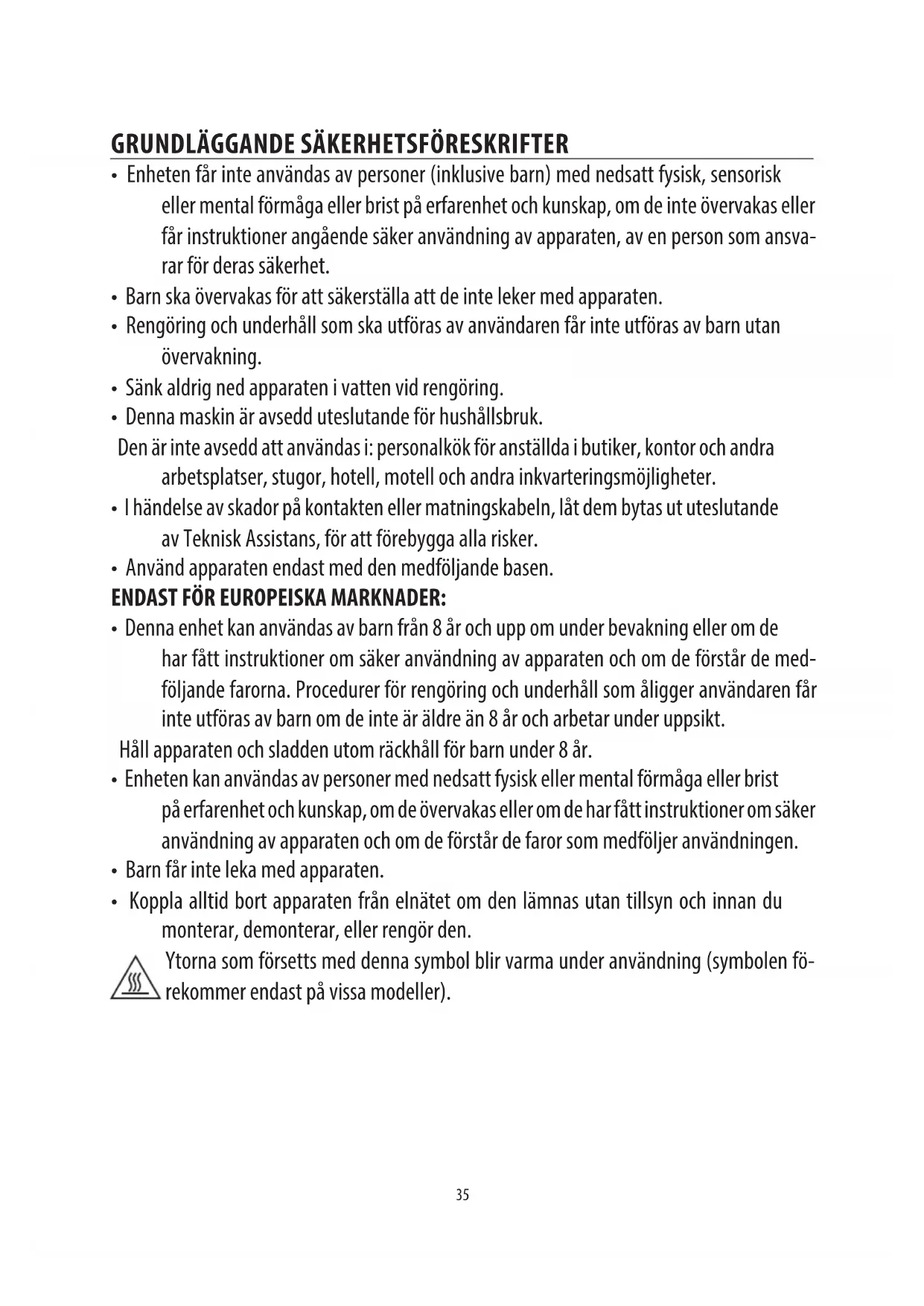 - Koppla alltid bort apparaten från elnätet om den lämnas utan tillsyn och innan du monterar, demonterar, eller rengör den. Ytorna som försetts med denna symbol blir varma under användning (symbolen fö- rekommer endast på vissa modeller).36 SÄKERHETSANVISNINGAR Symboler som används i dessa instruktioner De viktiga varningarna är försedda med följande symboler. Det är absolut nödvändigt att observera dessa varningar. Fara! Underlåtenhet att iaktta dessa anvisningar, kan orsaka skador genom elektriska stötar med fara för livet som följd. Varning! Underlåtenhet att iaktta denna varning, kan vara eller är orsak till personskador eller skador på maskinen. Fara för Brännskador! Underlåtenhet att iaktta denna varning, kan vara eller är orsa- ken till brännskador. Observera: Denna symbol markerar råd och viktiga informationer för användaren. Fara! Eftersom maskinen fungerar med elektrisk ström, är det inte möjligt att utesluta att den kan orsaka elektriska stötar. Följ därför följande säkerhetsanvisningar: