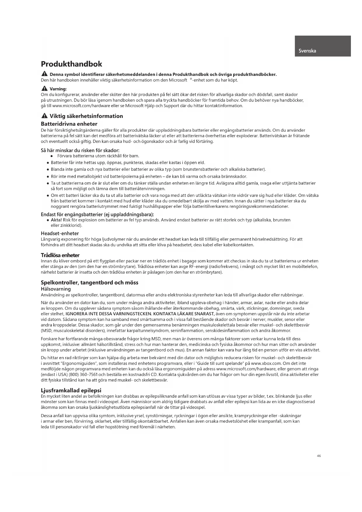 -enhet som du har köpt. Varning: Om du konfi gurerar, använder eller sköter den här produkten på fel sätt ökar det risken för allvarliga skador och dödsfall, samt skador på utrustningen. Du bör läsa igenom handboken och spara alla tryckta handböcker för framtida behov. Om du behöver nya handböcker, gå till www.microsoft.com/hardware eller se Microsoft Hjälp och Support där du hittar kontaktinformation. Viktig säkerhetsinformation Batteridrivna enheter De här försiktighetsåtgärderna gäller för alla produkter där uppladdningsbara batterier eller engångsbatterier används. Om du använder batterierna på fel sätt kan det medföra att batterivätska läcker ut eller att batterierna överhettas eller exploderar. Batterivätskan är frätande och eventuellt också giftig. Den kan orsaka hud- och ögonskador och är farlig vid förtäring. Så här minskar du risken för skador: ● Förvara batterierna utom räckhåll för barn. ● Batterier får inte hettas upp, öppnas, punkteras, skadas eller kastas i öppen eld. ● Blanda inte gamla och nya batterier eller batterier av olika typ (som brunstensbatterier och alkaliska batterier). ● Rör inte med metallobjekt vid batteripolerna på enheten – de kan bli varma och orsaka brännskador. ● Ta ut batterierna om de är slut eller om du tänker ställa undan enheten en längre tid. Avlägsna alltid gamla, svaga eller uttjänta batterier så fort som möjligt och lämna dem till batteriåtervinningen. ● Om ett batteri läcker ska du ta ut alla batterier och vara noga med att den utläckta vätskan inte vidrör vare sig hud eller kläder. Om vätska från batteriet kommer i kontakt med hud eller kläder ska du omedelbart skölja av med vatten. Innan du sätter i nya batterier ska du noggrant rengöra batteriutrymmet med fuktigt hushållspapper eller följa batteritillverkarens rengöringsrekommendationer. Endast för engångsbatterier (ej uppladdningsbara): ● Akta! Risk för explosion om batterier av fel typ används. Använd endast batterier av rätt storlek och typ (alkaliska, brunsten eller zinkklorid). Headset-enheter Långvarig exponering för höga ljudvolymer när du använder ett headset kan leda till tillfällig eller permanent hörselnedsättning. För att förhindra att ditt headset skadas ska du undvika att sitta eller kliva på headsetet, dess kabel eller kabelkontakten. Trådlösa enheter Innan du kliver ombord på ett fl ygplan eller packar ner en trådlös enhet i bagage som kommer att checkas in ska du ta ut batterierna ur enheten eller stänga av den (om den har en strömbrytare). Trådlösa enheter kan avge RF-energi (radiofrekvens), i mångt och mycket likt en mobiltelefon, närhelst batterier är insatta och den trådlösa enheten är påslagen (om den har en strömbrytare). Spelkontroller, tangentbord och möss Hälsovarning Användning av spelkontroller, tangentbord, datormus eller andra elektroniska styrenheter kan leda till allvarliga skador eller rubbningar. När du använder en dator kan du, som under många andra aktiviteter, ibland uppleva obehag i händer, armar, axlar, nacke eller andra delar av kroppen. Om du upplever sådana symptom såsom ihållande eller återkommande obehag, smärta, värk, stickningar, domningar, sveda eller stelhet, IGNORERA INTE DESSA VARNINGSTECKEN. KONTAKTA LÄKARE SNARAST, även om symptomen uppstår när du inte arbetar vid datorn. Sådana symptom kan ha samband med smärtsamma och i vissa fall bestående skador och besvär i nerver, muskler, senor eller andra kroppsdelar. Dessa skador, som går under den gemensamma benämningen muskuloskelettala besvär eller muskel- och skelettbesvär (MSD, musculoskeletal disorders), innefattar karpaltunnelsyndrom, seninfl ammation, senskidesinfl ammation och andra åkommor. Forskare har fortfarande många obesvarade frågor kring MSD, men man är överens om många faktorer som verkar kunna leda till dess uppkomst, inklusive: allmänt hälsotillstånd, stress och hur man hanterar den, medicinska och fysiska åkommor och hur man sitter och använder sin kropp under arbetet (inklusive användningen av tangentbord och mus). En annan faktor kan vara hur lång tid en person utför en viss aktivitet. Du hittar en rad riktlinjer som kan hjälpa dig arbeta mer bekvämt med din dator och möjligtvis reducera risken för muskel- och skelettbesvär i avsnittet ”Ergonomiguiden”, som installeras med enhetens programvara, eller i ”Guide till sunt spelande” på www.xbox.com. Om det inte medföljde någon programvara med enheten kan du också läsa ergonomiguiden på adress www.microsoft.com/hardware, eller genom att ringa (endast i USA) (800) 360-7561 och beställa en kostnadsfri CD. Kontakta sjukvården om du har frågor om hur din egen livsstil, dina aktiviteter eller ditt fysiska tillstånd kan ha att göra med muskel- och skelettbesvär. Ljusframkallad epilepsi En mycket liten andel av befolkningen kan drabbas av epilepsiliknande anfall som kan utlösas av vissa typer av bilder, t.ex. blinkande ljus eller mönster som kan fi nnas med i videospel. Även människor som aldrig tidigare drabbats av anfall eller epilepsi kan lida av en icke diagnostiserad åkomma som kan orsaka ljuskänslighetsutlösta epilepsianfall när de tittar på videospel. Dessa anfall kan uppvisa olika symtom, inklusive yrsel, synstörningar, ryckningar i ögon eller ansikte, krampryckningar eller -skakningar i armar eller ben, förvirring, oklarhet, eller tillfällig okontaktbarhet. Anfallen kan även orsaka medvetslöshet eller krampanfall, som kan leda till personskador vid fall eller hopstötning med föremål i närheten. Svenska47 Om du upplever något av dessa symptom ska du omedelbart sluta spela och uppsöka en läkare. Föräldrar ska hålla uppsikt över eller fråga sina barn om de upplevt något av ovan nämnda symptom – det är vanligare att barn och ungdomar drabbas av dessa anfall än vuxna. Du kan minska risken att drabbas av ljus