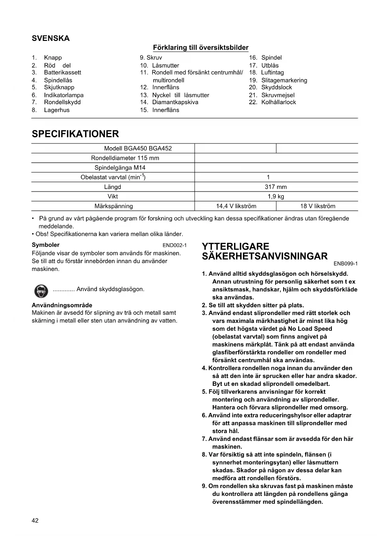 - Obs! Specifikationerna kan variera mellan olika länder. Symboler END002-1 Följande visar de symboler som används för maskinen. Se till att du förstår innebörden innan du använder maskinen. ............. Använd skyddsglasögon. Användningsområde Makinen är avsedd för slipning av trä och metall samt skärning i metall eller sten utan användning av vatten. YTTERLIGARE SÄKERHETSANVISNINGAR ENB099-1