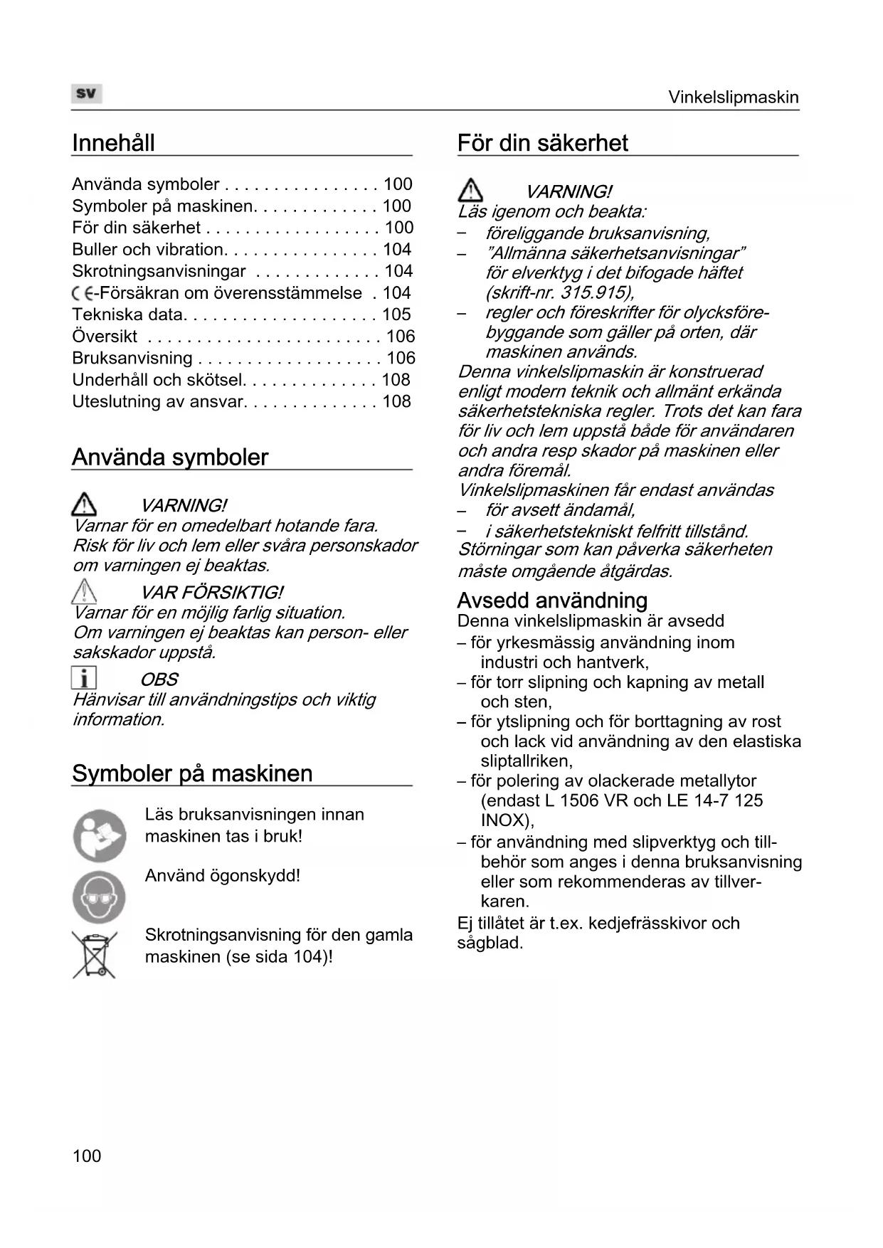 - Uteslutning av ansvar Använda symboler VARNING! Varnar för en omedelbart hotande fara. Risk för liv och lem eller svåra personskador om varningen ej beaktas. VAR FÖRSIKTIG! Varnar för en möjlig farlig situation. Om varningen ej beaktas kan person- eller sakskador uppstå. OBS Hänvisar till användningstips och viktig information. Symboler på maskinen Läs bruksanvisningen innan maskinen tas i bruk! Använd ögonskydd! Skrotningsanvisning för den gamla maskinen (se sida 104)! För din säkerhet VARNING! Läs igenom och beakta: p. 108