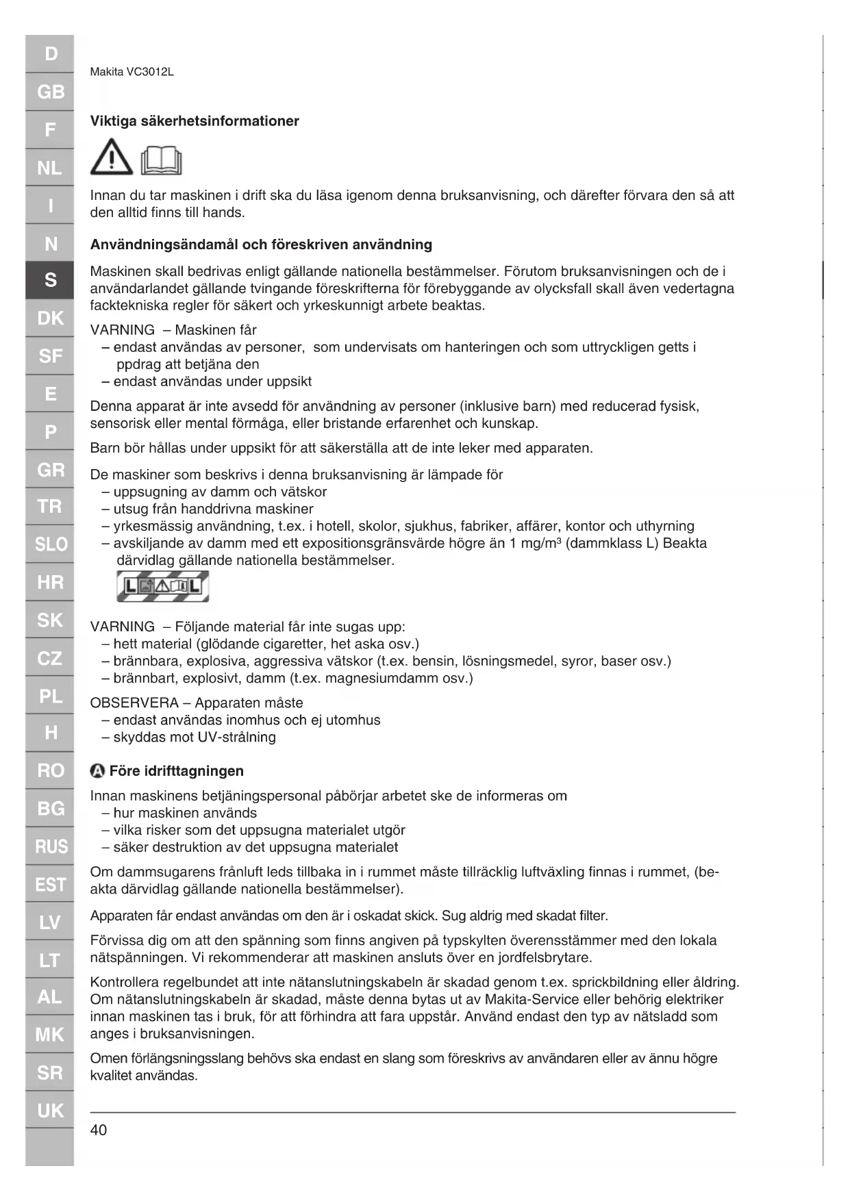 Makita VC3012L Viktiga säkerhetsinformationer Innan du tar maskinen i drift ska du läsa igenom denna bruksanvisning, och därefter förvara den så att den alltid finns till hands. Användningsändamål och föreskriven användning Maskinen skall bedrivas enligt gällande nationella bestämmelser. Förutom bruksanvisningen och de i användarlandet gällande tvingande föreskrifterna för förebyggande av olycksfall skall även vedertagna facktekniska regler för säkert och yrkeskunnigt arbete beaktas. VARNING – Maskinen får – endast användas av personer, som undervisats om hanteringen och som uttryckligen getts i ppdrag att betjäna den – endast användas under uppsikt Denna apparat är inte avsedd för användning av personer (inklusive barn) med reducerad fysisk, sensorisk eller mental förmåga, eller bristande erfarenhet och kunskap. Barn bör hållas under uppsikt för att säkerställa att de inte leker med apparaten. De maskiner som beskrivs i denna bruksanvisning är lämpade för – uppsugning av damm och vätskor – utsug från handdrivna maskiner – yrkesmässig användning, t.ex. i hotell, skolor, sjukhus, fabriker, affärer, kontor och uthyrning – avskiljande av damm med ett expositionsgränsvärde högre än 1 mg/m³ (dammklass L) Beakta därvidlag gällande nationella bestämmelser. VARNING – Följande material får inte sugas upp: – hett material (glödande cigaretter, het aska osv.) – brännbara, explosiva, aggressiva vätskor (t.ex. bensin, lösningsmedel, syror, baser osv.) – brännbart, explosivt, damm (t.ex. magnesiumdamm osv.) OBSERVERA – Apparaten måste – endast användas inomhus och ej utomhus – skyddas mot UV-strålning Före idrifttagningen Innan maskinens betjäningspersonal påbörjar arbetet ske de informeras om – hur maskinen används – vilka risker som det uppsugna materialet utgör – säker destruktion av det uppsugna materialet Om dammsugarens frånluft leds tillbaka in i rummet måste tillräcklig luftväxling finnas i rummet, (be- akta därvidlag gällande nationella bestämmelser). Apparaten får endast användas om den är i oskadat skick. Sug aldrig med skadat filter. Förvissa dig om att den spänning som finns angiven på typskylten överensstämmer med den lokala nätspänningen. Vi rekommenderar att maskinen ansluts över en jordfelsbrytare. Kontrollera regelbundet att inte nätanslutningskabeln är skadad genom t.ex. sprickbildning eller åldring. Om nätanslutningskabeln är skadad, måste denna bytas ut av Makita-Service eller behörig elektriker innan maskinen tas i bruk, för att förhindra att fara uppstår. Använd endast den typ av nätsladd som anges i bruksanvisningen. Omen förlängsningsslang behövs ska endast en slang som föreskrivs av användaren eller av ännu högre kvalitet användas.D