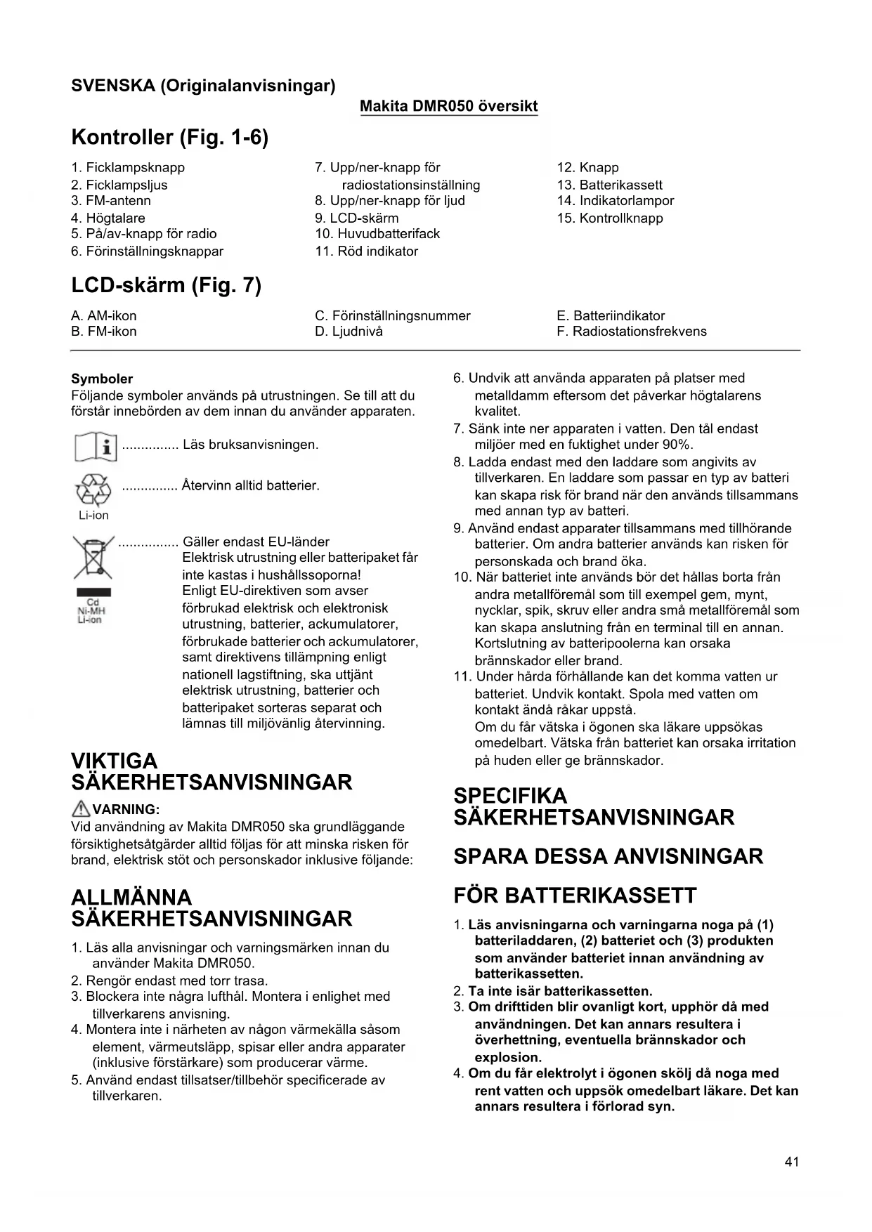 - Brug aldrig benzin, benzen, fortynder, alkohol eller lignende. Det kan muligvis medføre misfarvning, deformation eller revner.41 SVENSKA (Originalanvisningar) Makita DMR050 översikt Kontroller (Fig. 1-6) LCD-skärm (Fig. 7) Symboler Följande symboler används på utrustningen. Se till att du förstår innebörden av dem innan du använder apparaten. ............... Läs bruksanvisningen. ............... Återvinn alltid batterier. ................ Gäller endast EU-länder Elektrisk utrustning eller batteripaket får inte kastas i hushållssoporna! Enligt EU-direktiven som avser förbrukad elektrisk och elektronisk utrustning, batterier, ackumulatorer, förbrukade batterier och ackumulatorer, samt direktivens tillämpning enligt nationell lagstiftning, ska uttjänt elektrisk utrustning, batterier och batteripaket sorteras separat och lämnas till miljövänlig återvinning. VIKTIGA SÄKERHETSANVISNINGAR VARNING: Vid användning av Makita DMR050 ska grundläggande försiktighetsåtgärder alltid följas för att minska risken för brand, elektrisk stöt och personskador inklusive följande: ALLMÄNNA SÄKERHETSANVISNINGAR
