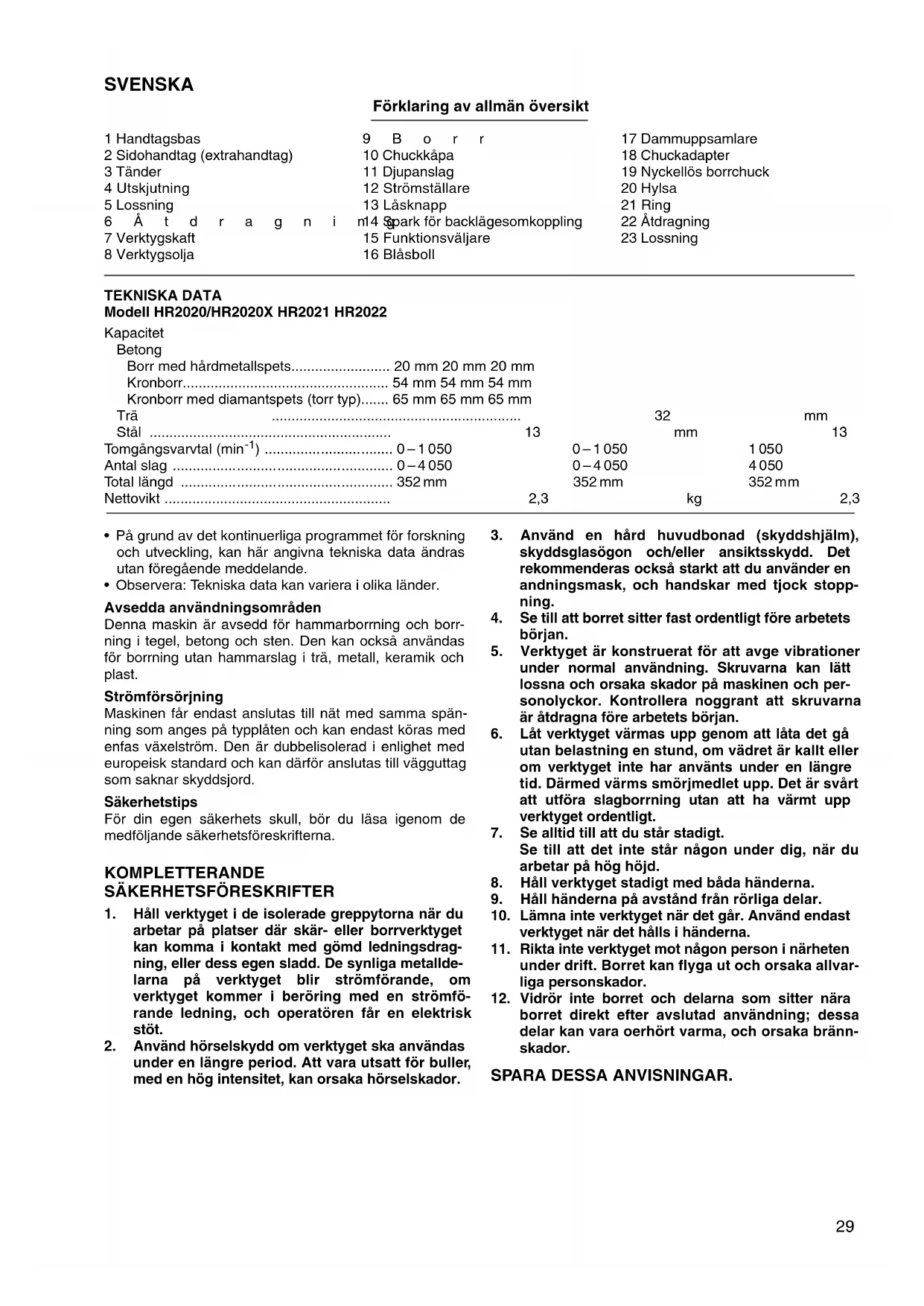 - Observera: Tekniska data kan variera i olika länder. Avsedda användningsområden Denna maskin är avsedd för hammarborrning och borr- ning i tegel, betong och sten. Den kan också användas för borrning utan hammarslag i trä, metall, keramik och plast. Strömförsörjning Maskinen får endast anslutas till nät med samma spän- ning som anges på typplåten och kan endast köras med enfas växelström. Den är dubbelisolerad i enlighet med europeisk standard och kan därför anslutas till vägguttag som saknar skyddsjord. Säkerhetstips För din egen säkerhets skull, bör du läsa igenom de medföljande säkerhetsföreskrifterna. KOMPLETTERANDE
