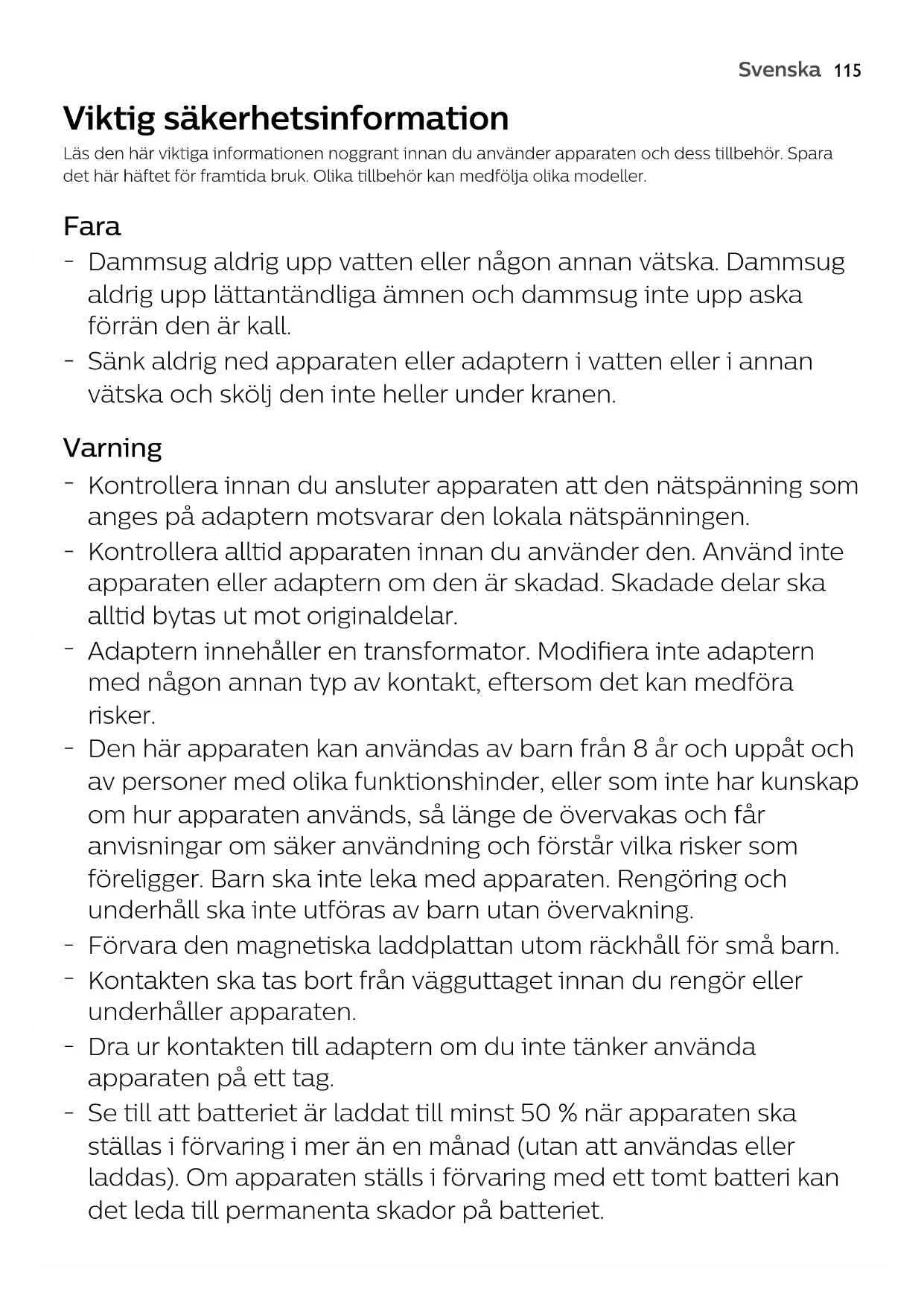 Använd alltid rengöringsdynor från Philips för att vara säker på att apparaten och vattentanken fungerar korrekt samt att bästa resultat uppnås.119 Svenska Säkerhetsföreskrifter för batteri