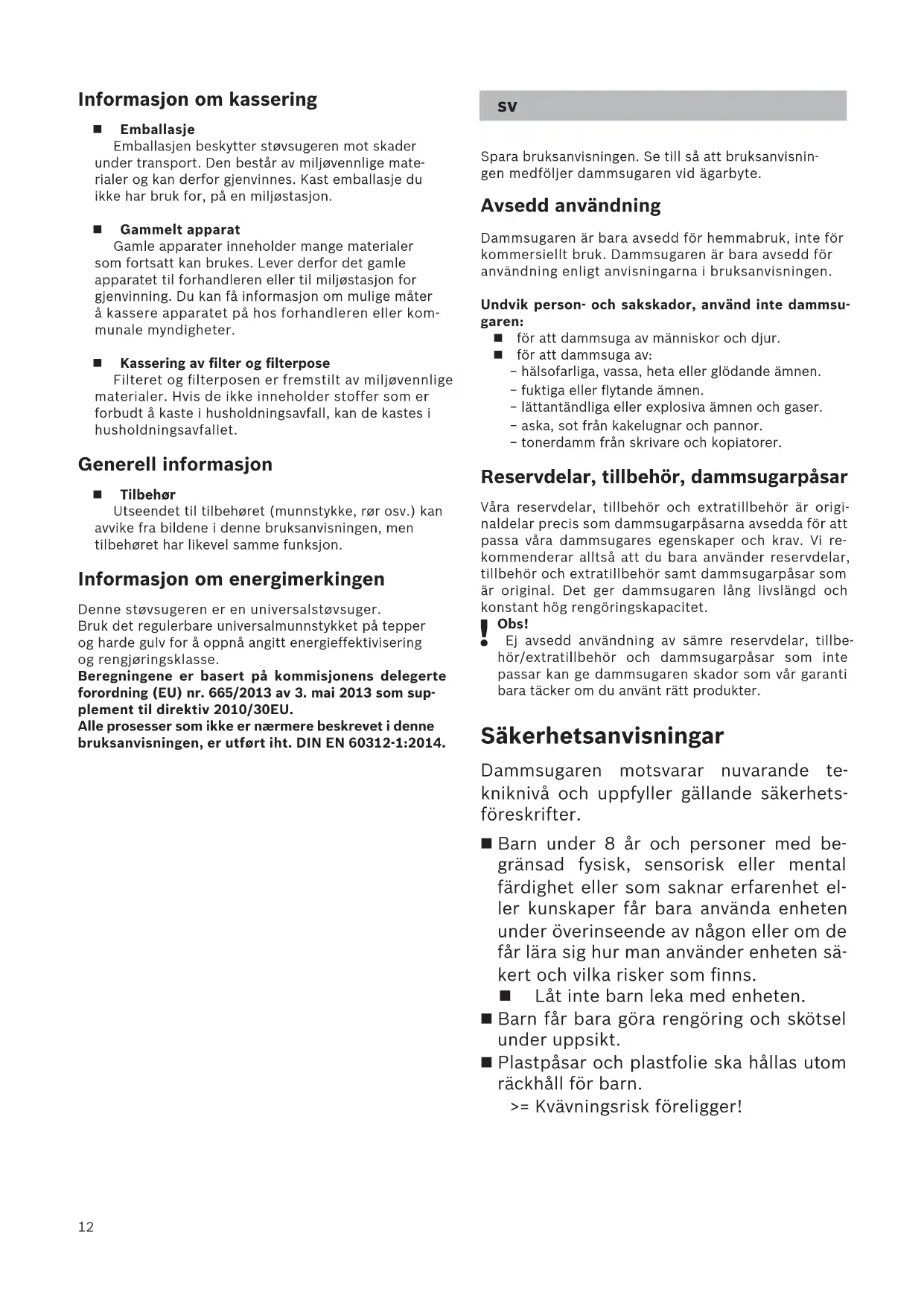 Informasjon om kassering Emballasje Emballasjen beskytter støvsugeren mot skader under transport. Den består av miljøvennlige mate- rialer og kan derfor gjenvinnes. Kast emballasje du ikke har bruk for, på en miljøstasjon. Gammelt apparat Gamle apparater inneholder mange materialer som fortsatt kan brukes. Lever derfor det gamle apparatet til forhandleren eller til miljøstasjon for gjenvinning. Du kan få informasjon om mulige måter å kassere apparatet på hos forhandleren eller kom- munale myndigheter. Kassering av filter og filterpose Filteret og filterposen er fremstilt av miljøvennlige materialer. Hvis de ikke inneholder stoffer som er forbudt å kaste i husholdningsavfall, kan de kastes i husholdningsavfallet. Generell informasjon Tilbehør Utseendet til tilbehøret (munnstykke, rør osv.) kan avvike fra bildene i denne bruksanvisningen, men tilbehøret har likevel samme funksjon. Informasjon om energimerkingen Denne støvsugeren er en universalstøvsuger. Bruk det regulerbare universalmunnstykket på tepper og harde gulv for å oppnå angitt energieffektivisering og rengjøringsklasse. Beregningene er basert på kommisjonens delegerte forordning (EU) nr. 665/2013 av 3. mai 2013 som sup- plement til direktiv 2010/30EU. Alle prosesser som ikke er nærmere beskrevet i denne bruksanvisningen, er utført iht. DIN EN 60312-1:2014.13 Avsedd användning Anslut och använd bara dammsugaren enligt märks- kylten. Dammsug aldrig utan dammsugarpåse resp. -behålla- re, motorskydds- och utblåsfilter. >= Dammsugaren kan skadas! Dammsug aldrig med munstycke eller rör i närheten av huvudet. >= Olycksrisk! Dammsuger du trappor, så ska enheten alltid stå ne- danför användaren. Använd inte sladden för att bära/transportera damm- sugaren. Är sladden till enheten skadad, så är det bara tillver- karen, service eller behörig elektriker som får byta ut den, allt för att undvika skador. Dra ut sladden helt om du ska dammsuga längre än 30 minuter. Dra i kontakten, inte i sladden, när du tar ur elanslut- ningen till dammsugaren. Dra inte sladden över vassa kanter och se till så att den inte blir fastklämd. Se till så att kontakten inte slår emot personer, kroppsdelar, husdjur eller föremål vid automatiskt sladdindrag. => Styr sladden med kontakten. Slå alltid av och dra ur kontakten före arbeten på dammsugaren. Använd inte dammsugaren om den är trasig. Dra ut kontakten ur uttaget om dammsugaren är trasig. Det är bara auktoriserad serviceverkstad som får göra {EXTERNAL}reparationer och byta reservdelar på dammsugaren, allt för att undvika risker i användnin- gen. Skydda dammsugaren från påverkan av väder, fukt och värme. Använd aldrig brännbara eller alkoholhaltiga ämnen på filtren (dammsugarpåse, motorskydds-, utblåsfilter etc). Dammsugaren är inte avsedd för användning på byggarbetsplatser. >= Uppsugning av byggmaterial kan skada enheten. Slå av enheten och dra ur kontakten när du inte damm- suger. Gör uttjänta enheter obrukbara direkt, släng dem se- dan i återvinningen.