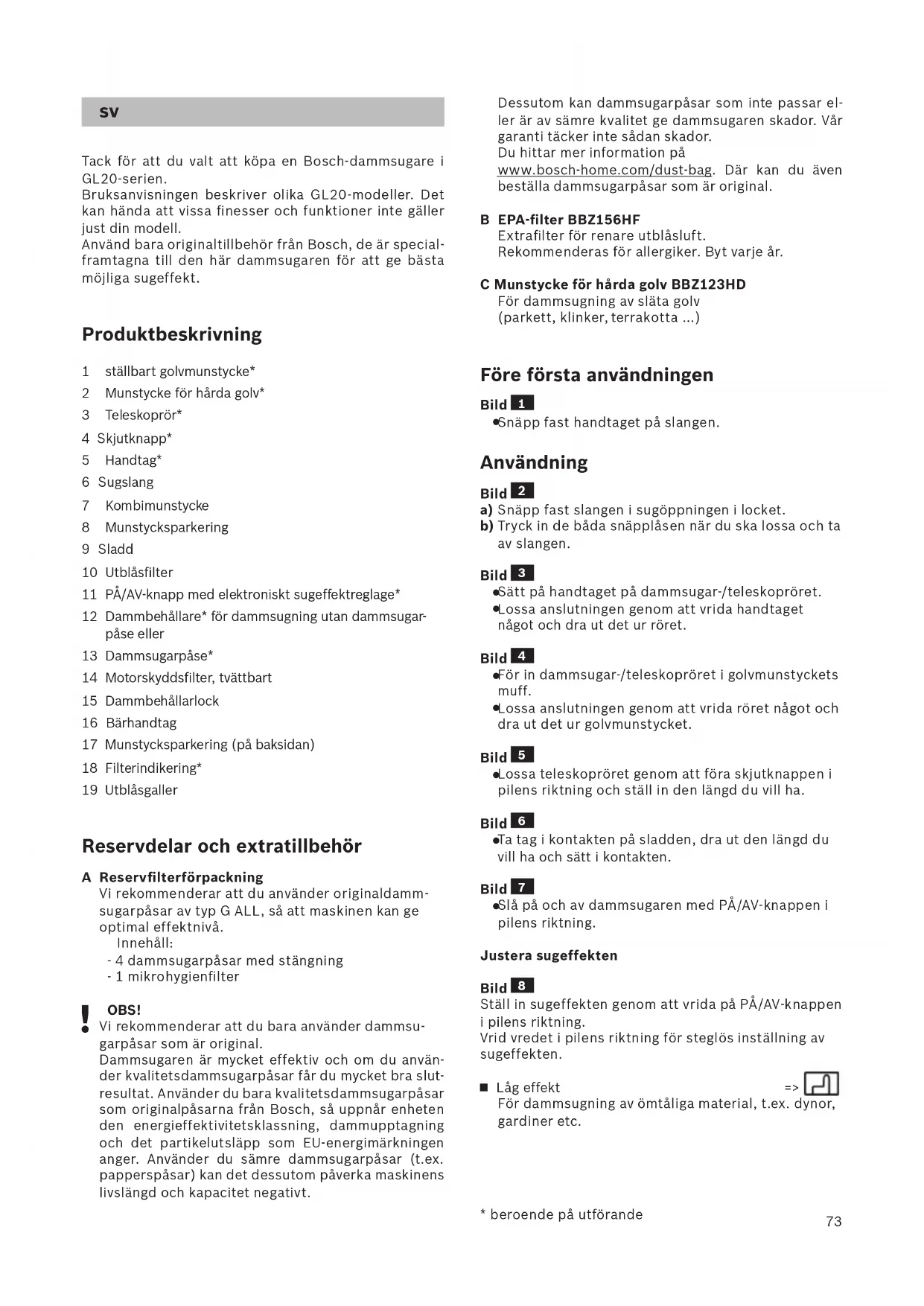 Tack för att du valt att köpa en Bosch-dammsugare i GL20-serien. Bruksanvisningen beskriver olika GL20-modeller. Det kan hända att vissa finesser och funktioner inte gäller just din modell. Använd bara originaltillbehör från Bosch, de är special- framtagna till den här dammsugaren för att ge bästa möjliga sugeffekt. Produktbeskrivning 1 ställbart golvmunstycke* 2 Munstycke för hårda golv* 3 Teleskoprör* 4 Skjutknapp* 5 Handtag* 6 Sugslang 7 Kombimunstycke 8 Munstycksparkering 9 Sladd 10 Utblåsfilter 11 PÅ/AV-knapp med elektroniskt sugeffektreglage* 12 Dammbehållare* för dammsugning utan dammsugar- påse eller 13 Dammsugarpåse* 14 Motorskyddsfilter, tvättbart 15 Dammbehållarlock 16 Bärhandtag 17 Munstycksparkering (på baksidan) 18 Filterindikering* 19 Utblåsgaller Reservdelar och extratillbehör A Reservfilterförpackning Vi rekommenderar att du använder originaldamm- sugarpåsar av typ G ALL, så att maskinen kan ge optimal effektnivå. Innehåll: - 4 dammsugarpåsar med stängning - 1 mikrohygienfilter