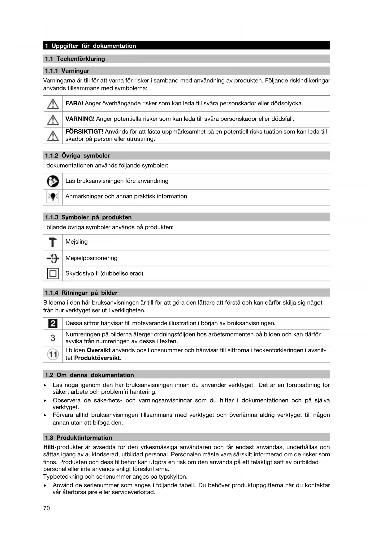 Varningarna är till för att varna för risker i samband med användning av produkten. Följande riskindikeringar används tillsammans med symbolerna: FARA! Anger överhängande risker som kan leda till svåra personskador eller dödsolycka. VARNING! Anger potentiella risker som kan leda till svåra personskador eller dödsfall. FÖRSIKTIGT! Används för att fästa uppmärksamhet på en potentiell risksituation som kan leda till skador på person eller utrustning.
