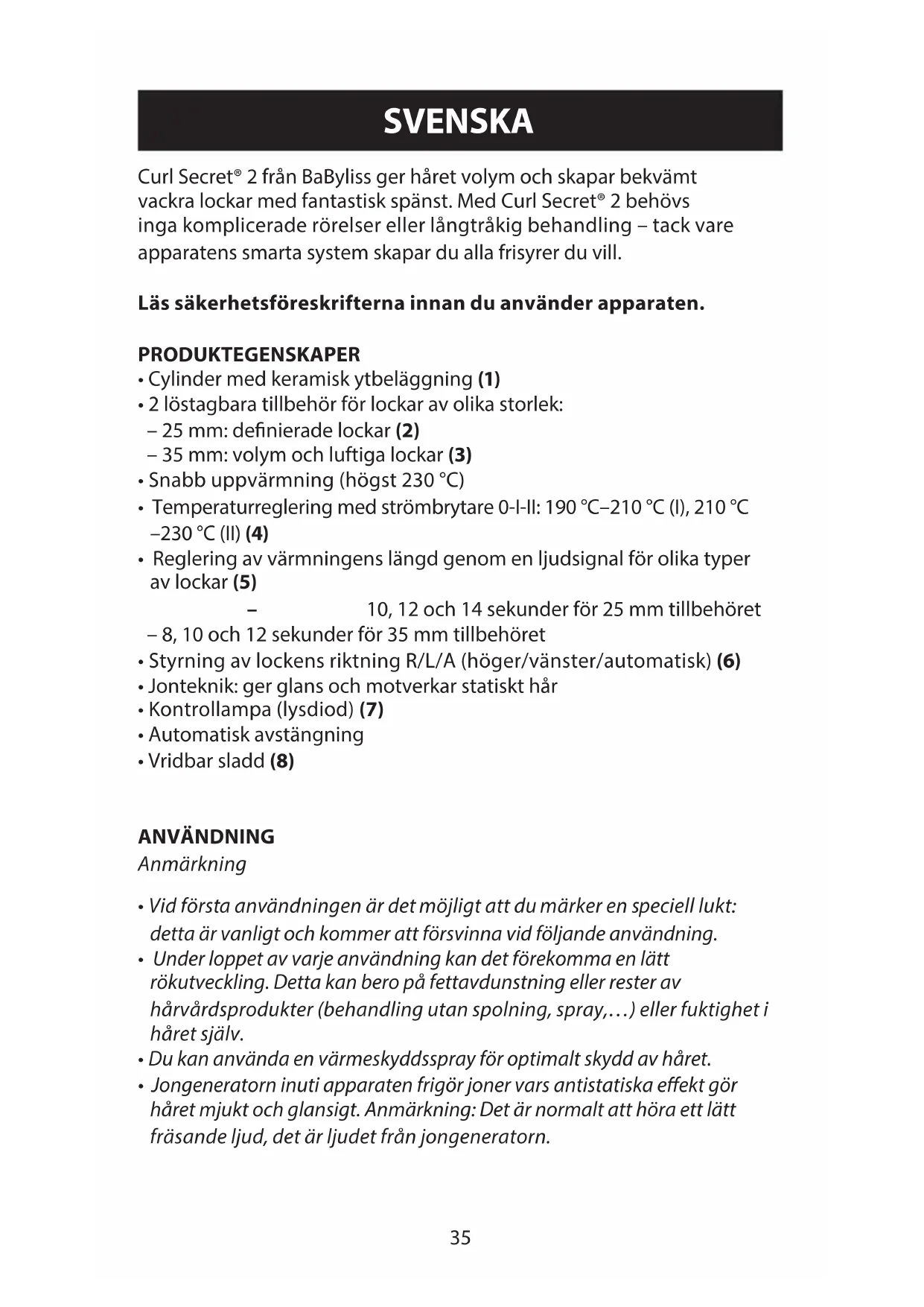 Apparatets ydre kan tørres med en fugtig klud, når det er koldt og stikket er taget ud af kontakten. Kontrollér, at apparatet er helt tørt, inden der tændes for det igen. RC-16_C1300E-no tool_IB.indd 34 18/08/16 09:0935 SVENSKA Curl Secret® 2 från BaByliss ger håret volym och skapar bekvämt vackra lockar med fantastisk spänst. Med Curl Secret® 2 behövs inga komplicerade rörelser eller långtråkig behandling – tack vare apparatens smarta system skapar du alla frisyrer du vill. Läs säkerhetsföreskrifterna innan du använder apparaten. PRODUKTEGENSKAPER