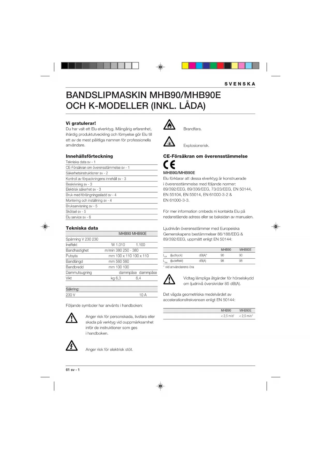 Spänning V 230 230 Ineffekt W 1.010 1.100 Bandhastighet m/min 380 250 - 380 Putsyta mm 100 x 110 100 x 110 Bandlängd mm 560 560 Bandbredd mm 100 100 Dammutsugning dammpåse dammpåse Vikt kg 6,3 6,4 Säkring: 230 V 10 A Följande symboler har använts i handboken: Anger risk för personskada, livsfara eller skada på verktyg vid ouppmärksamhet inför de instruktioner som ges i handboken. Anger risk för elektrisk stöt. Brandfara. Explosionsrisk. CE-Försäkran om överensstämmelse