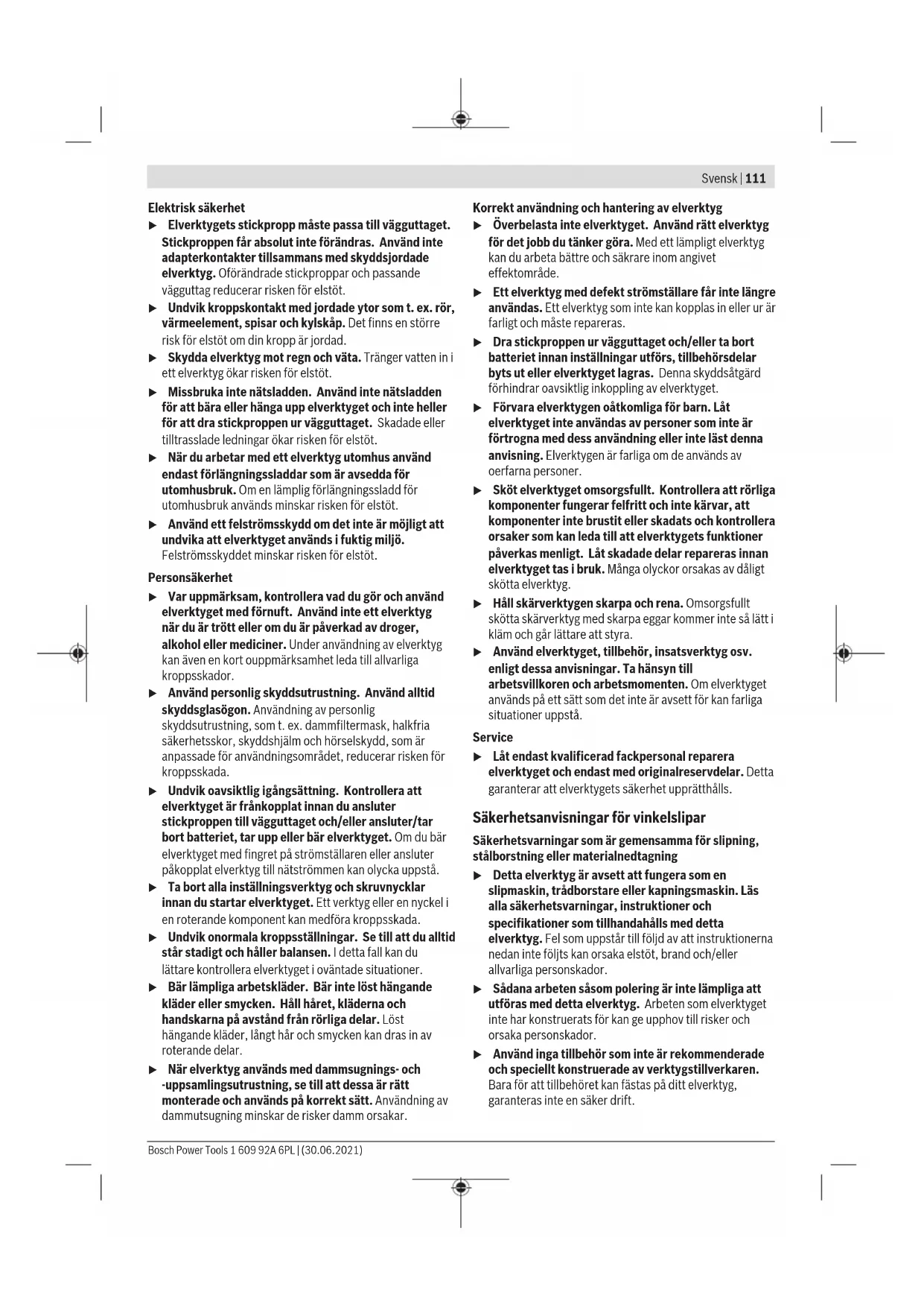 De angivne værdier for hastighedstrin er vejledende værdier. u Tilbehørets mærkehastighed skal minimum svare til den maks. hastighed, der er angivet på el-værktøjet. Tilbehør, der anvendes ved en højere hastighed end mær- kehastigheden, kan gå i stykker og slynges af værktøjet. Arbejdsvejledning u Træk stikket ud af stikkontakten, før der udføres ar- bejde på el‑værktøjet. u Forsigtig ved slidsning i bærende vægge, se afsnittet "Oplysninger om statik". u Fastspænd emnet, hvis det ikke ligger sikkert på grund af sin egenvægt. u Belast ikke el-værktøjet så meget, at det kommer til stilstand. u Lad el-værktøjet køre i tomgang i et par minutter efter stærk belastning, så indsatsværktøjet kan afkøle. u El-værktøjet må ikke benyttes med en skærestander. u Rør ikke ved slibe- og skæreskiverne, før de er kølet af. Skiverne bliver meget varmt under arbejdet. Lamelslibeskive Med lamelslibeskiven (tilbehør) kan du også bearbejde hvæl- vede overflader og profiler. Lamelslibeskiver har en væsent- ligt længere levetid, lavere støjniveau og lavere slibetempe- raturer end normale slibeskiver. Skrubslibning u Anvend aldrig skæreskiver til skrubslibning. Med en hældningsvinkel på 30° til 40° opnår du det bedste arbejdsresultat ved skrubslibning. Bevæg el-værktøjet frem og tilbage med et moderat tryk. Derved undgår du, at emnet bliver for varmt, at det misfarves, eller at der opstår riller. Skæring af metal u Brug altid en beskyttelseskappe til skæring ved gen- nemskæring med bundne slibemidler (6). Ved skæring skal der arbejdes med en jævn fremføring, som er afstemt efter materialet, der bearbejdes. Skæreskiven må ikke påføres tryk, komme i spænd eller udsættes for sving- ninger. Udløbende skæreskiver må ikke bremses ved at trykke på si- den. El-værktøjet skal altid føres i modløb. Ellers er der risiko for, at det ukontrolleret trykkes ud af snittet. Ved skæring af profiler og fir- kantrør er det bedst at star- te ved det mindste tvær- snit. Skæring af sten u Sørg for tilstrækkelig støvopsugning, når der skæres i sten. u Brug beskyttelsesmaske. u El-værktøjet må kun anvendes til tørskæring/tørslib- ning. Brug så vidt muligt en diamantskæreskive til overskæring af sten. Bosch Power Tools 1 609 92A 6PL | (30.06.2021)110 | Svensk Ved anvendelse af udsugningsskærmen til skæring med fø- ringsslæde (18) skal støvsugeren være godkendt til udsug- ning af stenstøv. Bosch tilbyder egnede støvsugere. Start el-værktøjet, og sæt det på emnet med den for- reste del af føringsslæden. Skub el-værktøjet med et moderat tryk, tilpasset til materialet der skal bear- bejdes. Ved skæring af særligt hår- de materialer, f.eks. beton med højt kiselindhold, kan diamantskæreskiven blive overophedet og derved tage skade. En krans af gnister, der følger den omløbende dia- mantskæreskive, er et tydeligt tegn på dette. I så fald skal du afbryde skærearbejdet og lade diamantskæ- reskiven køre kort tid i tomgang ved det højeste omdrej- ningstal for at afkøle den. Hvis arbejdet skrider mærkbart langsommere frem, og der dannes en lysende krans af gnister, er det tegn på, at dia- mantskæreskiven er blevet sløv. Du kan slibe den igen ved at udføre korte snit i et slibende materiale, f.eks. kalksandsten. Oplysninger om statik Slidser i bærende vægge er omfattet af standarden DIN1053 del 1 eller landespecifikke bestemmelser. Disse forskrifter skal altid overholdes. Før arbejdet påbegyndes, skal den ansvarlige statiker, arkitekt eller byggeledelse spør- ges til råds. Vedligeholdelse og service Vedligeholdelse og rengøring u Træk stikket ud af stikkontakten, før der udføres ar- bejde på el‑værktøjet. u El‑værktøj og el‑værktøjets ventilationsåbninger skal altid holdes rene for at sikre et godt og sikkert ar- bejde. u Brug så vidt muligt altid et udsugningsanlæg ved ek- streme anvendelsesforhold. Blæs ventilationsåbnin- gerne igennem med hyppige mellemrum, og forkobl en fejlstrømsafbryder (PRCD). Ved bearbejdning af me- tal kan ledende støv aflejre sig inde i elværktøjet. Elværk- tøjets beskyttelsesisolering kan forringes. Opbevar og behandle tilbehøret omhyggeligt. Hvis det er nødvendigt at erstatte tilslutningsledningen, skal dette arbejde udføres af Bosch eller på et autoriseret servi- ceværksted for Bosch el‑værktøj for at undgå farer. Kundeservice og anvendelsesrådgivning Kundeservice besvarer dine spørgsmål vedr. reparation og vedligeholdelse af dit produkt samt reservedele. Eksplo- sionstegninger og oplysninger om reservedele finder du også på: www.bosch-pt.com Bosch-anvendelsesrådgivningsteamet hjælper dig gerne, hvis du har spørgsmål til produkter og tilbehørsdele. Produktets 10‑cifrede typenummer (se typeskilt) skal altid angives ved forespørgsler og bestilling af reservedele. Dansk Bosch Service Center Telegrafvej 3 2750 Ballerup På www.bosch-pt.dk kan der online bestilles reservedele el- ler oprettes en reparations ordre. Tlf. Service Center: 44898855 Fax: 44898755 E-Mail: vaerktoej@dk.bosch.com Du finder adresser til andre værksteder på: www.bosch-pt.com/serviceaddresses Bortskaffelse El‑værktøj, tilbehør og emballage skal genbruges på en miljø- venlig måde. Smid ikke el-værktøj ud sammen med det al- mindelige husholdningsaffald! Gælder kun i EU‑lande: Iht. det europæiske direktiv 2012/19/EU om affald af elek- trisk og elektronisk udstyr skal kasseret elektrisk udstyr ind- samles separat og genbruges iht. gældende miljøforskrifter. Svensk Säkerhetsanvisningar Allmänna säkerhetsanvisningar för elverktyg VARNING Läs noga igenom alla säkerhetsanvisningar och instruktioner. Fel som uppstår till följd av att säkerhetsanvisningarna och instruktionerna inte följts kan orsaka elstöt, brand och/eller allvarliga personskador. Förvara alla varningar och anvisningar för framtida bruk. Begreppet Elverktyg hänför sig till n