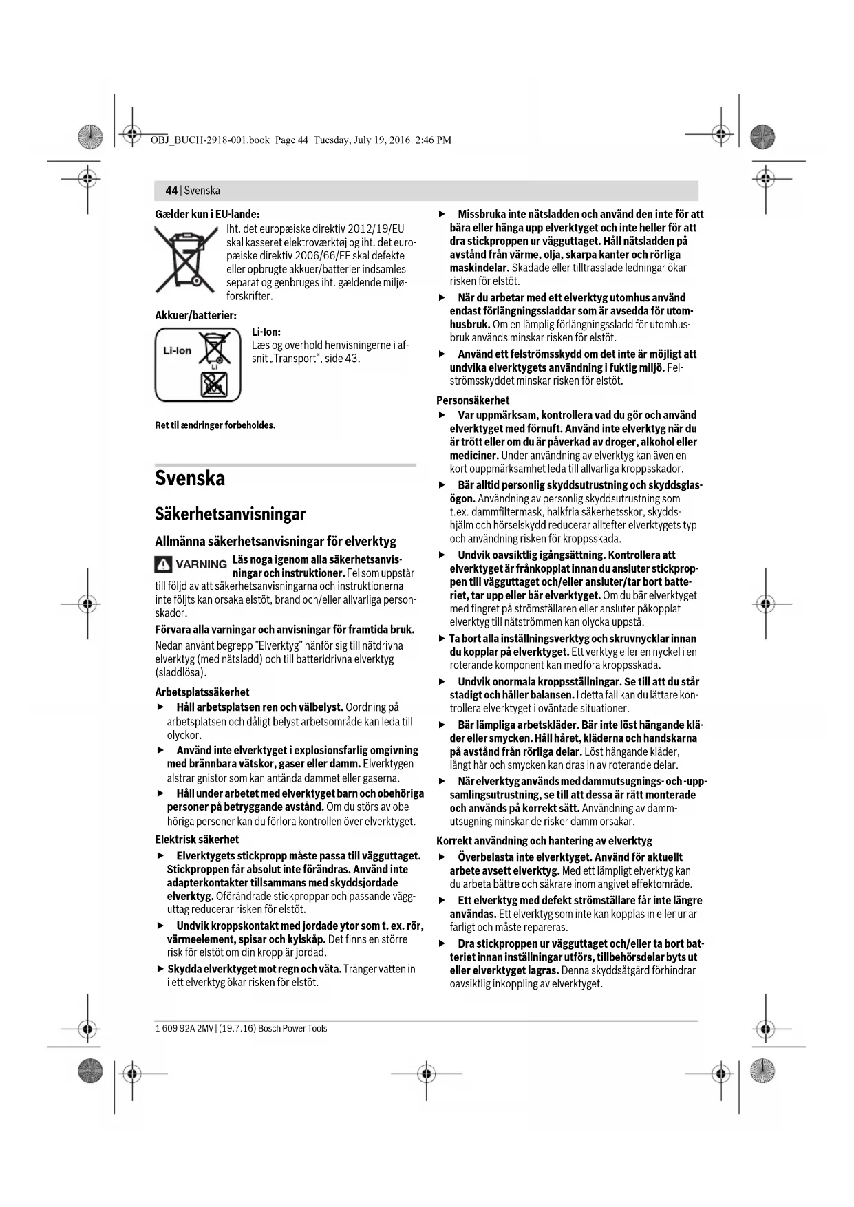 OBJ_BUCH-2918-001.book Page 43 Tuesday, July 19, 2016 2:46 PM44 | Svenska 1 609 92A 2MV | (19.7.16) Bosch Power Tools Gælder kun i EU-lande: Iht. det europæiske direktiv 2012/19/EU skal kasseret elektroværktøj og iht. det euro- pæiske direktiv 2006/66/EF skal defekte eller opbrugte akkuer/batterier indsamles separat og genbruges iht. gældende miljø- forskrifter. Akkuer/batterier: Li-Ion: Læs og overhold henvisningerne i af- snit „Transport“, side 43. Ret til ændringer forbeholdes. Svenska Säkerhetsanvisningar Allmänna säkerhetsanvisningar för elverktyg Läs noga igenom alla säkerhetsanvis- ningar och instruktioner. Fel som uppstår till följd av att säkerhetsanvisningarna och instruktionerna inte följts kan orsaka elstöt, brand och/eller allvarliga person- skador. Förvara alla varningar och anvisningar för framtida bruk. Nedan använt begrepp ”Elverktyg” hänför sig till nätdrivna elverktyg (med nätsladd) och till batteridrivna elverktyg (sladdlösa). Arbetsplatssäkerhet Håll arbetsplatsen ren och välbelyst. Oordning på arbetsplatsen och dåligt belyst arbetsområde kan leda till olyckor. Använd inte elverktyget i explosionsfarlig omgivning med brännbara vätskor, gaser eller damm. Elverktygen alstrar gnistor som kan antända dammet eller gaserna. Håll under arbetet med elverktyget barn och obehöriga personer på betryggande avstånd. Om du störs av obe- höriga personer kan du förlora kontrollen över elverktyget. Elektrisk säkerhet Elverktygets stickpropp måste passa till vägguttaget. Stickproppen får absolut inte förändras. Använd inte adapterkontakter tillsammans med skyddsjordade elverktyg. Oförändrade stickproppar och passande vägg- uttag reducerar risken för elstöt. Undvik kroppskontakt med jordade ytor som t. ex. rör, värmeelement, spisar och kylskåp. Det finns en större risk för elstöt om din kropp är jordad. Skydda elverktyget mot regn och väta. Tränger vatten in i ett elverktyg ökar risken för elstöt. Missbruka inte nätsladden och använd den inte för att bära eller hänga upp elverktyget och inte heller för att dra stickproppen ur vägguttaget. Håll nätsladden på avstånd från värme, olja, skarpa kanter och rörliga maskindelar. Skadade eller tilltrasslade ledningar ökar risken för elstöt. När du arbetar med ett elverktyg utomhus använd endast förlängningssladdar som är avsedda för utom- husbruk. Om en lämplig förlängningssladd för utomhus- bruk används minskar risken för elstöt. Använd ett felströmsskydd om det inte är möjligt att undvika elverktygets användning i fuktig miljö. Fel- strömsskyddet minskar risken för elstöt. Personsäkerhet Var uppmärksam, kontrollera vad du gör och använd elverktyget med förnuft. Använd inte elverktyg när du är trött eller om du är påverkad av droger, alkohol eller mediciner. Under användning av elverktyg kan även en kort ouppmärksamhet leda till allvarliga kroppsskador. Bär alltid personlig skyddsutrustning och skyddsglas- ögon. Användning av personlig skyddsutrustning som t.ex. dammfiltermask, halkfria säkerhetsskor, skydds- hjälm och hörselskydd reducerar alltefter elverktygets typ och användning risken för kroppsskada. Undvik oavsiktlig igångsättning. Kontrollera att elverktyget är frånkopplat innan du ansluter stickprop- pen till vägguttaget och/eller ansluter/tar bort batte- riet, tar upp eller bär elverktyget. Om du bär elverktyget med fingret på strömställaren eller ansluter påkopplat elverktyg till nätströmmen kan olycka uppstå. Ta bort alla inställningsverktyg och skruvnycklar innan du kopplar på elverktyget. Ett verktyg eller en nyckel i en roterande komponent kan medföra kroppsskada. Undvik onormala kroppsställningar. Se till att du står stadigt och håller balansen. I detta fall kan du lättare kon- trollera elverktyget i oväntade situationer. Bär lämpliga arbetskläder. Bär inte löst hängande klä- der eller smycken. Håll håret, kläderna och handskarna på avstånd från rörliga delar. Löst hängande kläder, långt hår och smycken kan dras in av roterande delar. När elverktyg används med dammutsugnings- och -upp- samlingsutrustning, se till att dessa är rätt monterade och används på korrekt sätt. Användning av damm- utsugning minskar de risker damm orsakar. Korrekt användning och hantering av elverktyg Överbelasta inte elverktyget. Använd för aktuellt arbete avsett elverktyg. Med ett lämpligt elverktyg kan du arbeta bättre och säkrare inom angivet effektområde. Ett elverktyg med defekt strömställare får inte längre användas. Ett elverktyg som inte kan kopplas in eller ur är farligt och måste repareras. Dra stickproppen ur vägguttaget och/eller ta bort bat- teriet innan inställningar utförs, tillbehörsdelar byts ut eller elverktyget lagras. Denna skyddsåtgärd förhindrar oavsiktlig inkoppling av elverktyget. VARNING OBJ_BUCH-2918-001.book Page 44 Tuesday, July 19, 2016 2:46 PMSvenska | 45 Bosch Power Tools 1 609 92A 2MV | (19.7.16) Förvara elverktygen oåtkomliga för barn. Låt elverkty- get inte användas av personer som inte är förtrogna med dess användning eller inte läst denna anvisning. Elverktygen är farliga om de används av oerfarna personer. Sköt elverktyget omsorgsfullt. Kontrollera att rörliga komponenter fungerar felfritt och inte kärvar, att kom- ponenter inte brustit eller skadats; orsaker som kan leda till att elverktygets funktioner påverkas menligt. Låt skadade delar repareras innan elverktyget tas i bruk. Många olyckor orsakas av dåligt skötta elverktyg. Håll skärverktygen skarpa och rena. Omsorgsfullt skötta skärverktyg med skarpa eggar kommer inte så lätt i kläm och går lättare att styra. Använd elverktyget, tillbehör, insatsverktyg osv. enligt dessa anvisningar. Ta hänsyn till arbetsvillkoren och arbetsmomenten. Om elverktyget används på ett sätt som det inte är avsett för kan farliga situationer upp