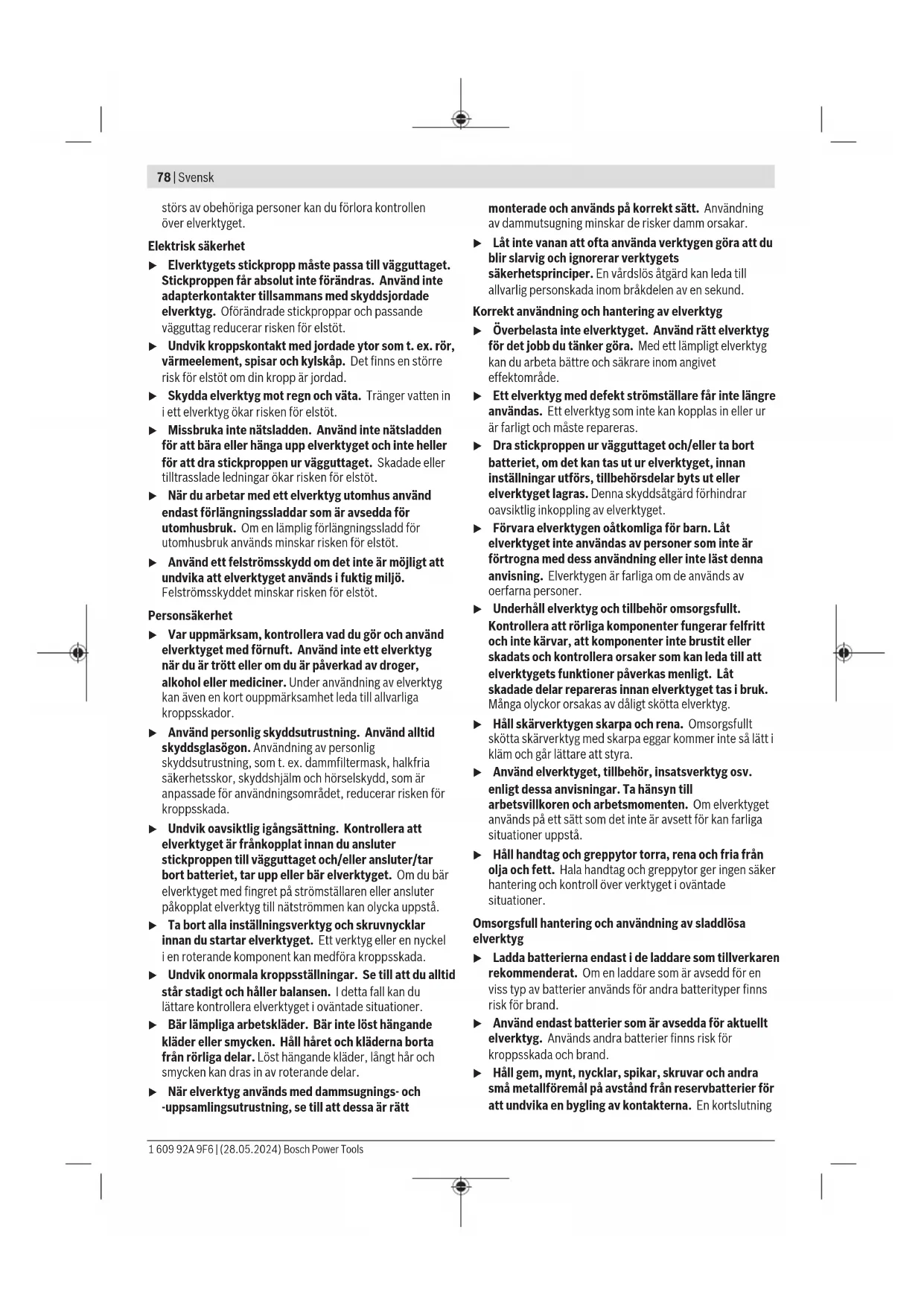 Den vibrationsnivå och det bullervärde som anges i dessa anvisningar har uppmätts enligt en mätmetod som normerats och kan användas för att jämföra elverktyg med Bosch Power Tools 1 609 92A 9F6 | (28.05.2024)82 | Svensk varandra. Mätmetoden är även lämplig för preliminär bedömning av vibrations- och bullernivån. Den angivna vibrations- och bullernivån representerar den huvudsakliga användningen av elverktyget. Om däremot elverktyget används för andra ändamål, med andra insatsverktyg eller inte underhållits ordentligt kan vibrations- och bullernivån avvika. Då kan vibrations- och bullernivån under arbetsperioden öka betydligt under hela arbetstiden. För en exakt bedömning av vibrations- och bullernivån bör även de tider beaktas när elverktyget är avstängt eller är igång, men inte används. Detta reducerar vibrations- och bullerbelastningen för den totala arbetsperioden betydligt. Bestäm extra säkerhetsåtgärder för att skydda operatören mot vibrationernas inverkan t.ex.: underhåll av elverktyget och insatsverktygen, att hålla händerna varma, organisation av arbetsförloppen. Batteri Bosch säljer batteridrivna elverktyg även utan batteri. Om det ingår ett batteri i leveransen av ditt elverktyg kan du se på förpackningen. Ladda batteriet u Använd endast de laddare som anges i tekniska data. Endast denna typ av laddare är anpassad till det litium- jonbatteri som används i elverktyget. Observera: litiumjonbatterier levereras delvis laddade enligt internationella transportföreskrifter. För full effekt ska batteriet laddas helt innan första användningen. Sätta in batteriet Skjut in det laddade batteriet i batterihållaren tills det sitter fast. Borttagning av batteri För att ta ut batteriet, tryck på upplåsningsknappen och dra ut batteriet. Bruka inte våld. Batteriet är försedd med två låssteg som hindrar ackumulatorn från att falla ut om dess upplåsningsknappfaller ut. När batteriet är insatt i elverktyget hålls det med en fjäder i rätt läge. Indikering batteristatus De tre gröna LED-lamporna på indikeringen för batteristatus visar batteriets laddningsnivå. Av säkerhetsskäl kan man endast kontrollera batteristatus när elverktyget är stilla. Tryck på knappen för indikering av batteristatus eller , för att visa batteriets laddningsnivå. Detta är möjligt även då batteriet är uttaget. Om ingen LED-lampa lyser efter ett tryck på knappen för batteristatus är batteriet defekt och måste bytas ut. Batterityp GBA 18V... LED Kapacitet Fast ljus 3× grönt 60–100% Fast ljus 2× grönt 30–60% Fast ljus 1× grönt 5–30% Blinkande ljus 1× grönt 0–5% Batterityp ProCORE18V... LED Kapacitet Fast ljus 5× grönt 80–100% Fast ljus 4× grönt 60–80% Fast ljus 3× grönt 40–60% Fast ljus 2× grönt 20–40% Fast ljus 1× grönt 5–20% Blinkande ljus 1× grönt 0–5% Anvisningar för korrekt hantering av batterimodulen Skydda batterimodulen mot fukt och vatten. Batteriet får endast lagras inom ett temperaturområde mellan –20 °C till 50 °C. Låt därför inte batterimodulen t. ex. på sommaren ligga kvar i bilen. Rengör vid tillfälle batterimodulens ventilationsöppningar med en mjuk, ren och torr pensel. Är brukstiden efter uppladdning onormalt kort tyder det på att batterierna är förbrukade och måste bytas mot nya. Beakta anvisningarna för avfallshantering. Montage u Använd endast sågklingor som motsvarar de specifikationer som anges i instruktionsboken och som motsvarar specifikationerna i EN847‑1 och som märkts i enlighet med detta. Sätt i/byta ut cirkelsågklinga u Ta ut batteriet ur elverktyget innan alla arbeten på det (t.ex.underhåll, verktygsbyte, osv.). Om strömbrytaren oavsiktligt påverkas finns risk för personskada. u Använd skyddshandskar vid montering av sågklingan. Om sågklingan berörs finns risk för personskada. u Använd endast sågklingor som motsvarar de specifikationer som anges i instruktionsboken och som motsvarar specifikationerna i EN847‑1 och som märkts i enlighet med detta. 1 609 92A 9F6 | (28.05.2024) Bosch Power ToolsSvensk | 83 u Insatsverktygets tillåtna varvtal måste minst vara lika med det maximala varvtalet som anges på elverktyget. Tillbehör med en högre rotationshastighet kan brista och slungas ut. u Använd aldrig sliprondeller som tillsatsverktyg. Välja sågblad En översikt över rekommenderade sågblad hittar du i slutet av denna bruksanvisning. Demontera sågblad (se bild A) Lägg elverktyget på frontsidan av motorkåpan vid verktygsbyte. – Tryck på spindellåsknappen (5) och håll den intryckt. u Aktivera endast spindellåsknappen (5) när sågspindeln står stilla. I annat fall kan elverktyget skadas. – Använd insexnyckeln (3) och skruva ut spännskruven (25) i vridriktningen ➊. – Sväng tillbaka pendelskyddskåpan (13) och håll fast den. – Ta av spännflänsen (24) och sågbladet (23) från sågspindeln (21). Montera sågbladet (se bild A) Lägg elverktyget på frontsidan av motorkåpan vid verktygsbyte. – Rengör sågbladet (23) och alla spänndelar som ska monteras. – Sväng tillbaka pendelskyddskåpan (13) och håll fast den. – Sätt sågbladet (23) på fästflänsen (22). Tändernas sågriktning (pilens riktning på sågbladet) och rotationsriktningspilen på pendelskyddskåpan (13) ska stämma överens. – Sätt på spännflänsen (24) och skruva in spännskruven (25) i rotationsriktningen ➋. Se till att fästflänsen (22) och spännflänsen (24) är monterade i rätt position. – Tryck på spindellåsknappen (5) och håll den intryckt. – Använd insexnyckeln (3) för att dra åt spännskruven (25) i rotationsriktningen ➋. Åtdragningsmomentet ska vara 6–9Nm, det, motsvarar åtdragning för hand plus ¼ varv. Damm-/spånutsugning Dammet från material som t.ex. blyhaltig målning, vissa träslag, mineraler och metall kan vara hälsovådligt. Beröring eller inandning av dammet kan orsaka a