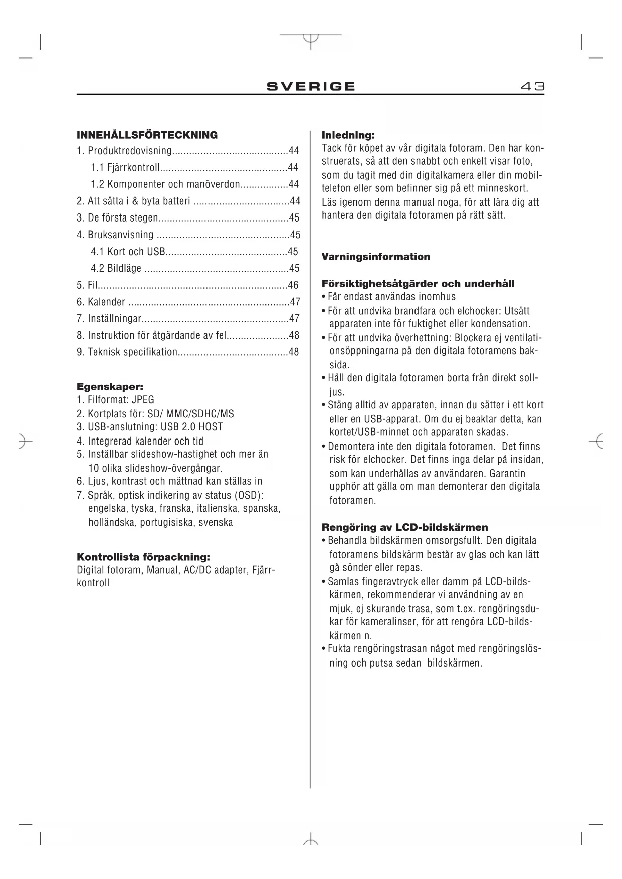 engelska, tyska, franska, italienska, spanska, holländska, portugisiska, svenska Kontrollista förpackning: Digital fotoram, Manual, AC/DC adapter, Fjärr- kontroll Inledning: Tack för köpet av vår digitala fotoram. Den har kon- struerats, så att den snabbt och enkelt visar foto, som du tagit med din digitalkamera eller din mobil- telefon eller som befinner sig på ett minneskort. Läs igenom denna manual noga, för att lära dig att hantera den digitala fotoramen på rätt sätt. Varningsinformation Försiktighetsåtgärder och underhåll
