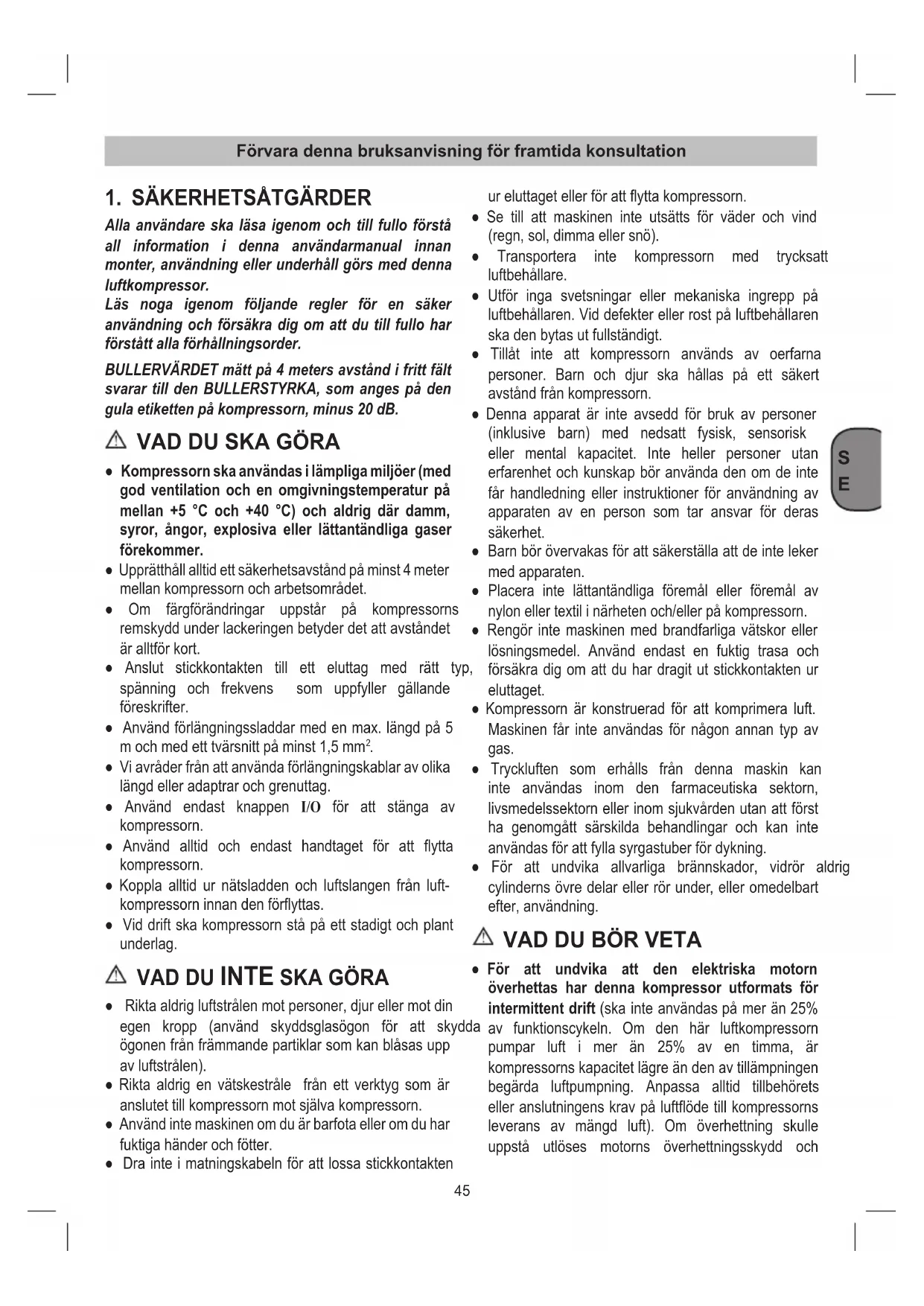 Alla användare ska läsa igenom och till fullo förstå all information i denna användarmanual innan monter, användning eller underhåll görs med denna luftkompressor. Läs noga igenom följande regler för en säker användning och försäkra dig om att du till fullo har förstått alla förhållningsorder. BULLERVÄRDET mätt på 4 meters avstånd i fritt fält svarar till den BULLERSTYRKA, som anges på den gula etiketten på kompressorn, minus 20 dB.